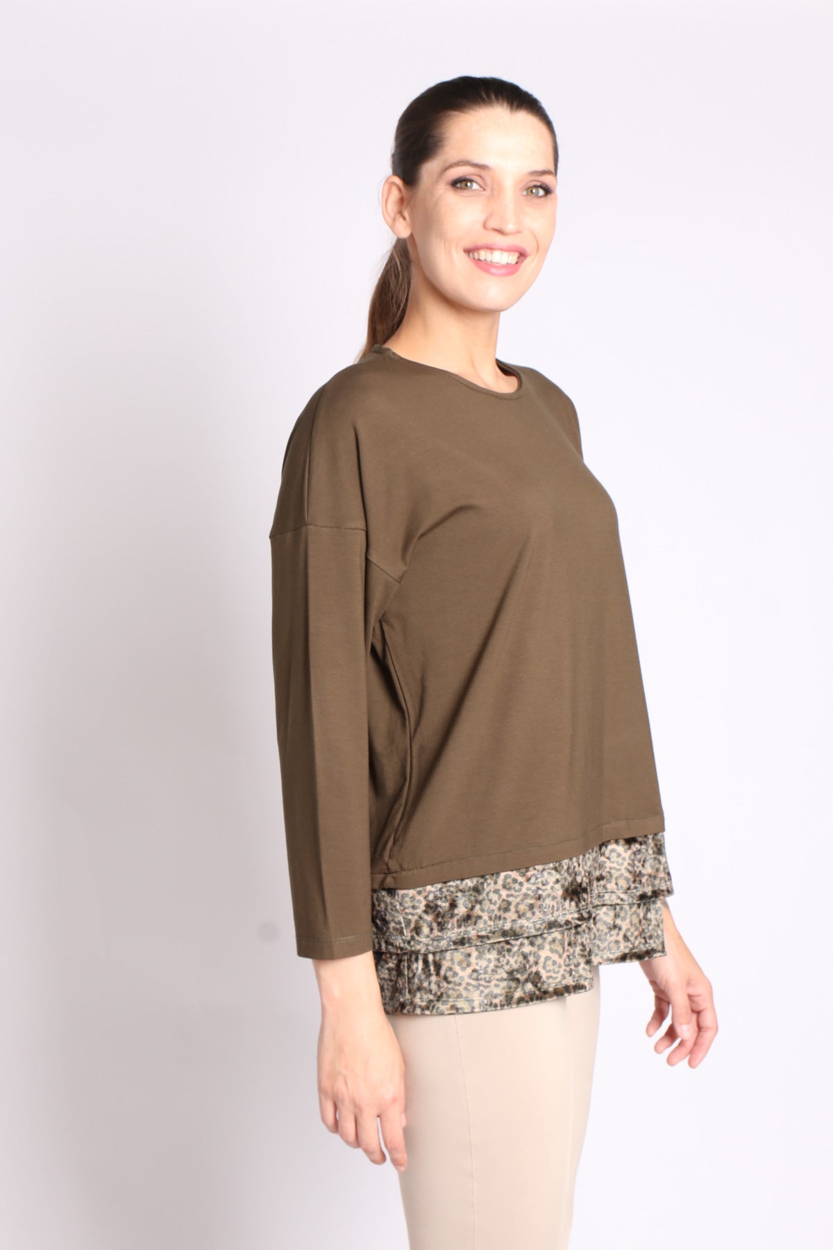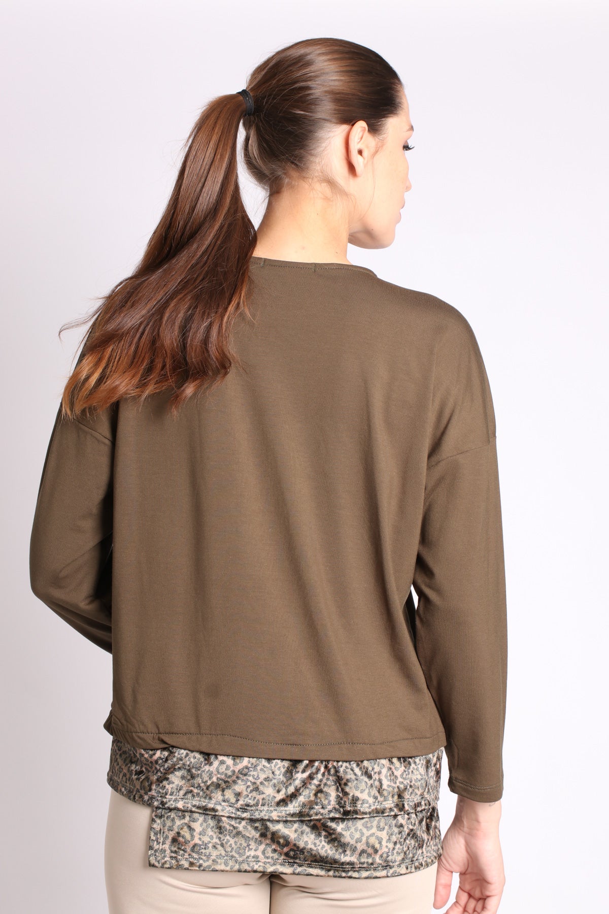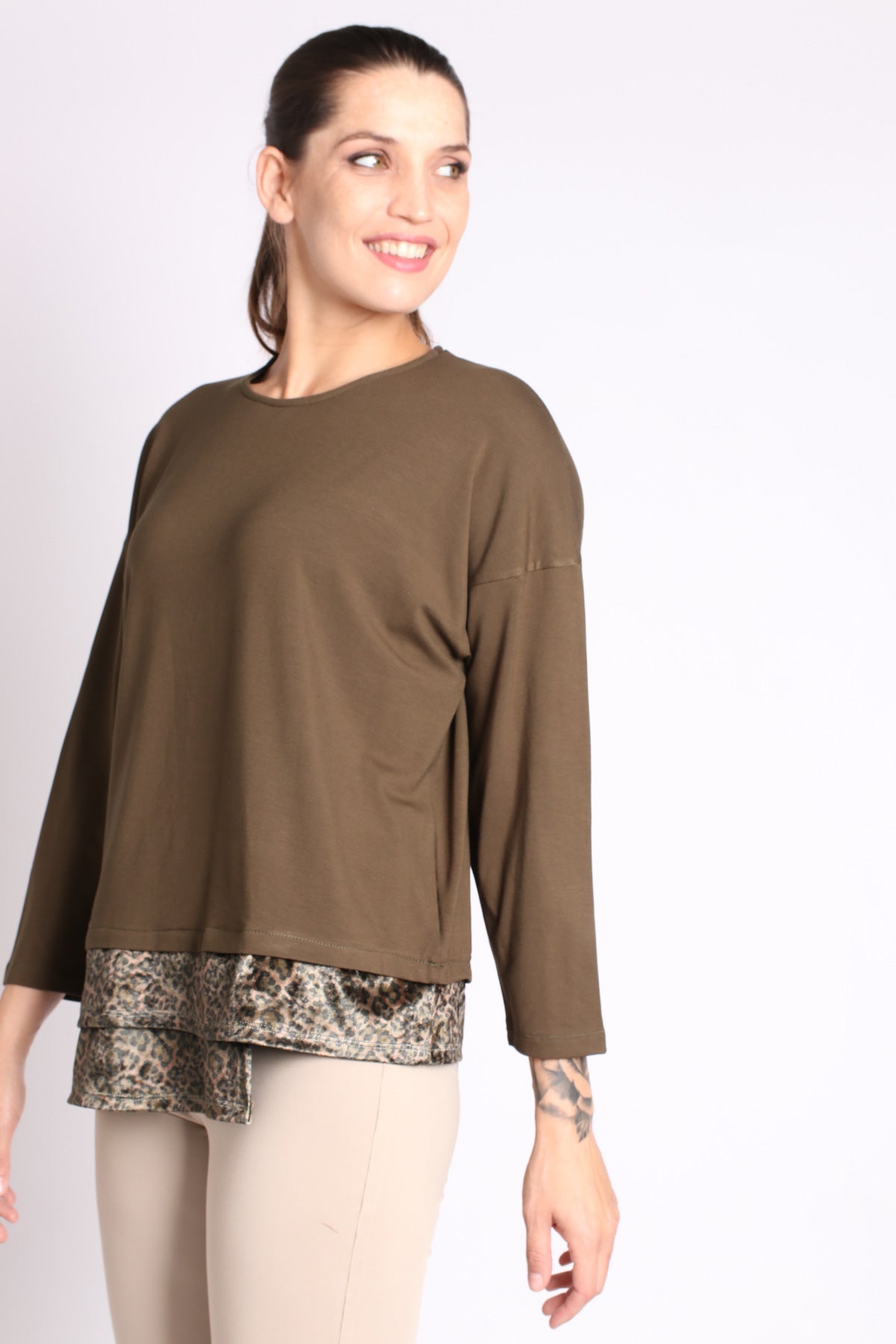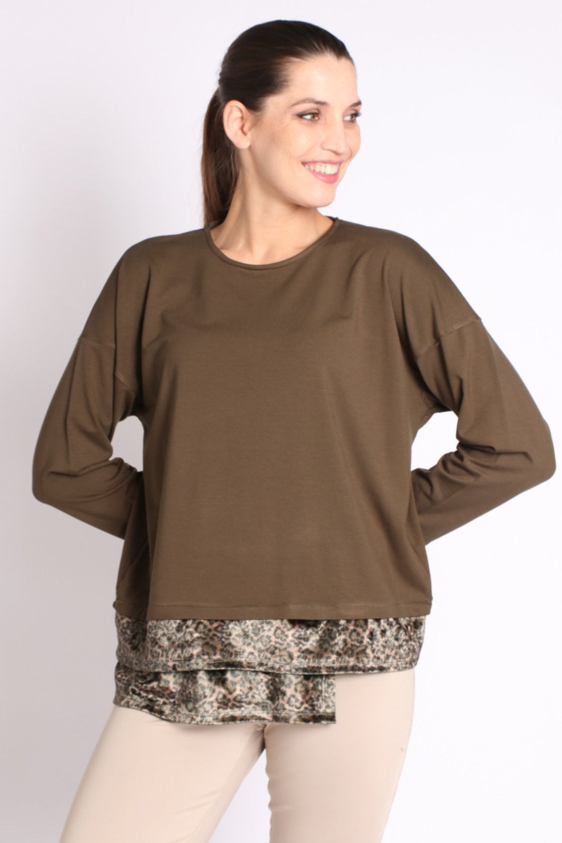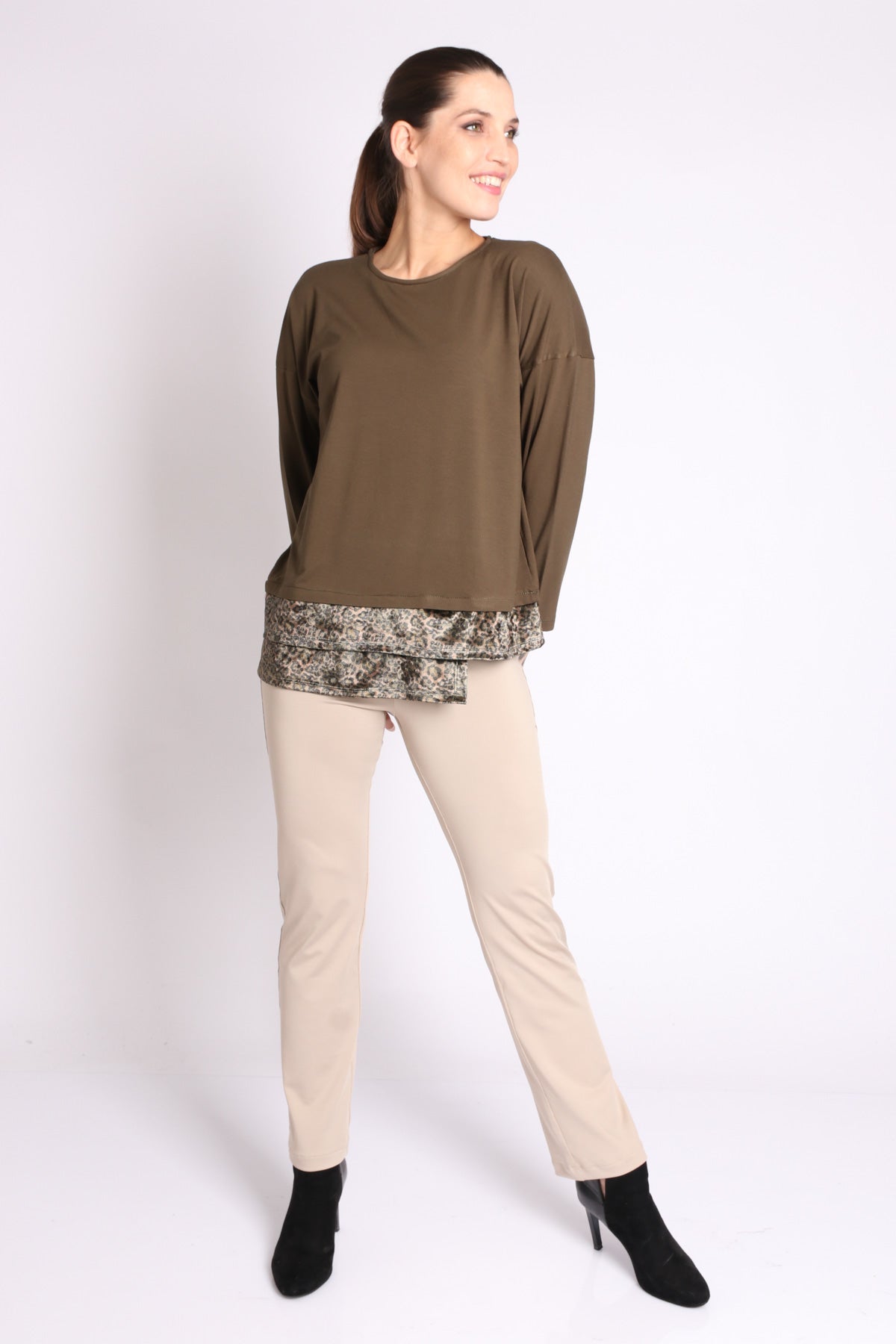 - חולצה בגזרת אובר-סייז בשילוב בד חלק ובד מודפס, בסיומת א-סימטרית