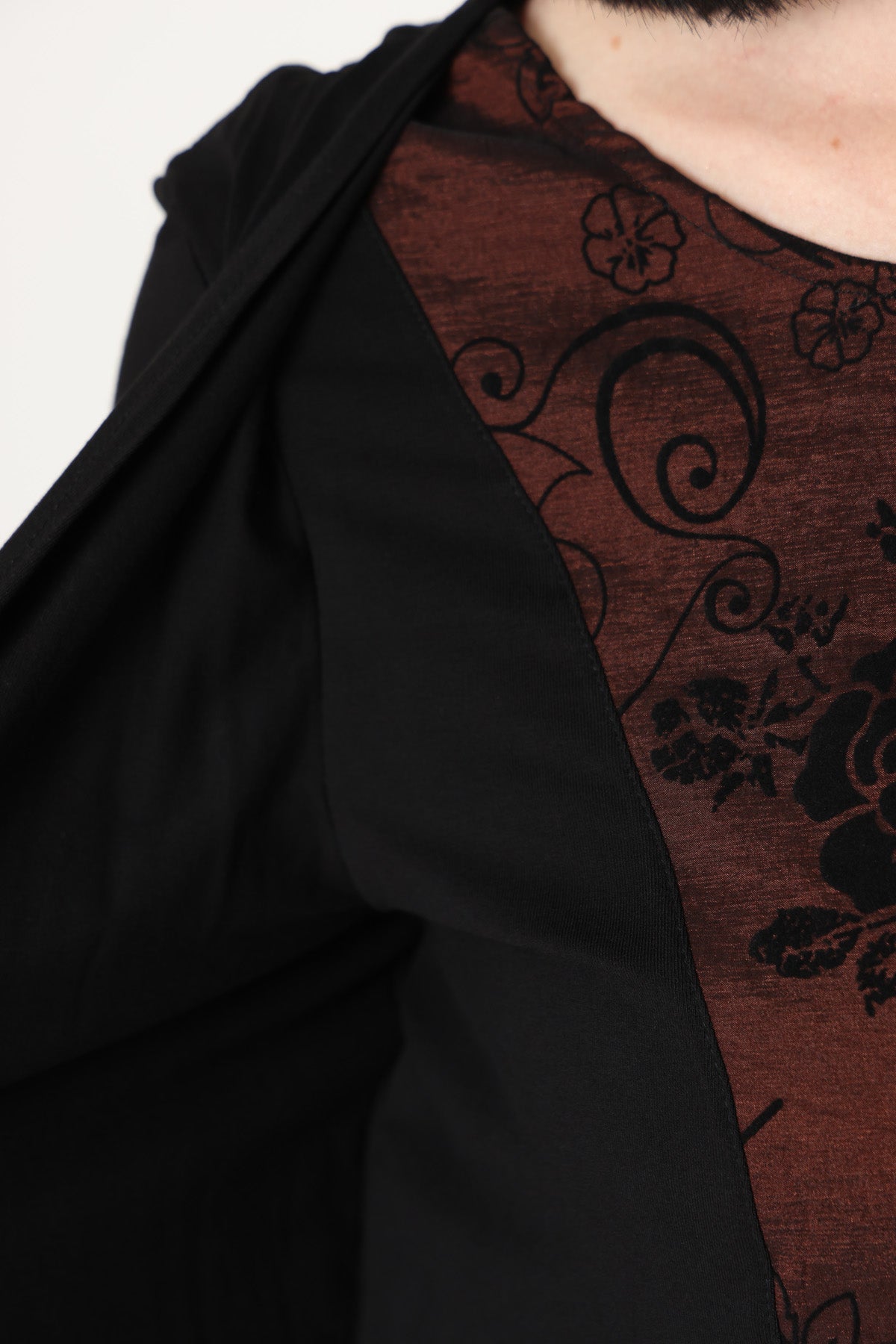 - חולצה מבד מודפס במראה מבריק, המחוברת לעליונית.
