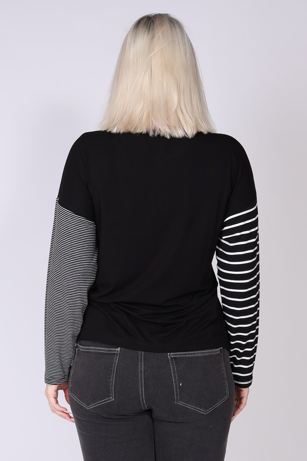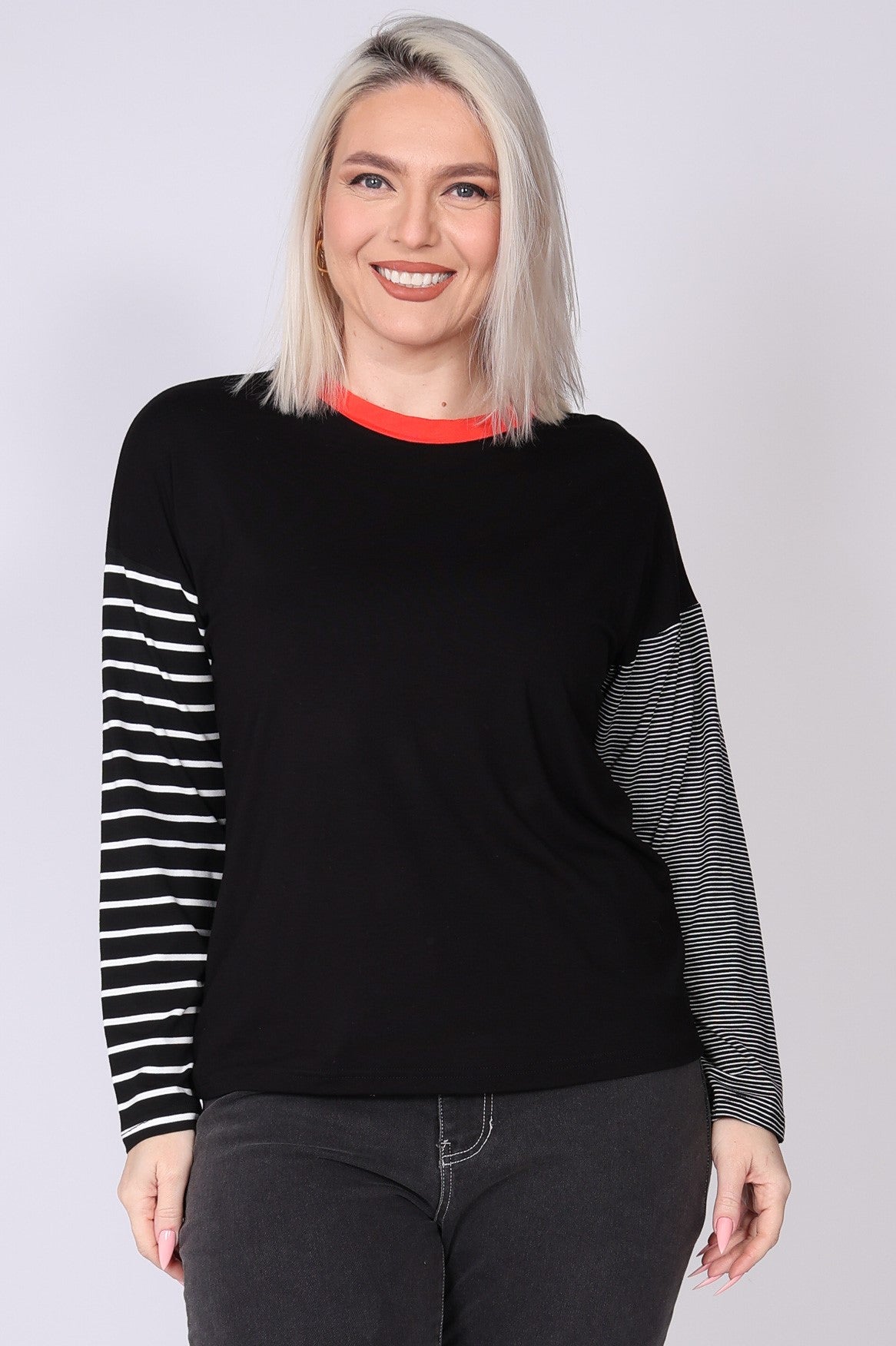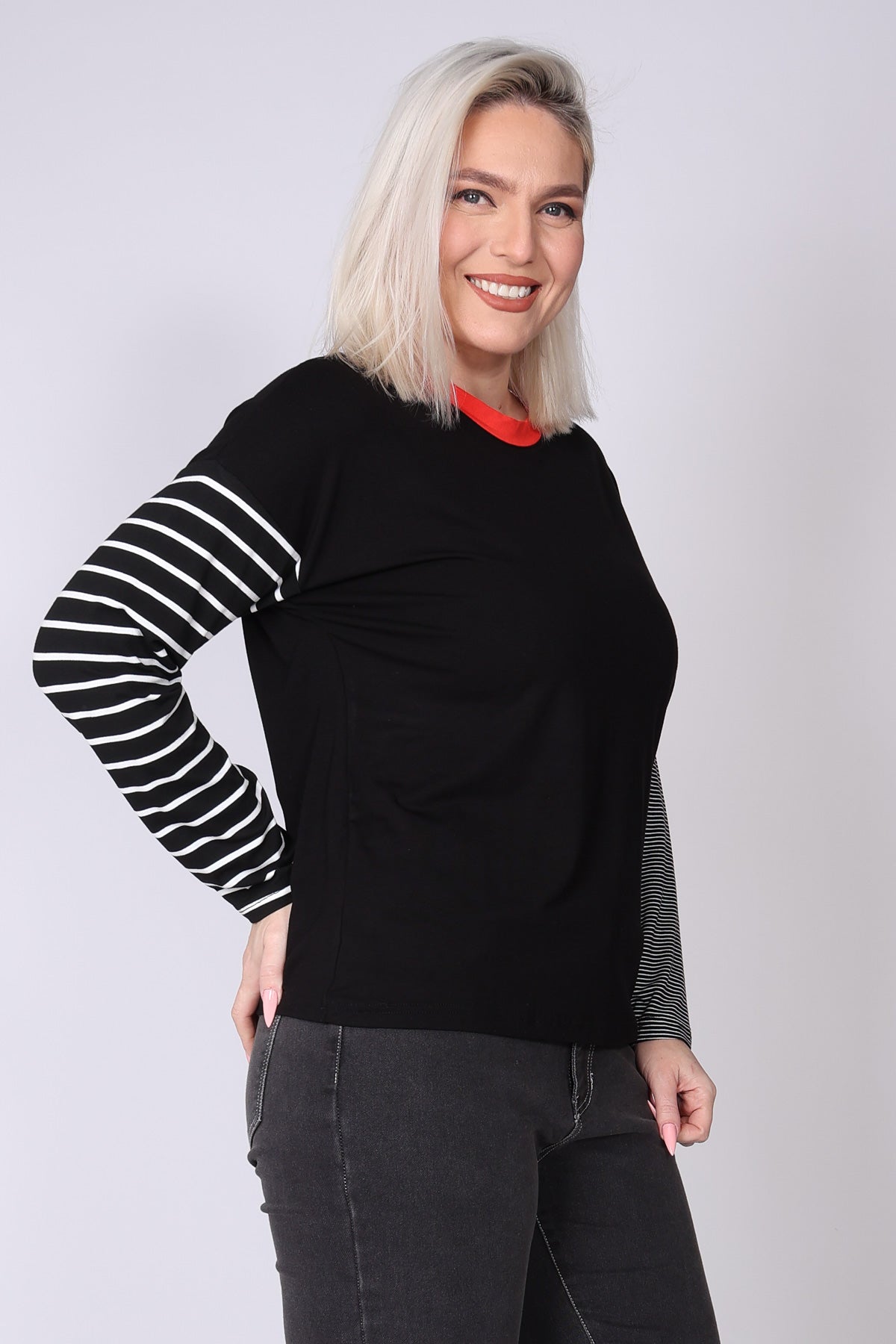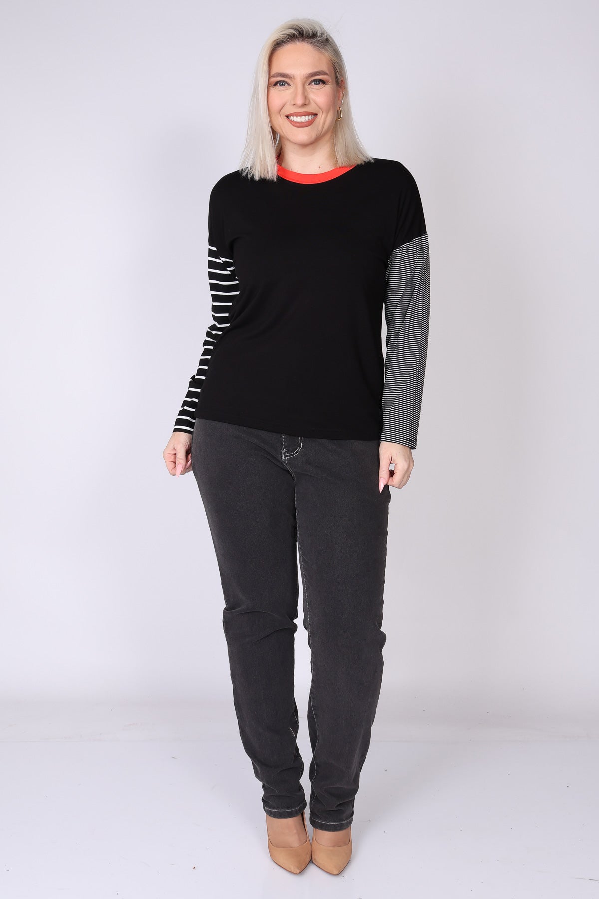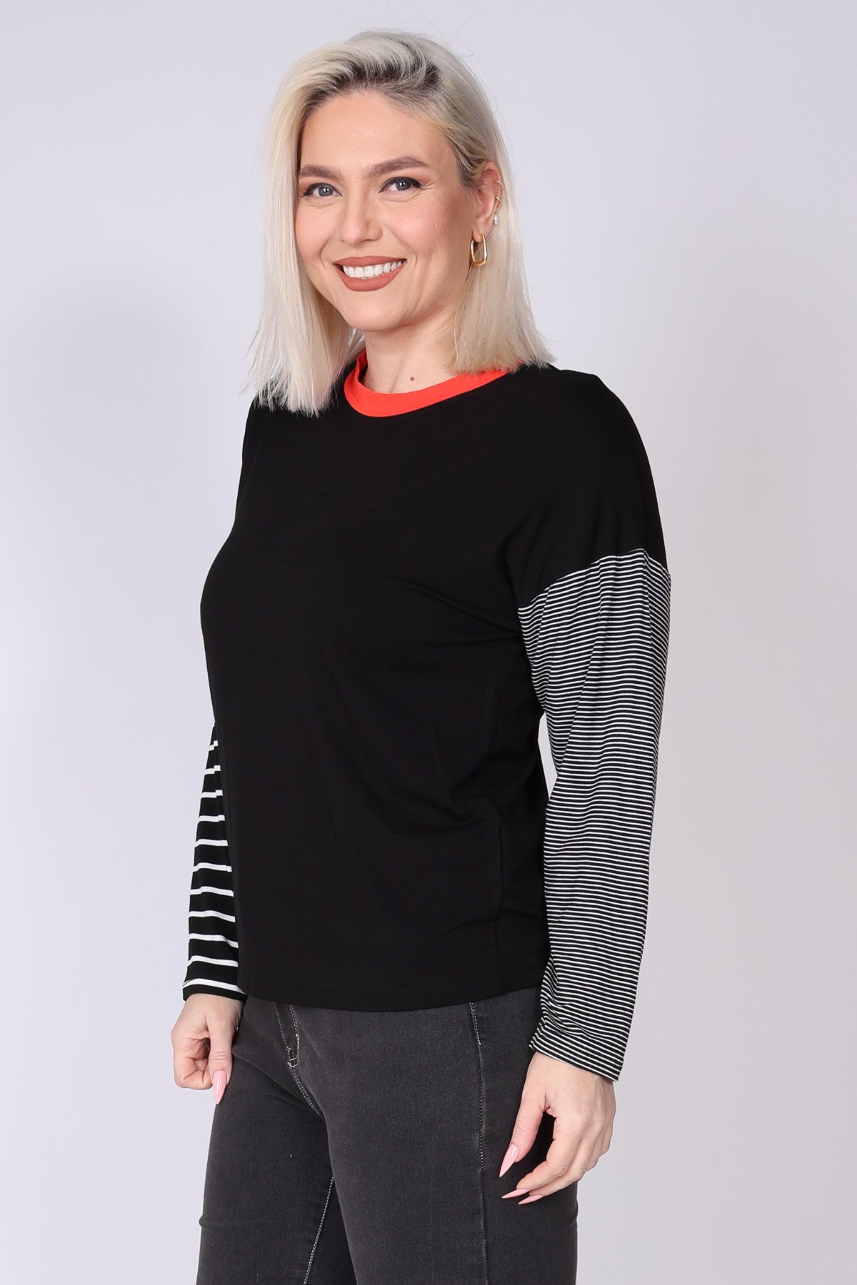 חולצה בגזרה משוחררת מבד שחור חלק, עם משחק טקסטורות ייחודי בשרוולים: שרוול אחד מבד פסים דק ושרוול שני מבד פסים עבה, ליצירת עניין עדין ולא מתאמץ. מפתח צוואר עגול בצבע אדום בוהק מוסיף נגיעה מדויקת של צבע ומדגיש את העיצוב המוקפד. הבד רך ונעים למגע, מעניק נוחות גבוהה ומתאים ללבישה יומיומית.