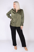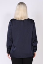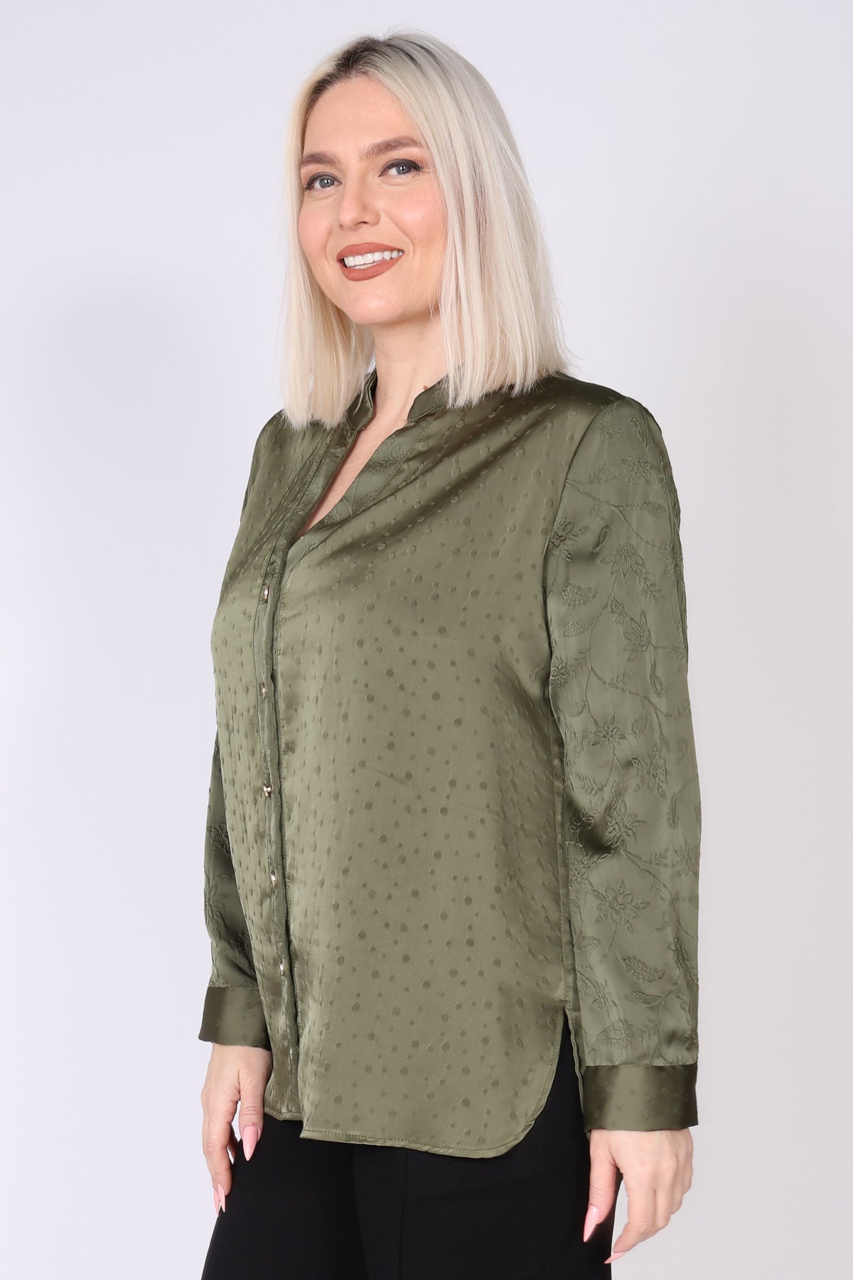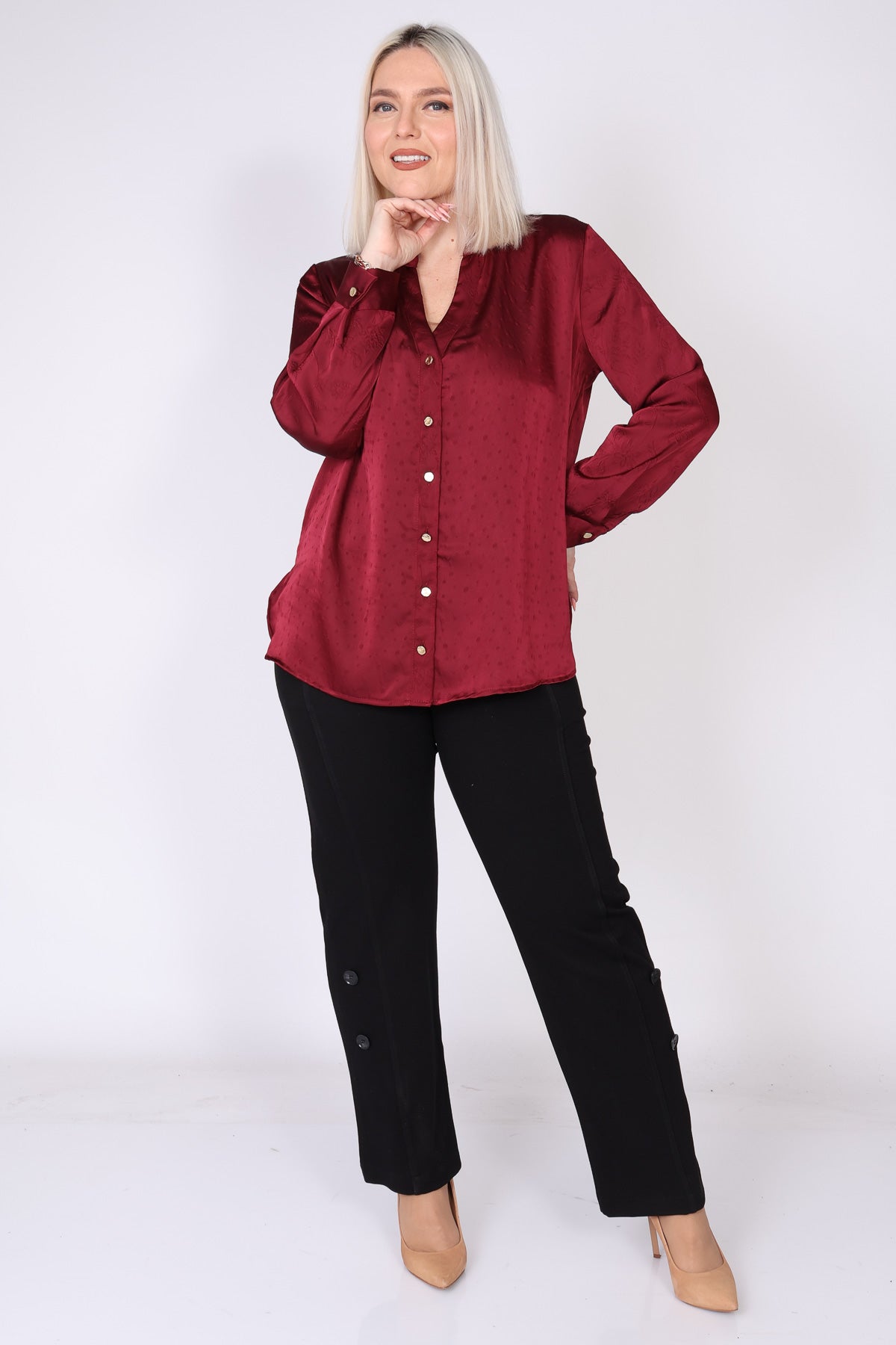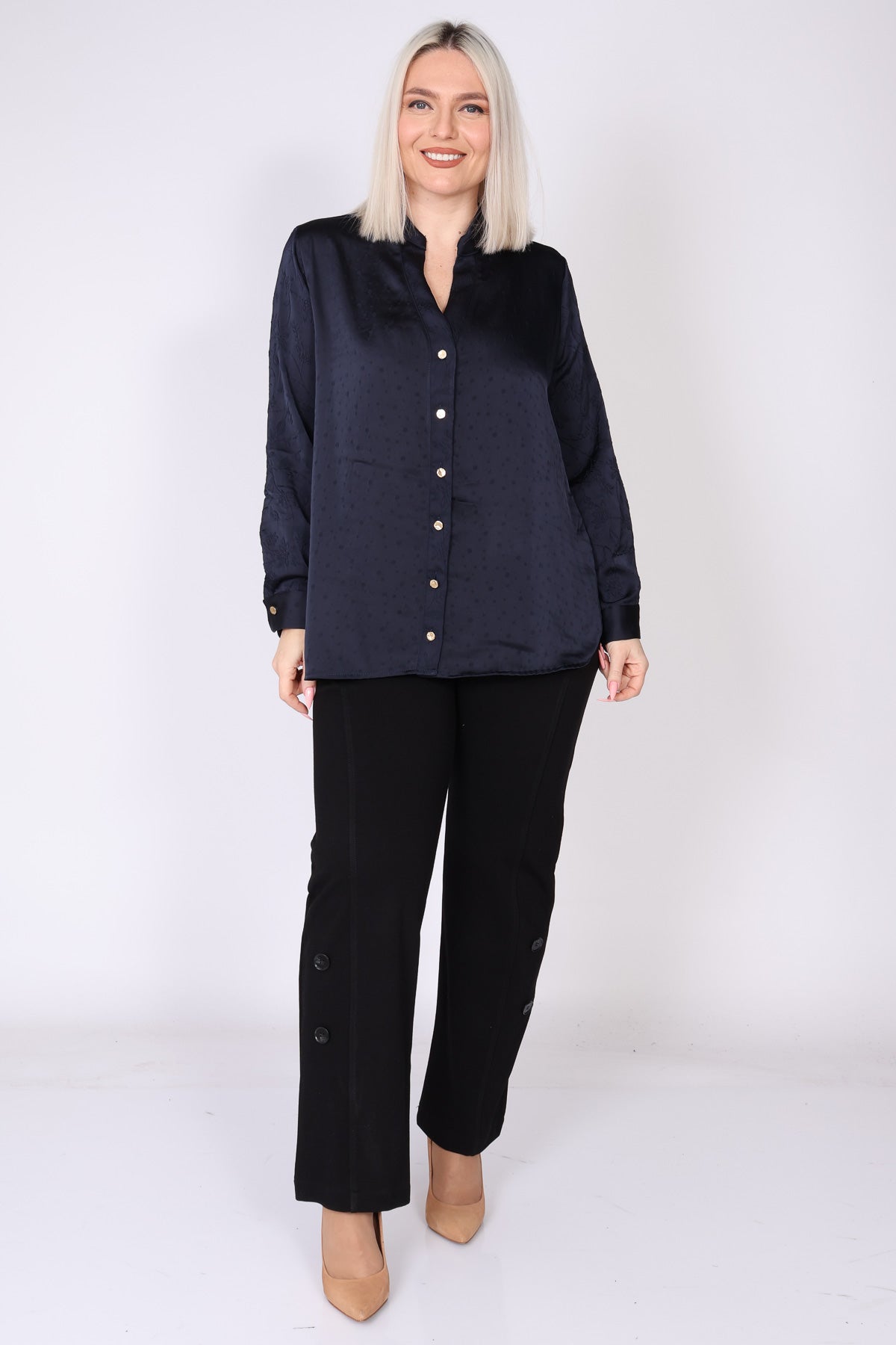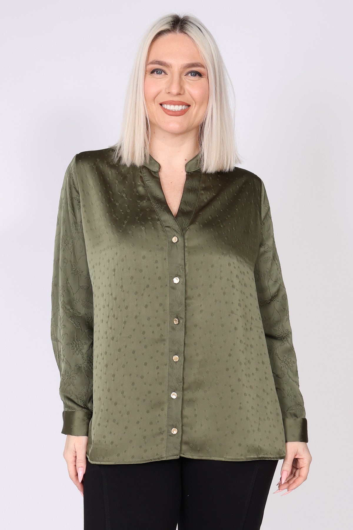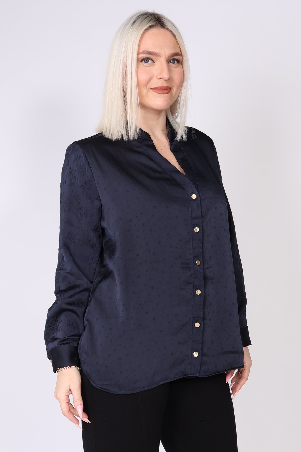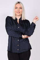 חולצת סאטן מכופתרת בצבע אחיד, עם שילוב טקסטורות עדין שמעניק עומק ומראה יוקרתי. החולצה מתאפיינת בקו נקי ואלגנטי, מפתח צוואר וי מחמיא וכפתורי זהב לאורך החולצה ובמנג'ט לסיומת, שמוסיפים נגיעה של יוקרה ועידון.