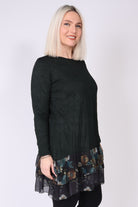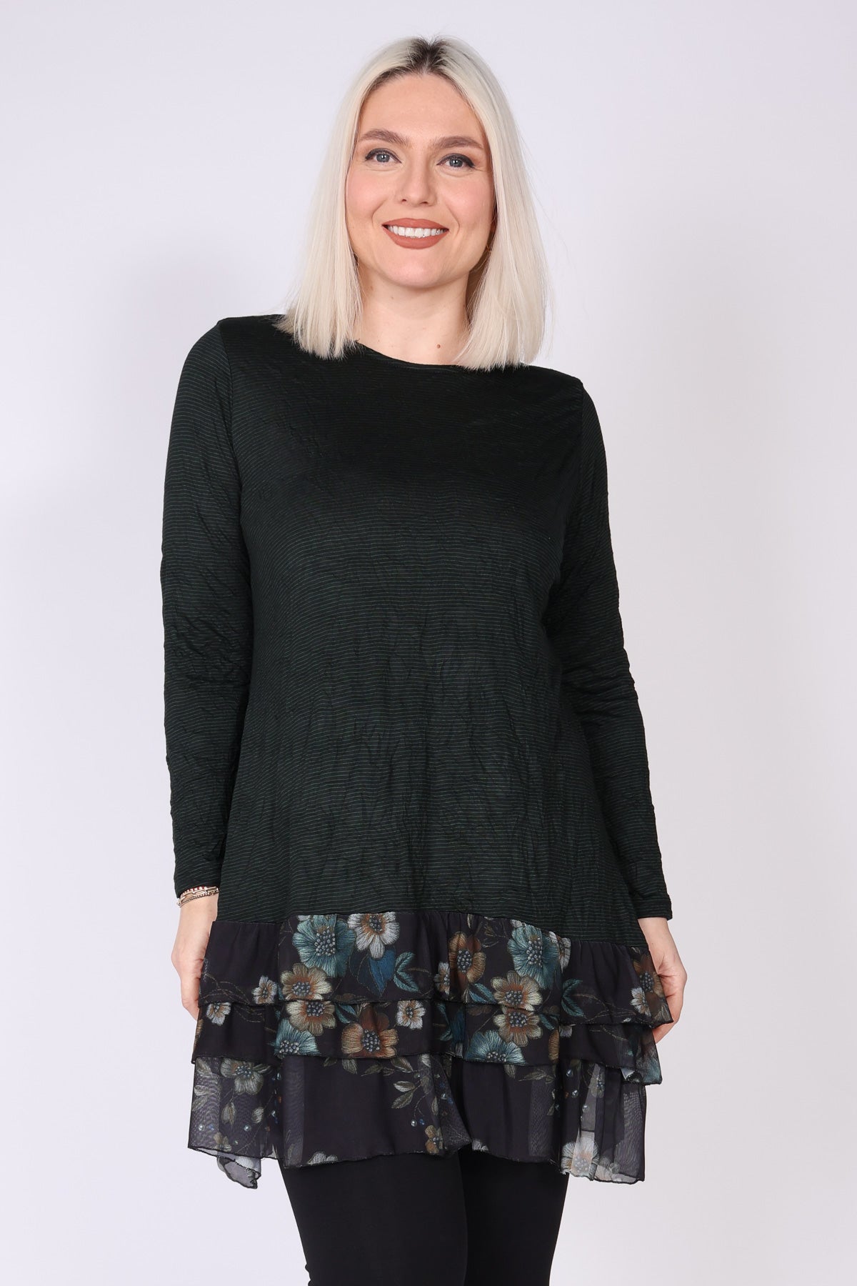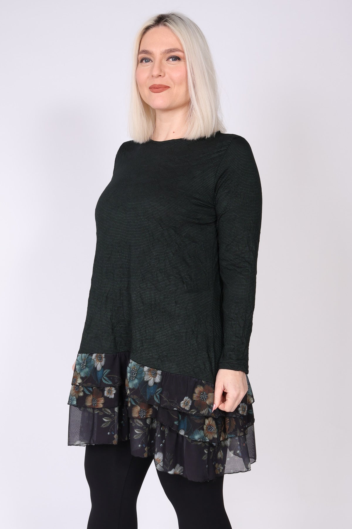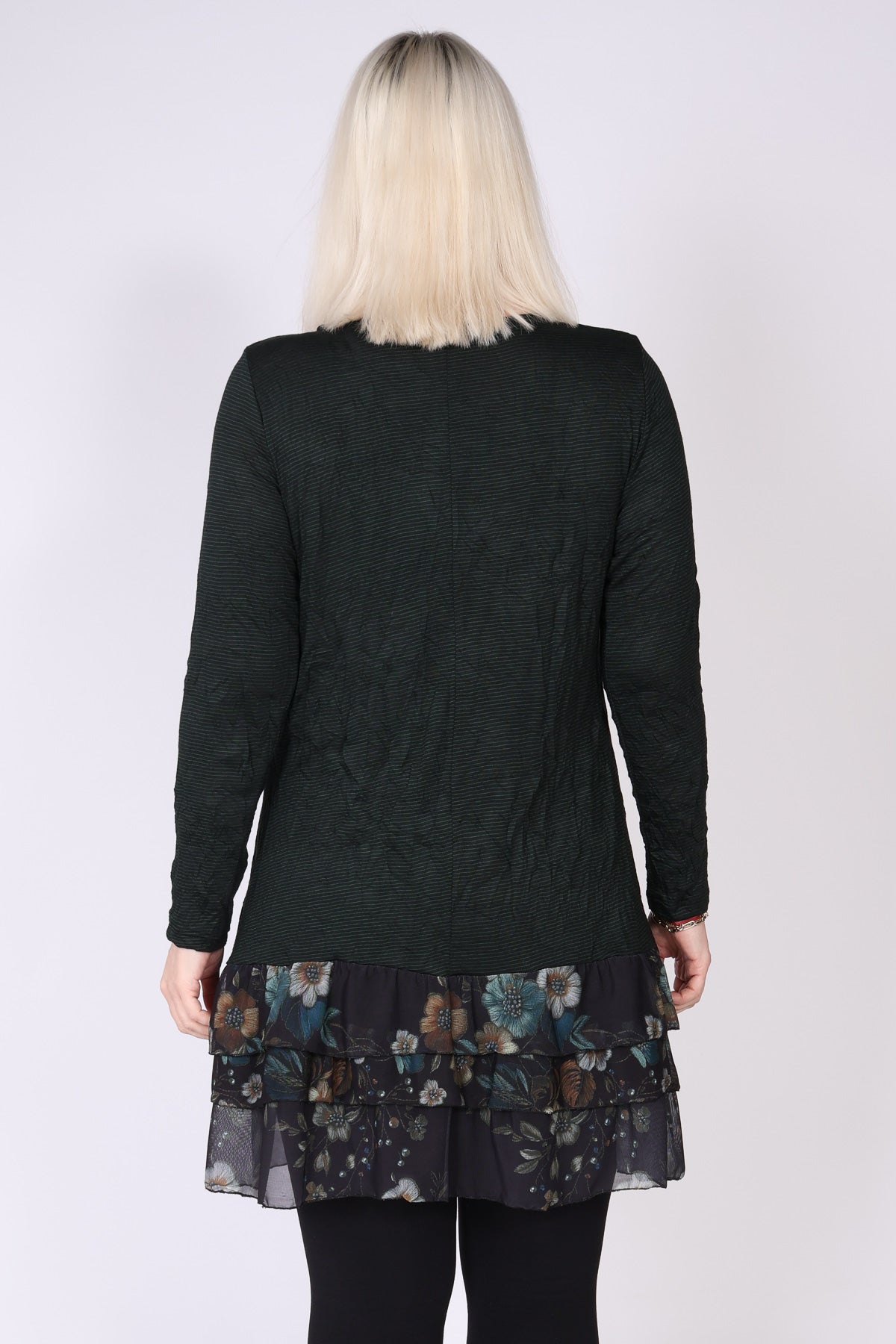 טוניקה מבד בדפוס פסים דקים, עם סיומת וולן מבד שיפון פרחוני שמוסיפה תנועה ורכות. מפתח צוואר עגול ושרוולים ארוכים, בשילוב מדויק בין בד אטום לשקיפות עדינה ליצירת מראה מאוזן ומעניין.