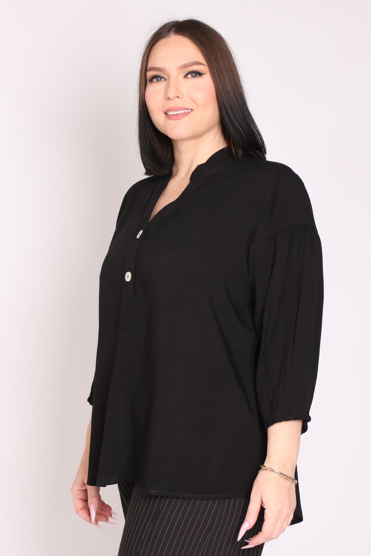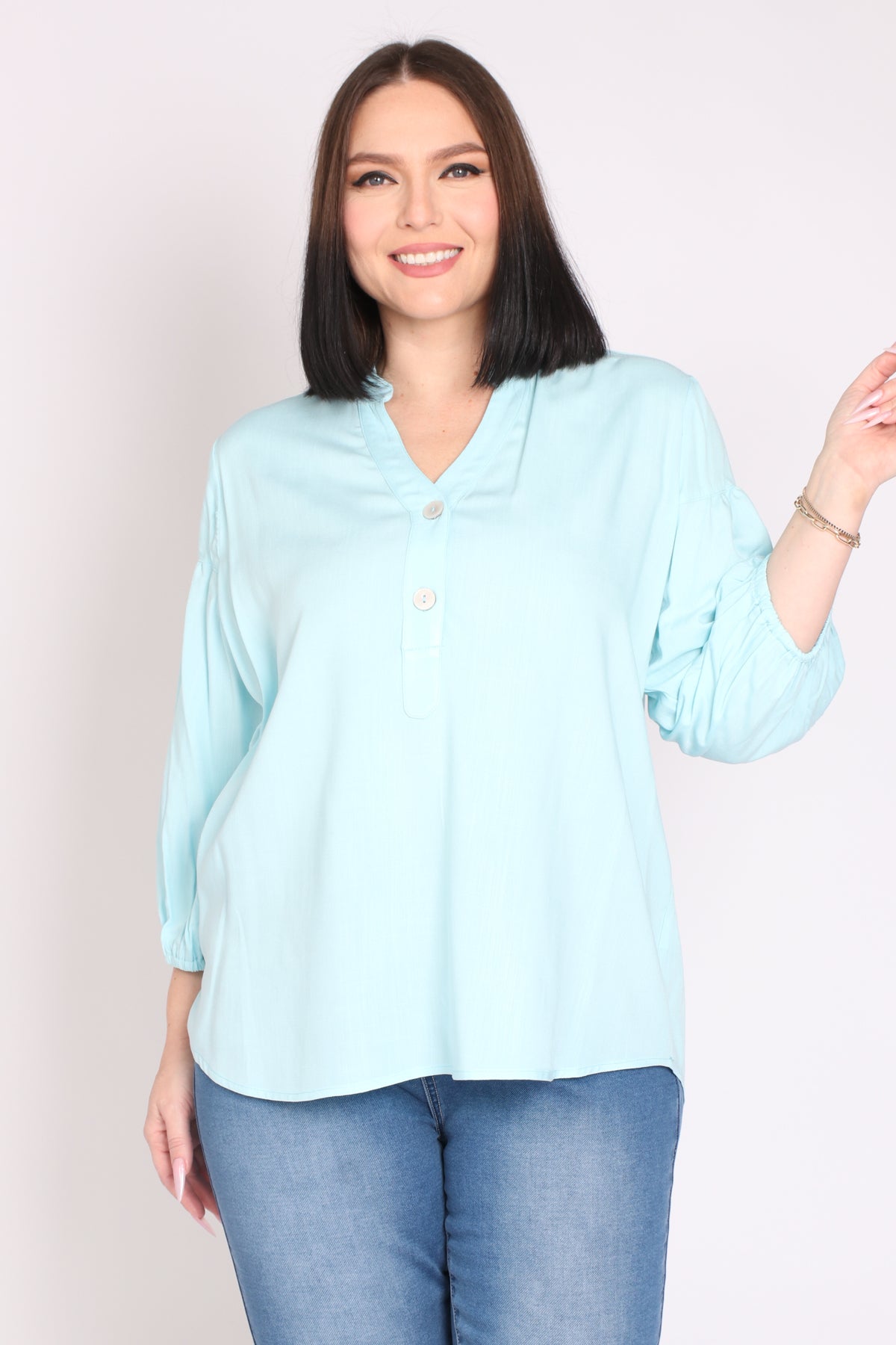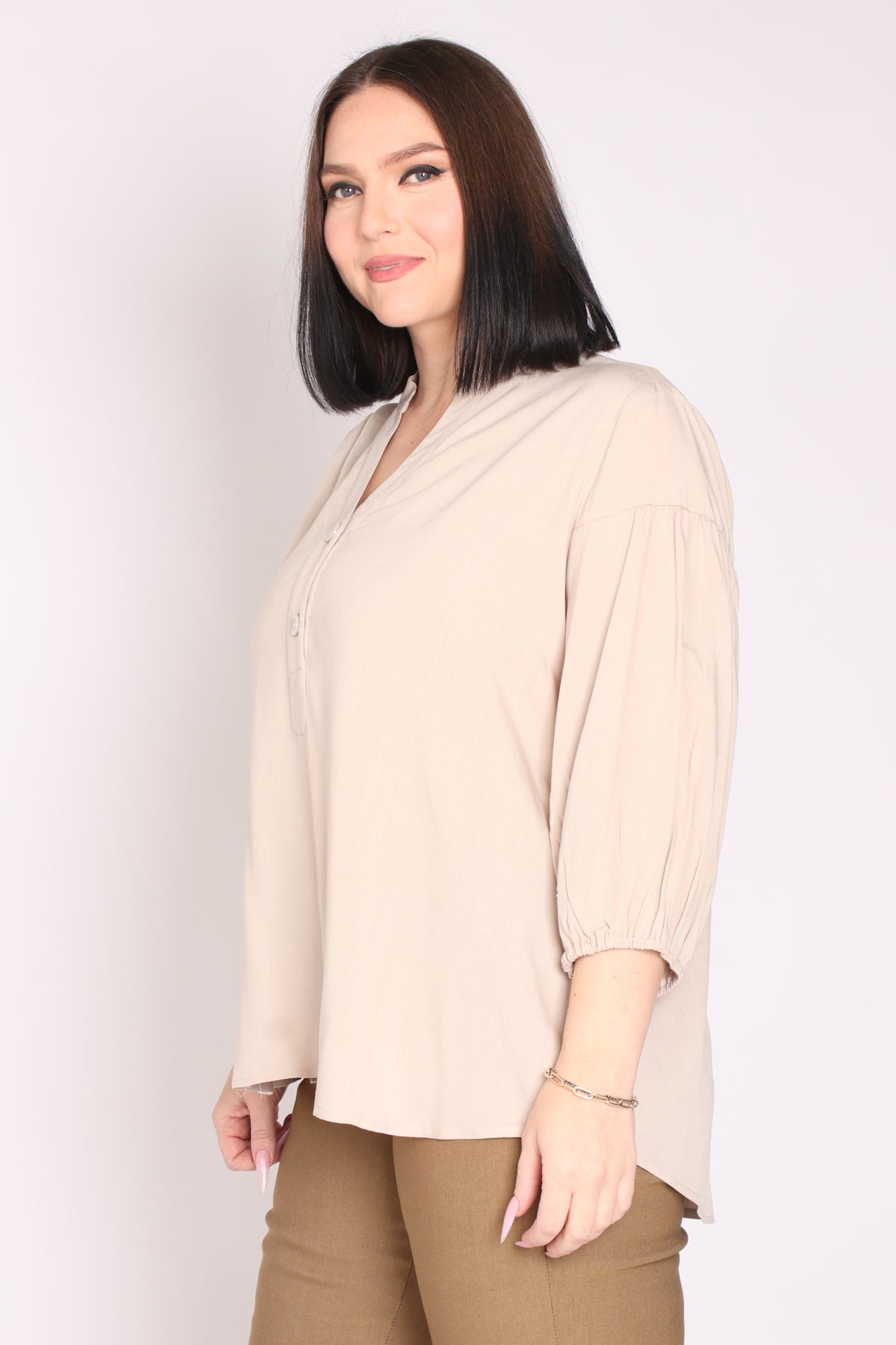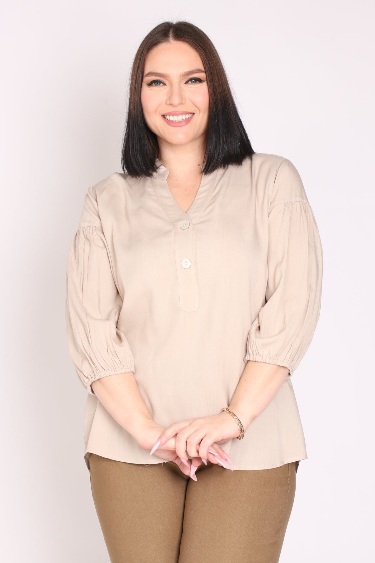 - מפתח צוואר וי ושני כפתורים, שרוולים המכסים את המרפק