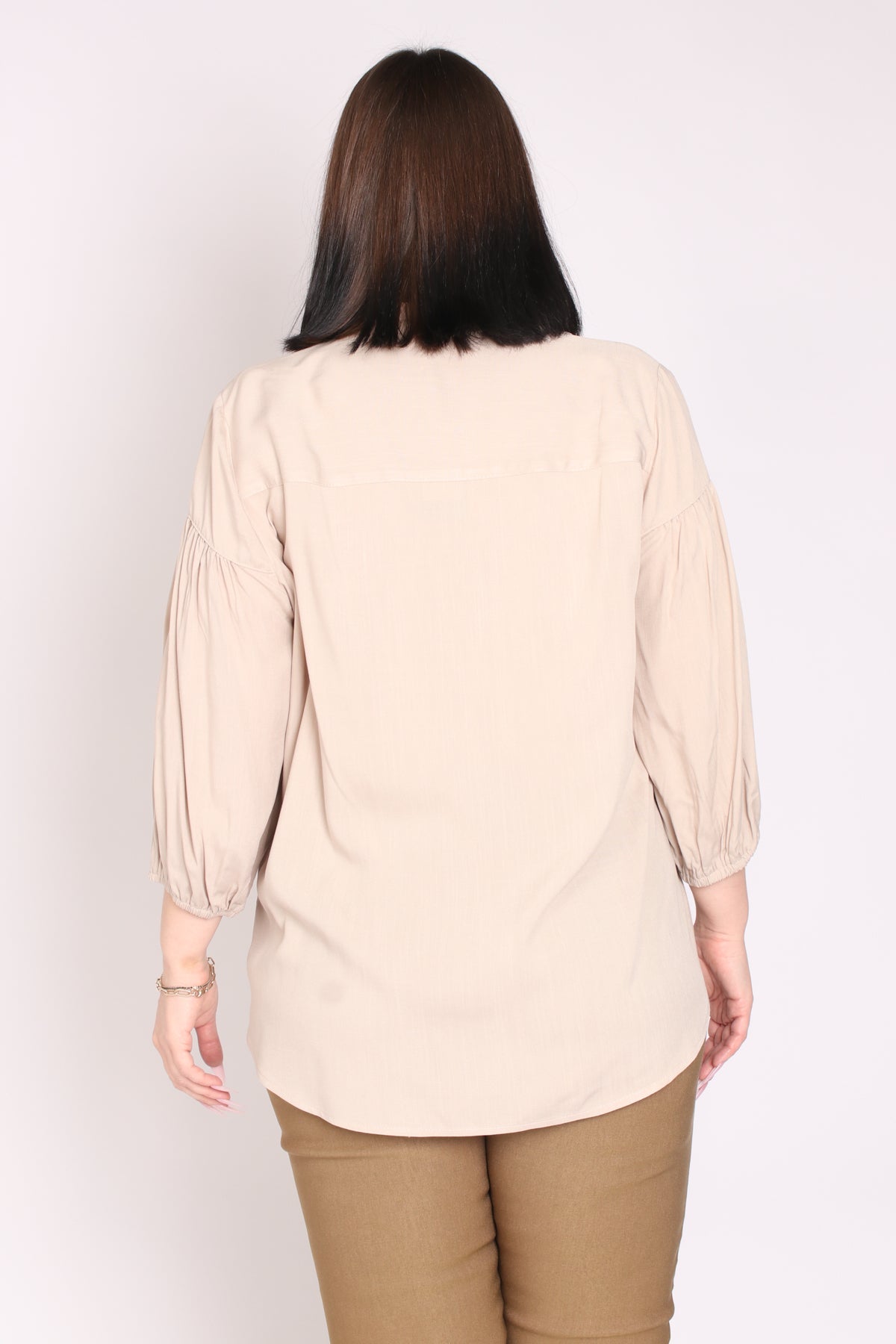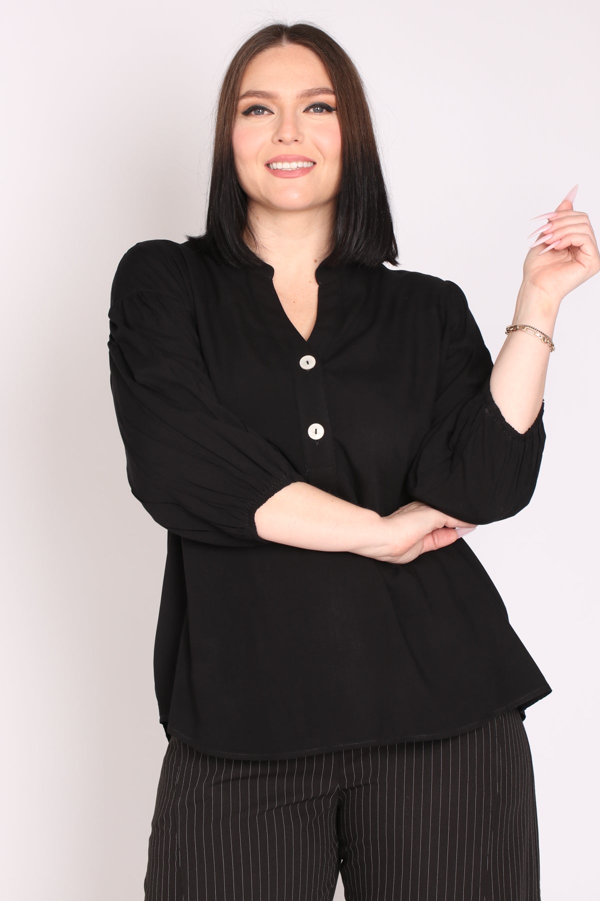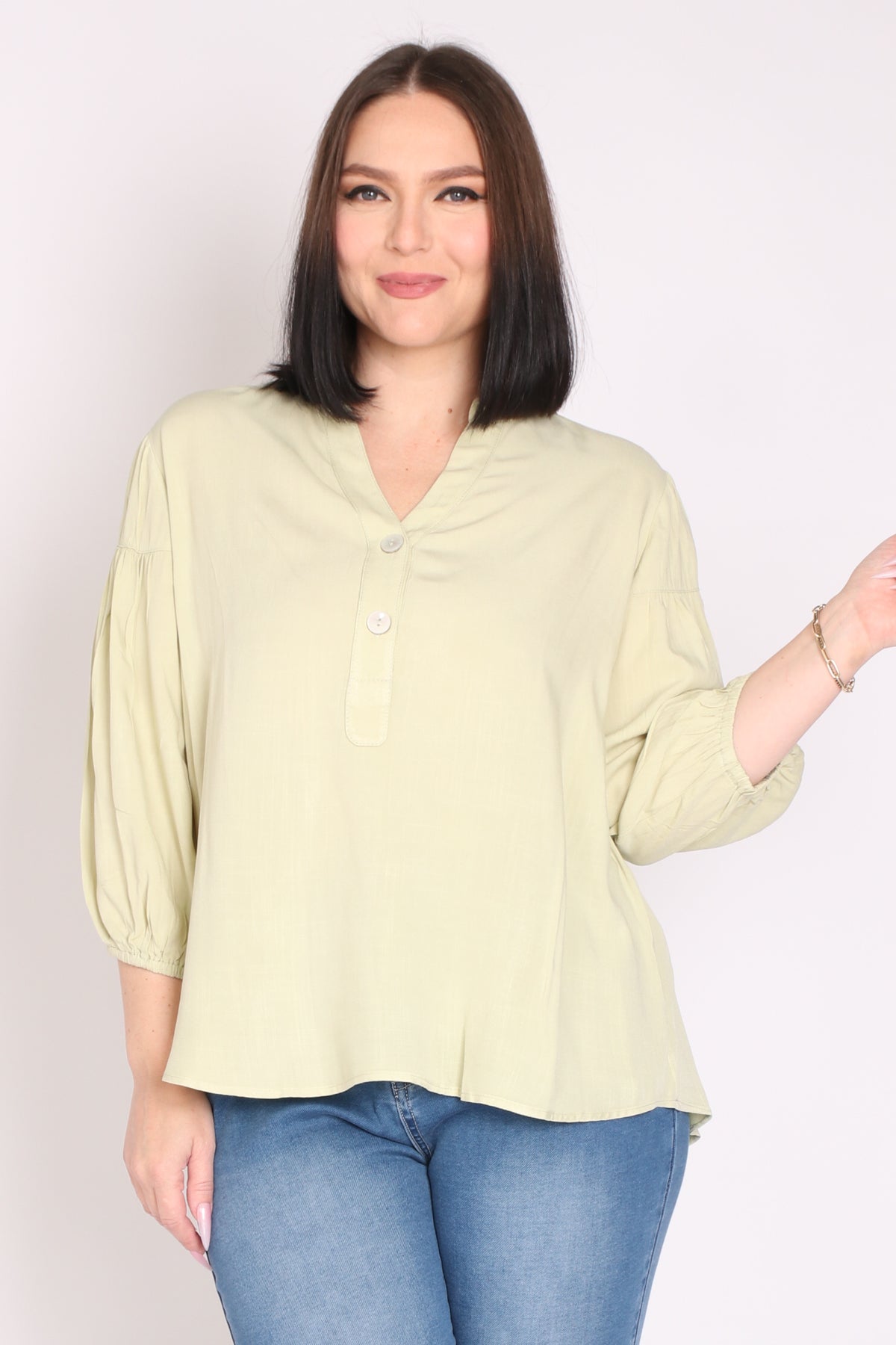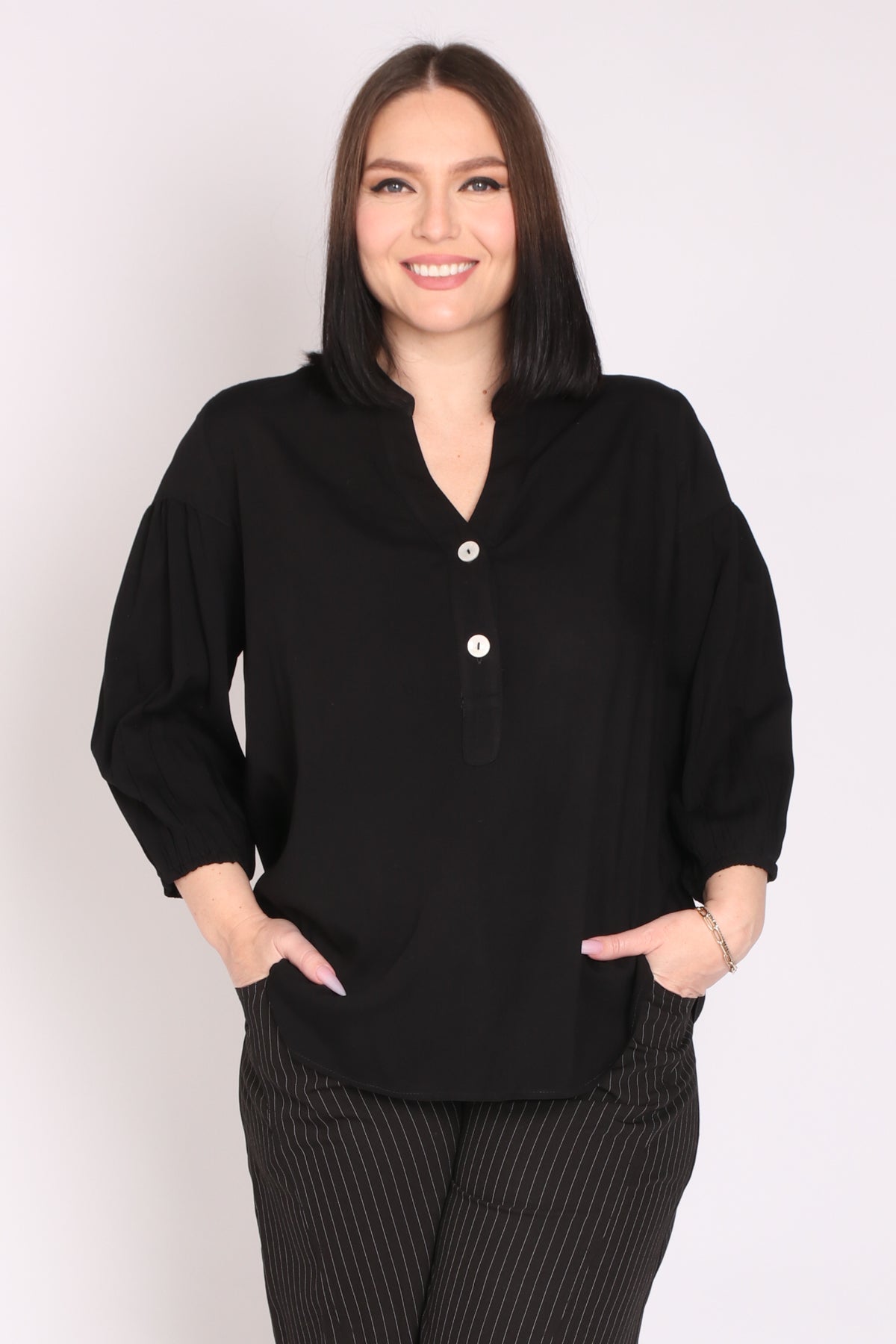 - מפתח צוואר וי ושני כפתורים, שרוולים המכסים את המרפק