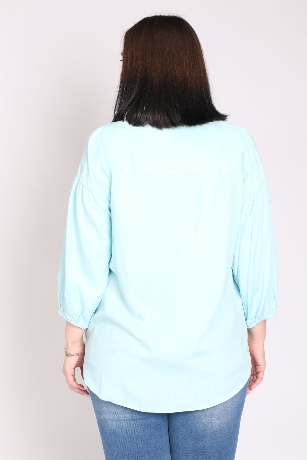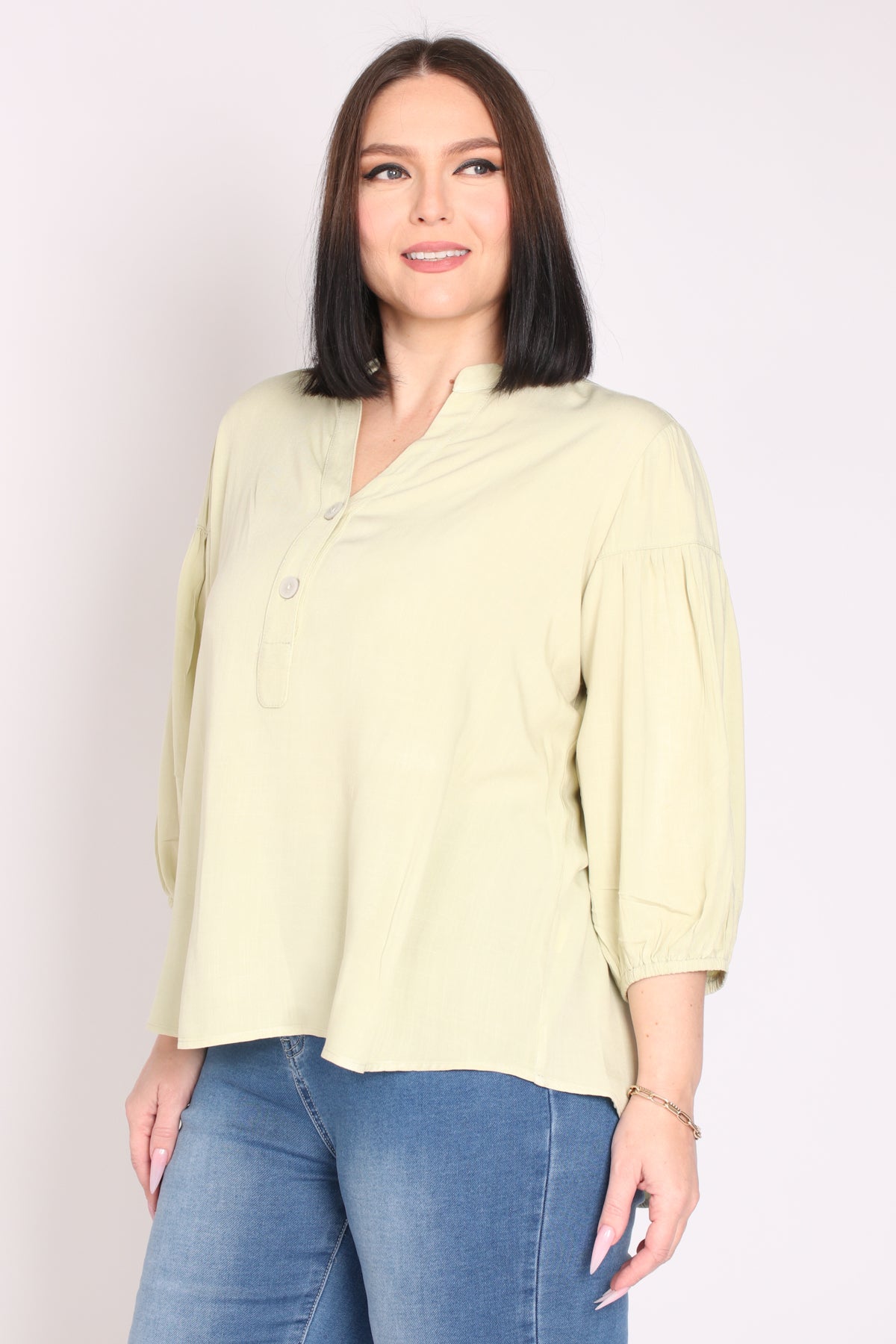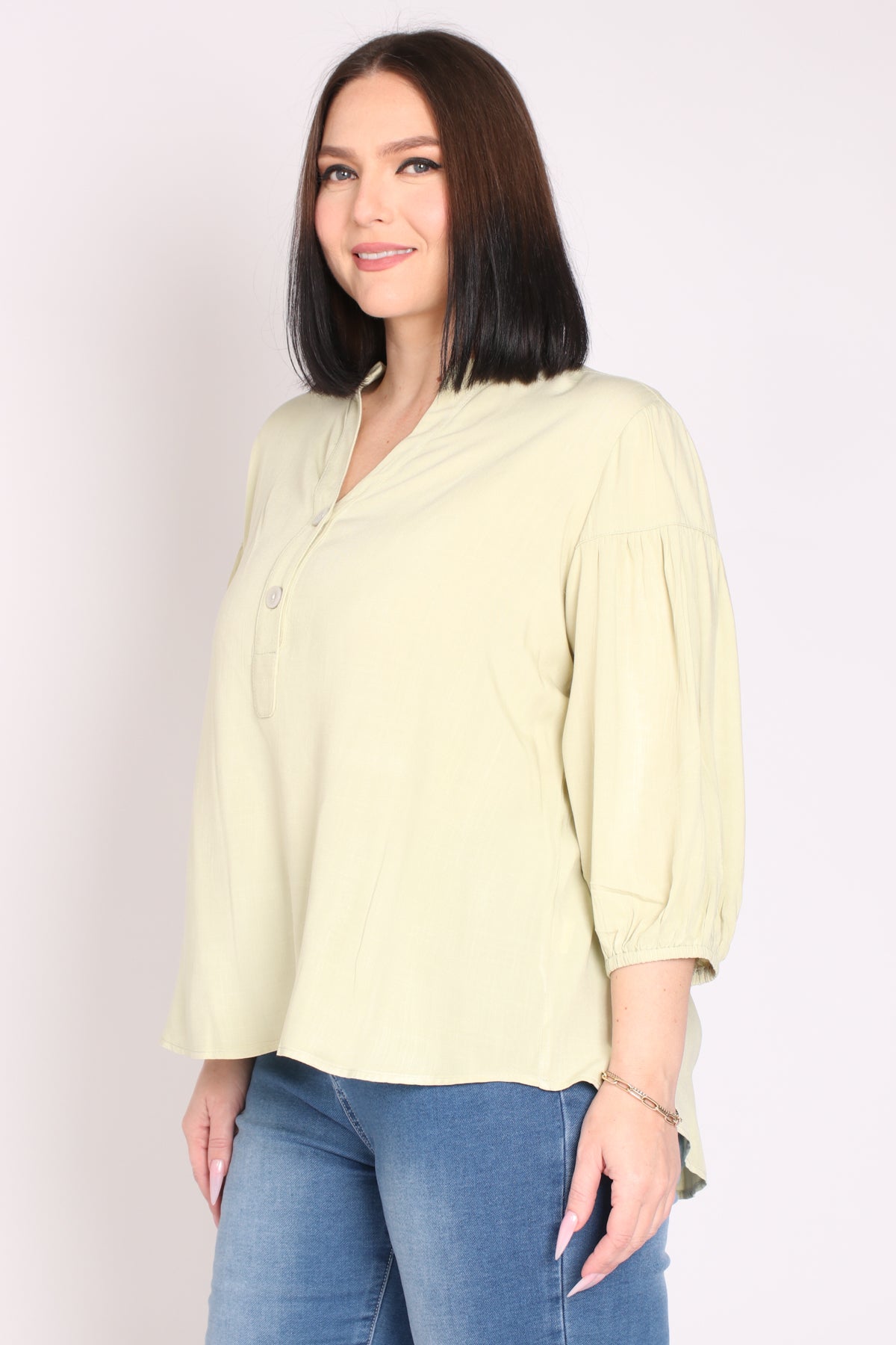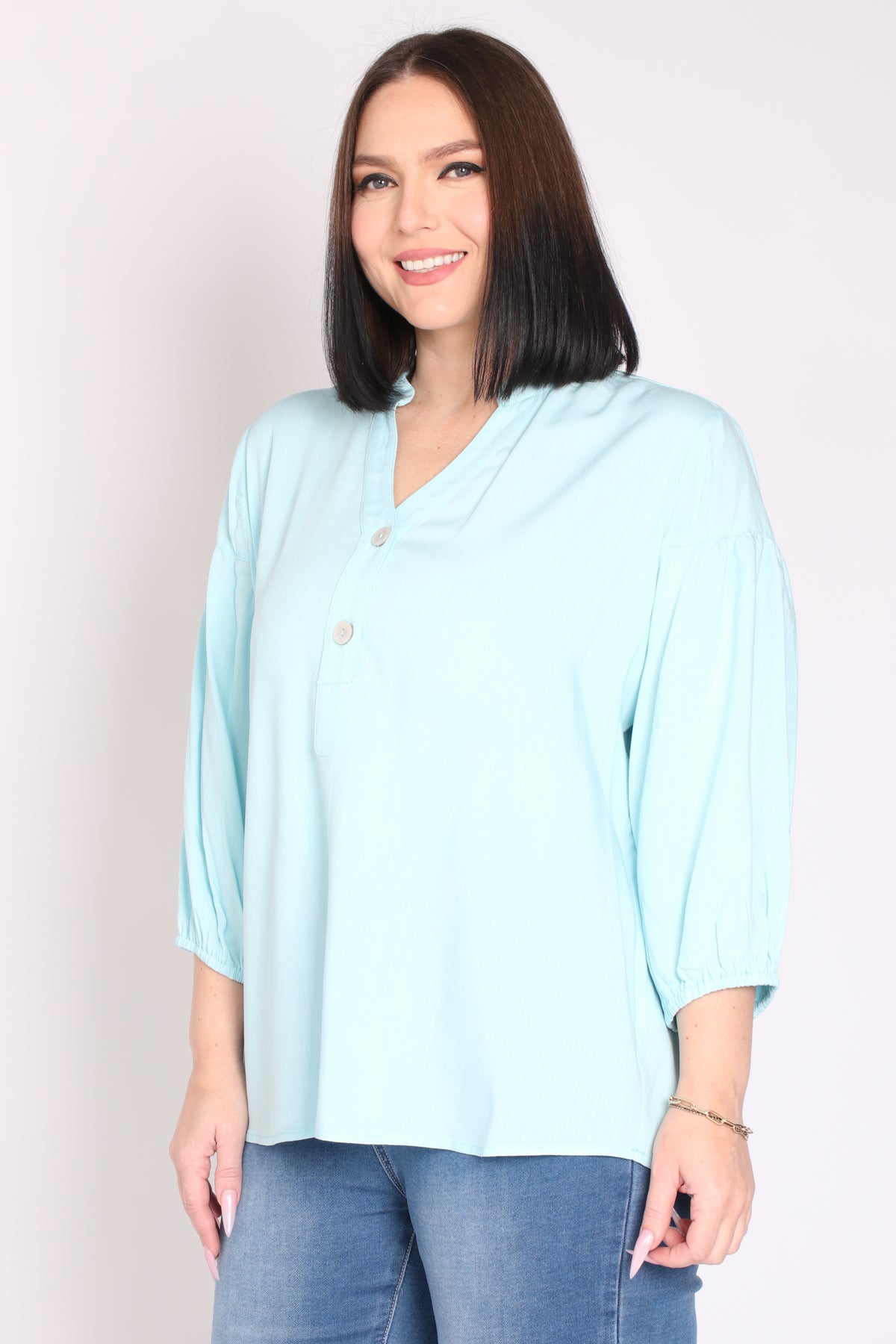 - מפתח צוואר וי ושני כפתורים, שרוולים המכסים את המרפק