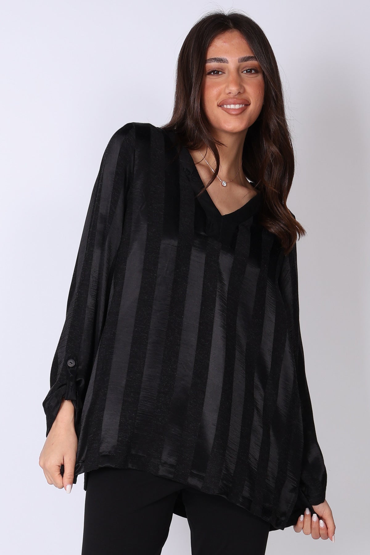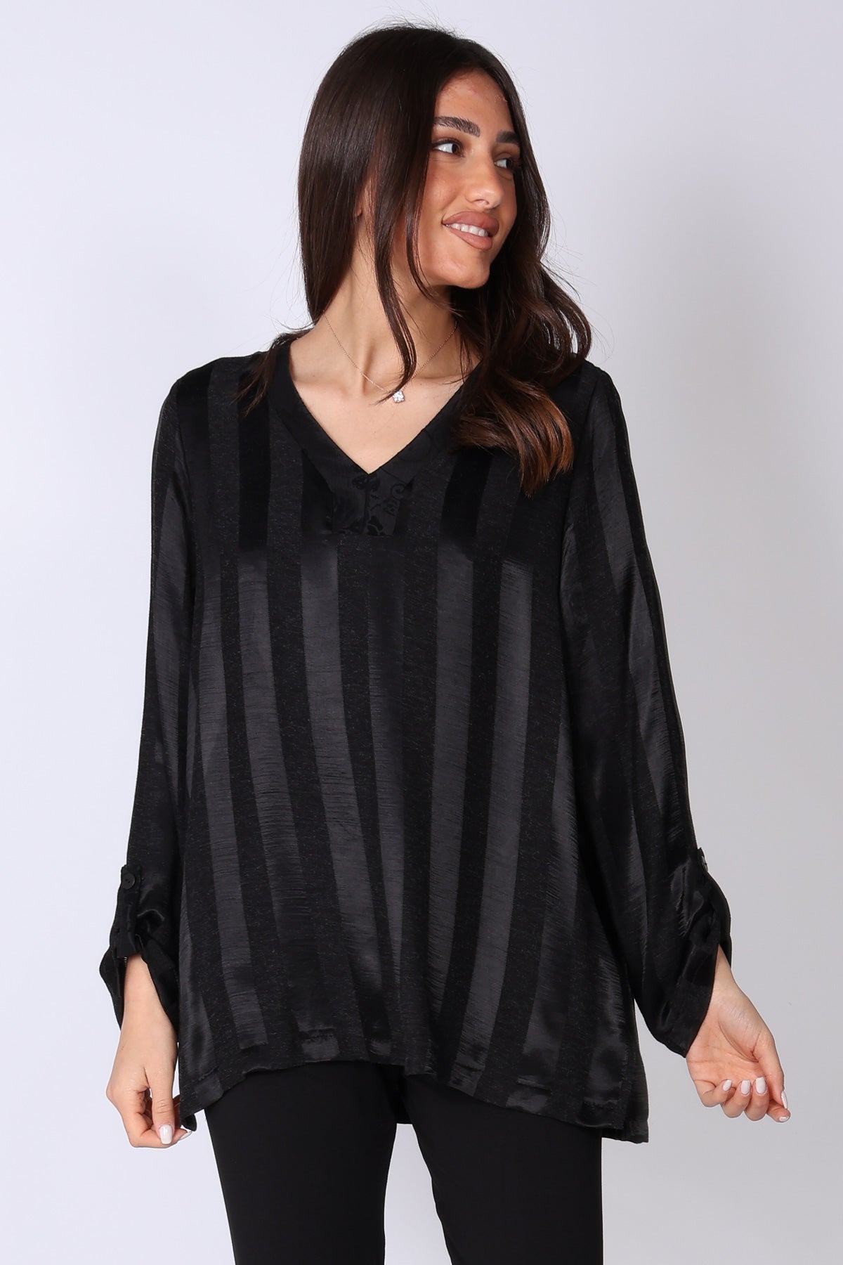 מפתח צוואר וי מחמיא ושרוולים המכסים את המרפק עם קיפול, שרוך וכפתור יוצרים מראה מוקפד אך נינוח שמתאים בקלות ללוק יום או ערב.