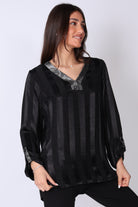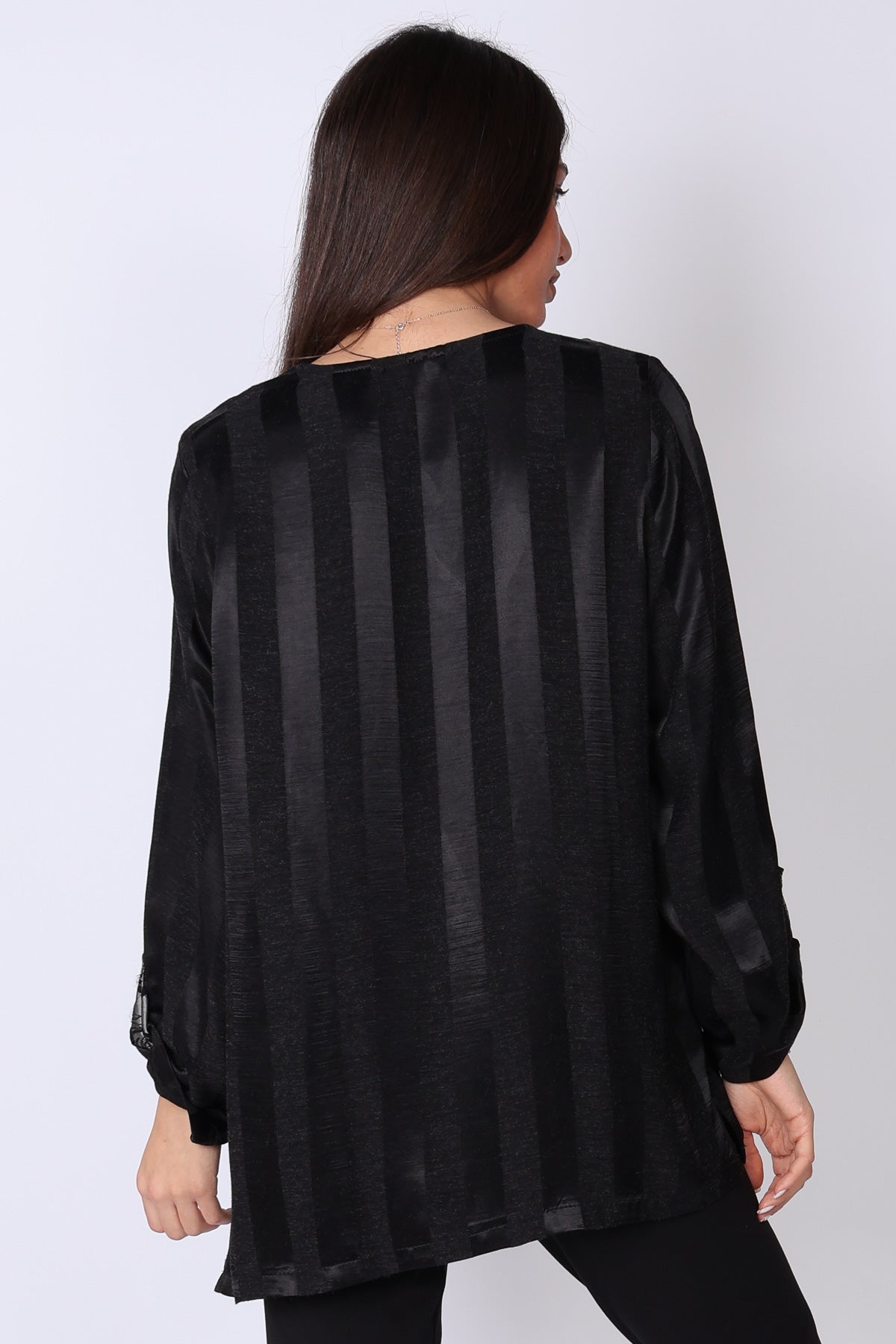 חולצת אריג בדוגמת פסים במראה יוקרתי, עם עיבוד מיוחד בצווארון שמוסיף טאץ’ אלגנטי ומדויק.