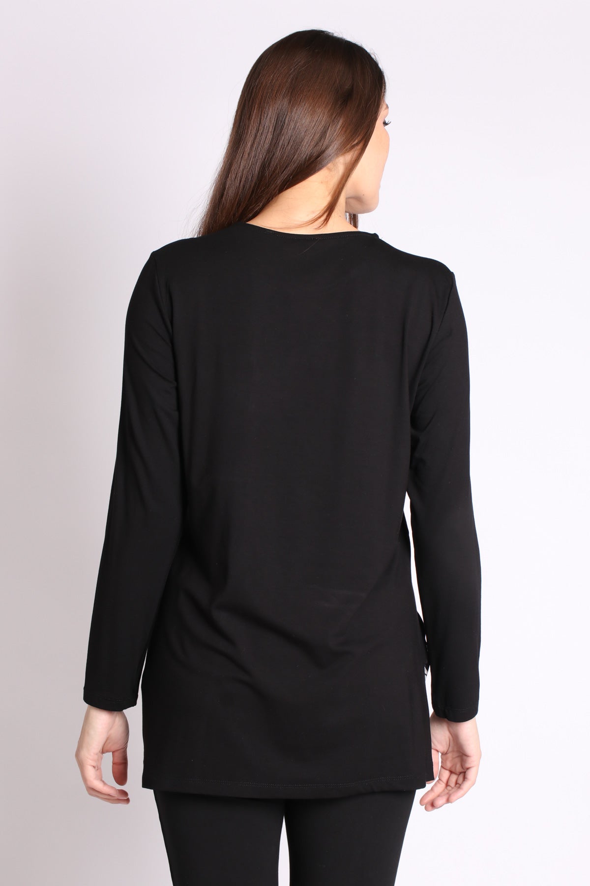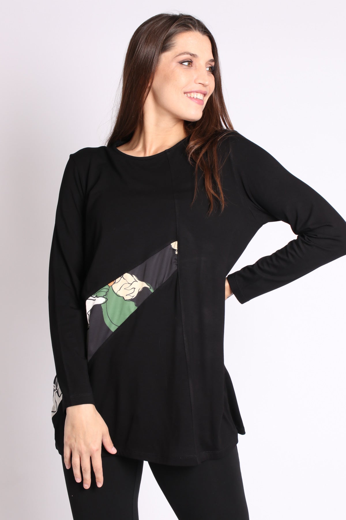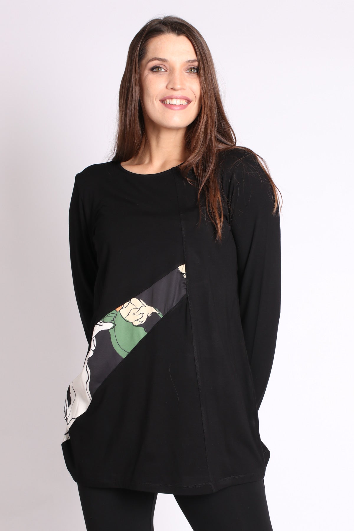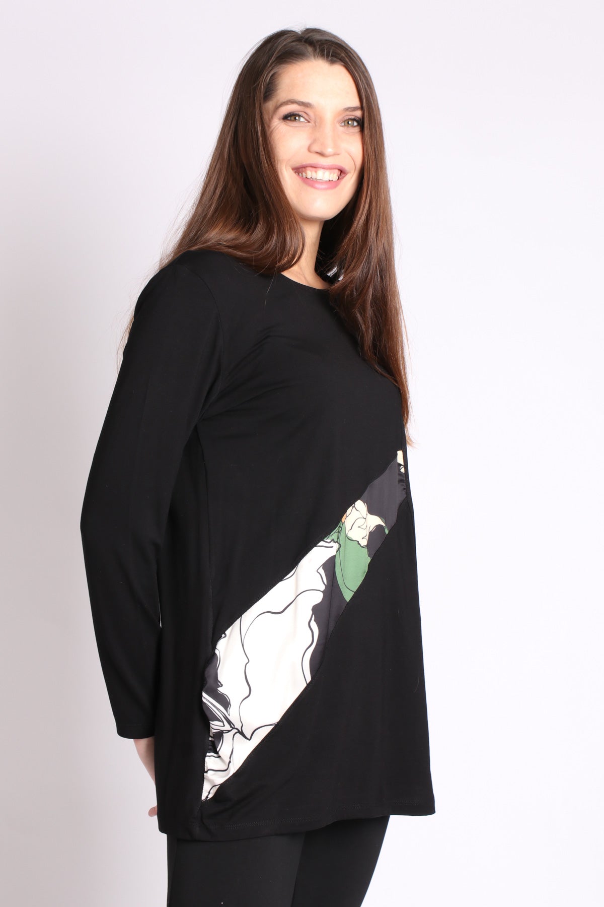 - טוניקה בגזרה מתרחבת קלות בשילוב בד מודפס בחיבור אלכסוני, עם פס עיבוד מרכזי