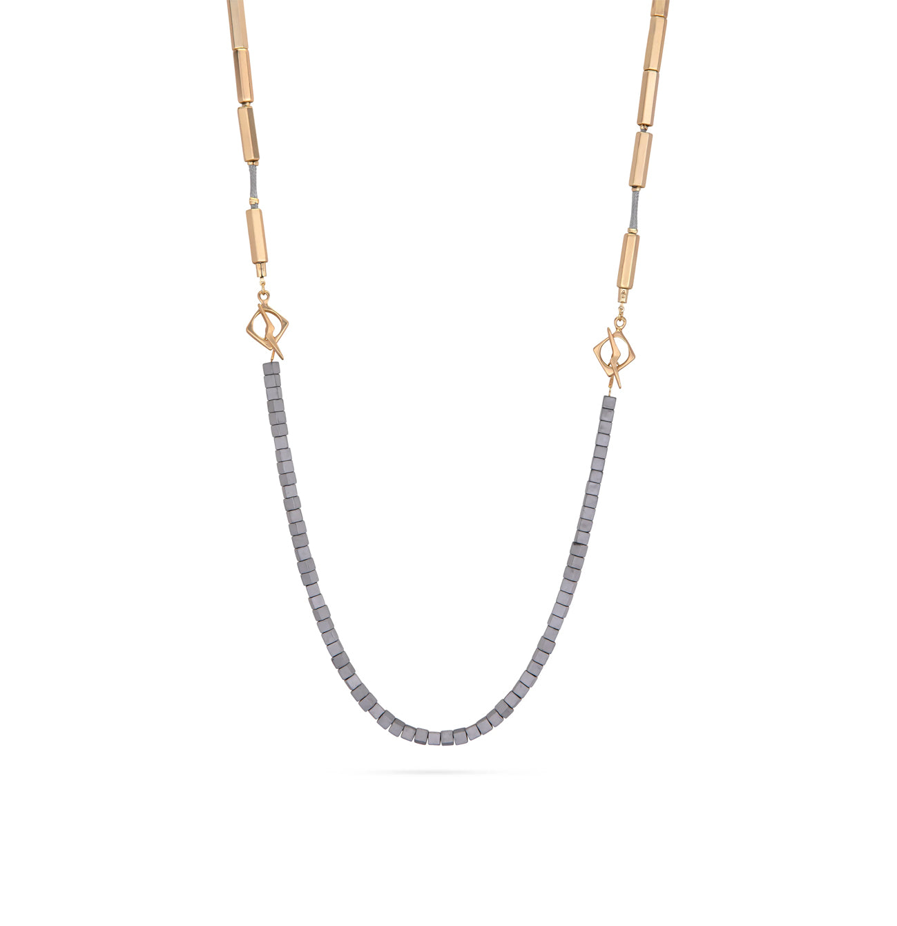- שרשרת המשלבת חרוזים דמוי גליל בצבע זהב לצד חרוזים מרובעים בצבע כסף