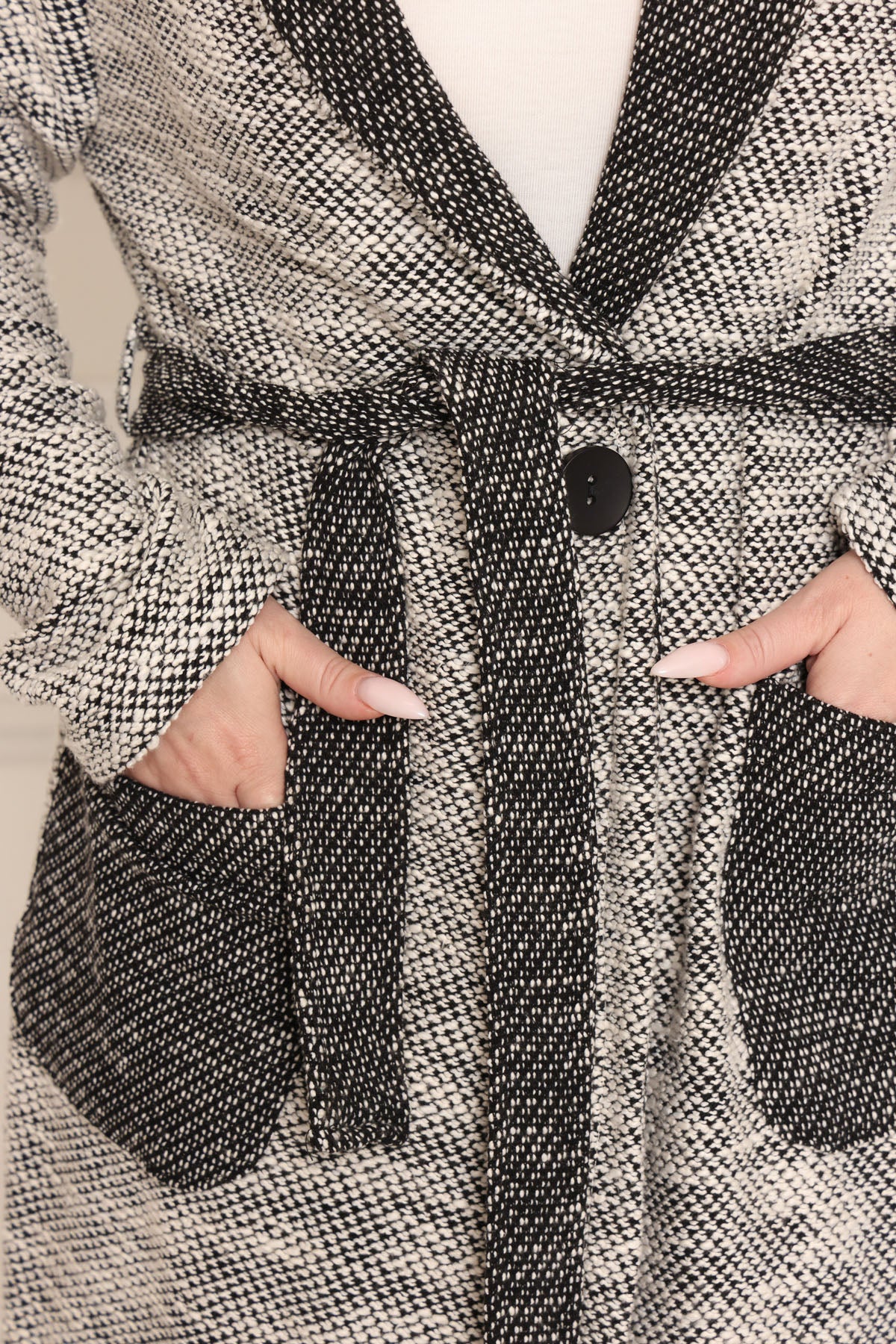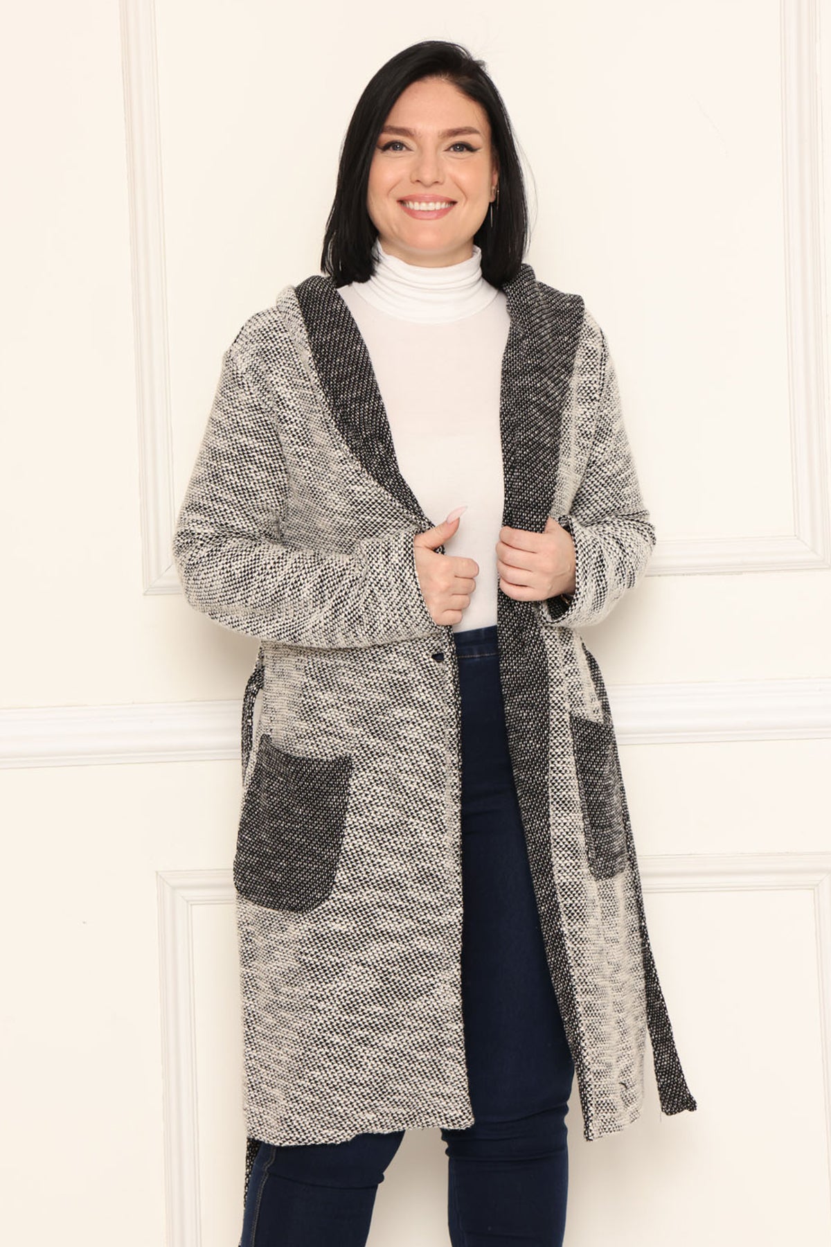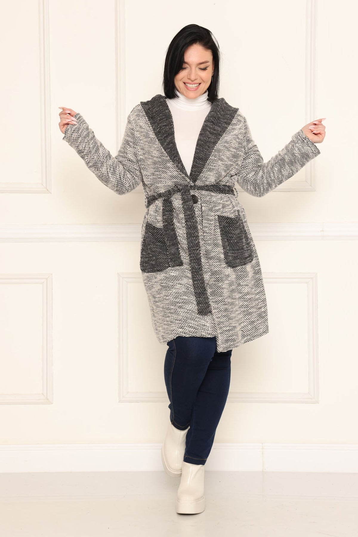 - מעיל מבד סריג מלאג' בסגירת כפתורים לצווארון וי עם כובע לאחור.