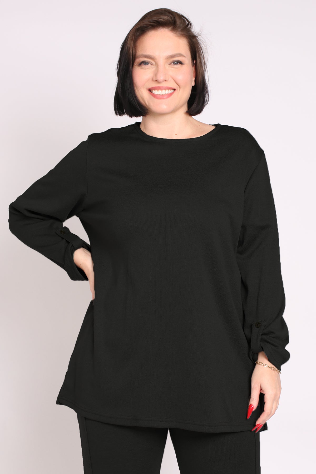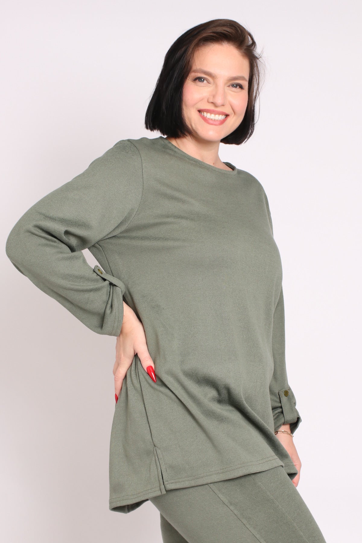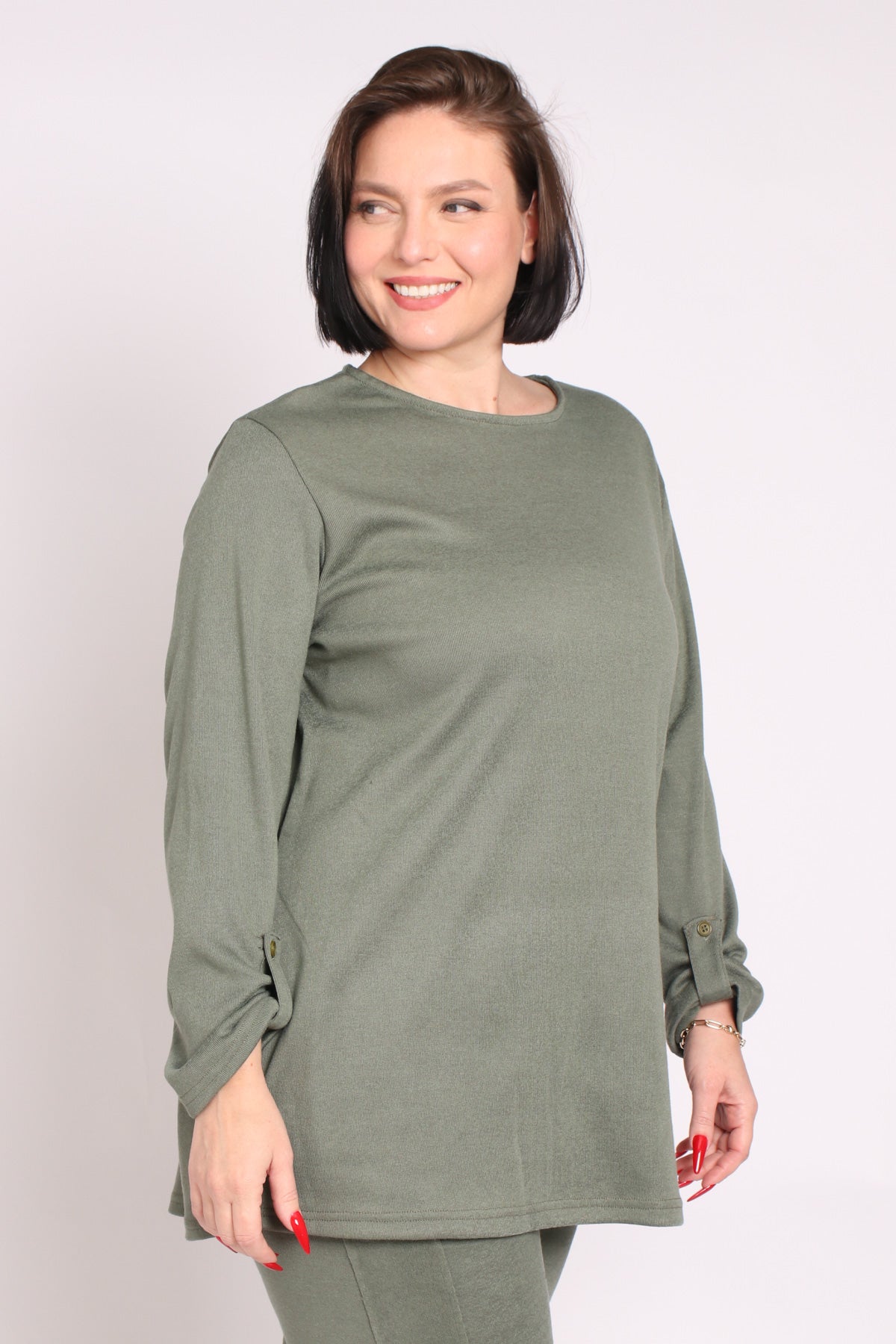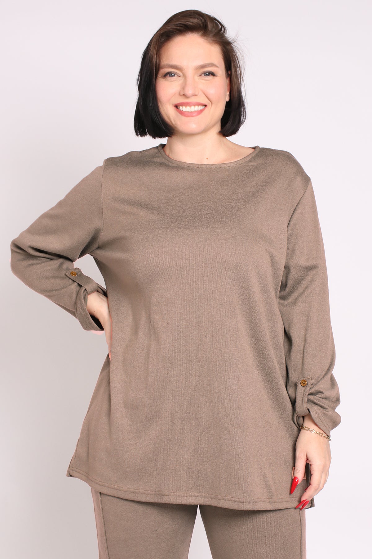 - מפתח צוואר עגול עם טקסטורה ושרוולים ארוכים בקיפול שרוך וכפתור