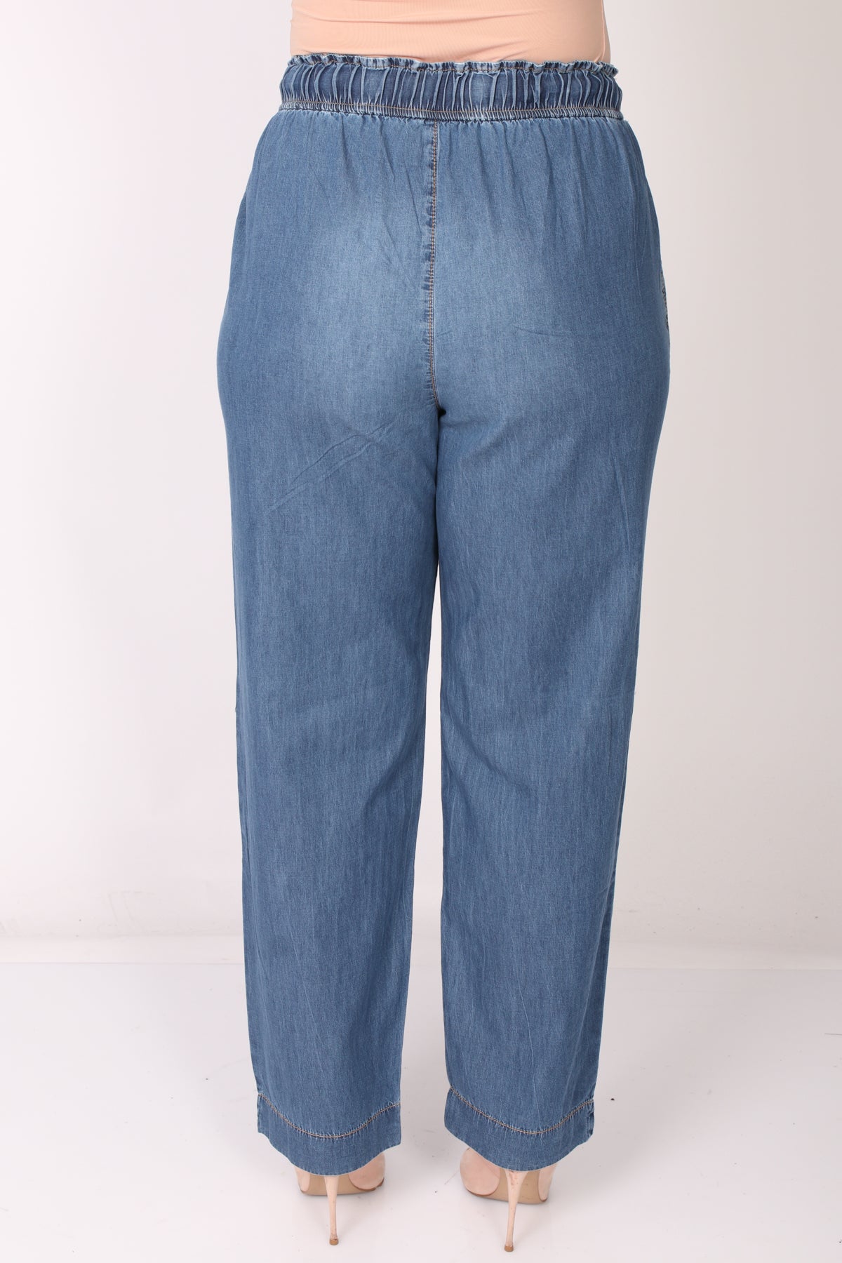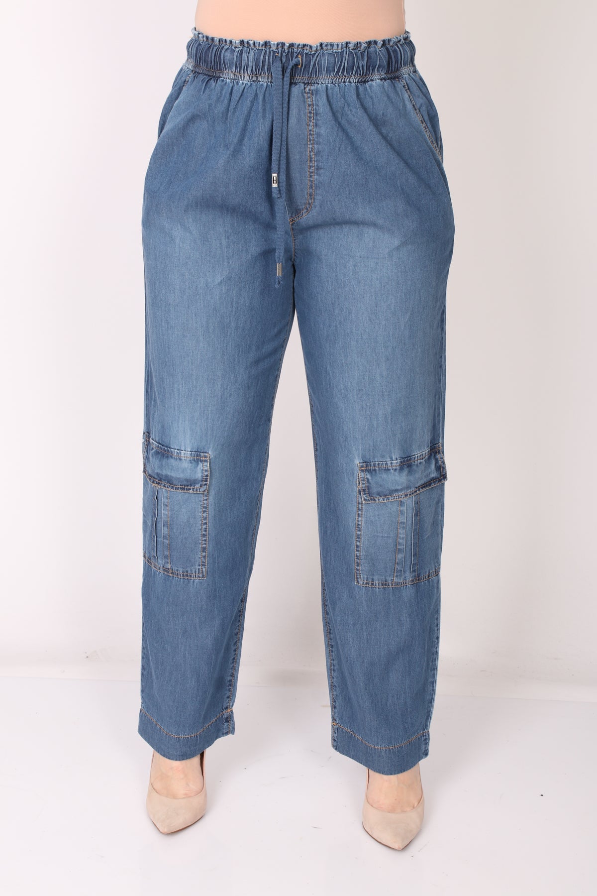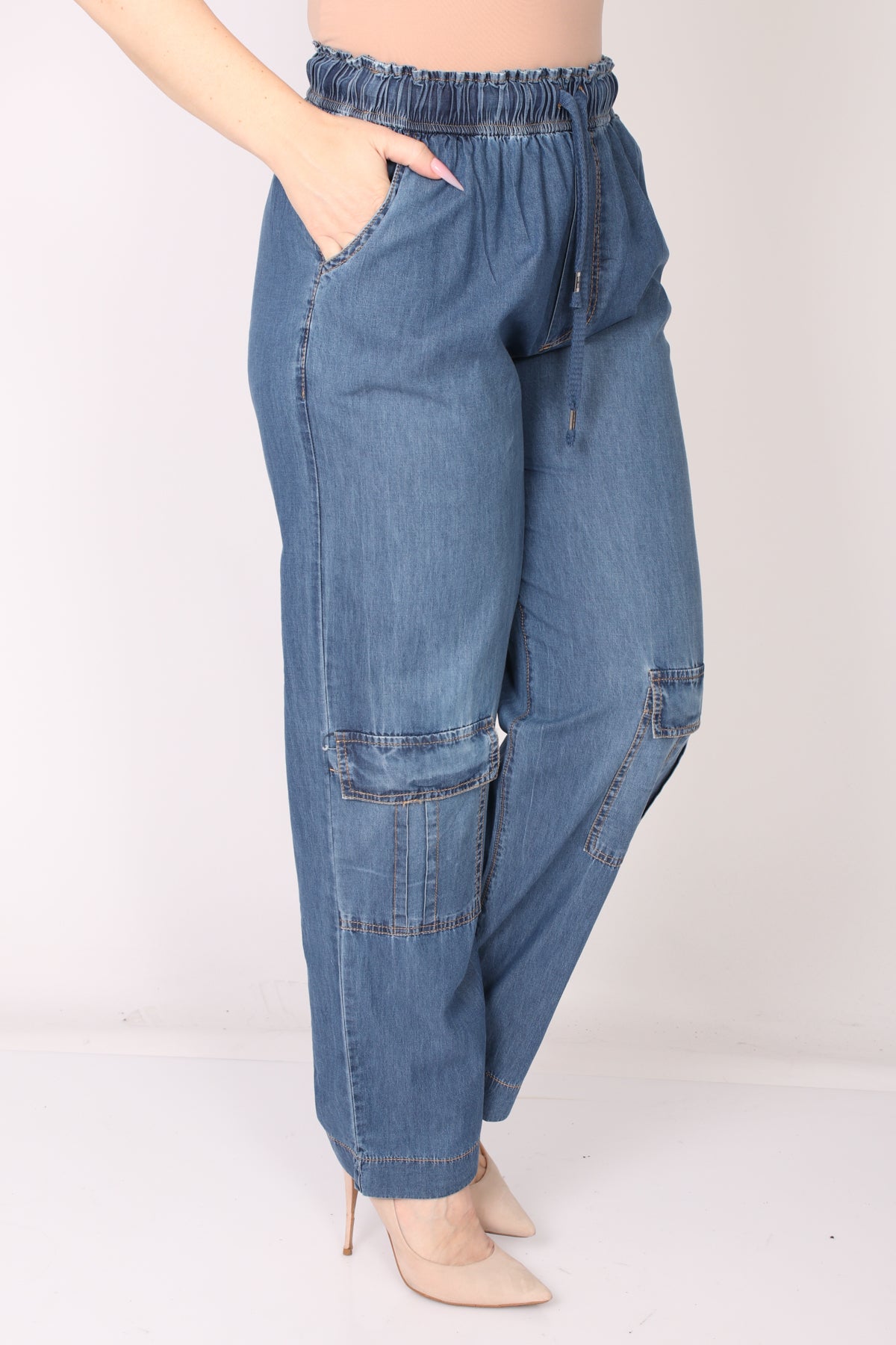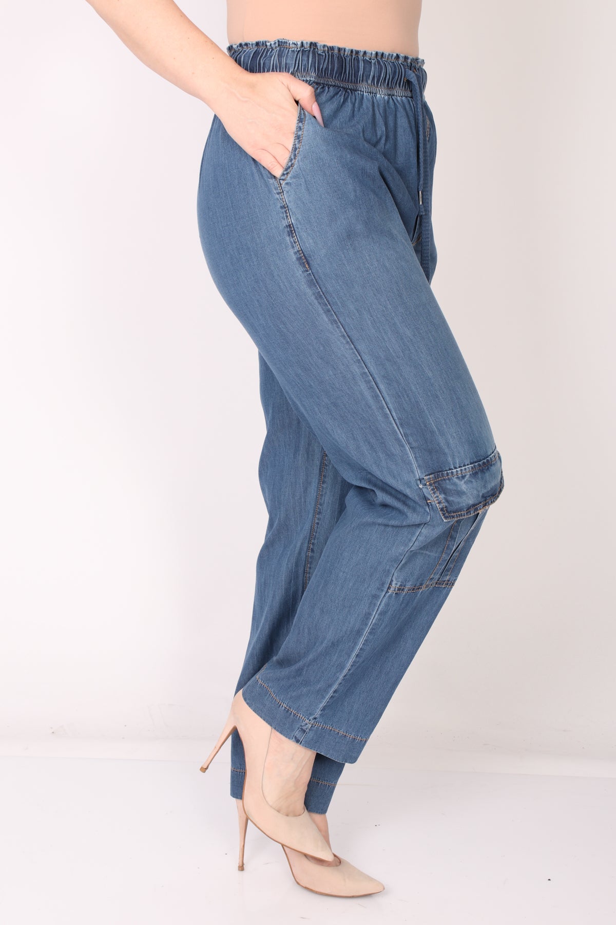 - מכנסי ג'ינס עם גומי במותן ושרוך לכיווץ עם שני כיסי דגמ"ח בברכיים