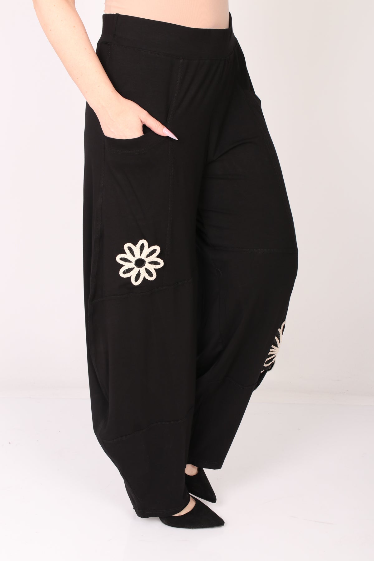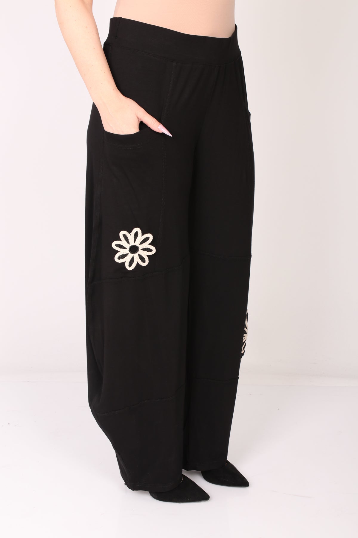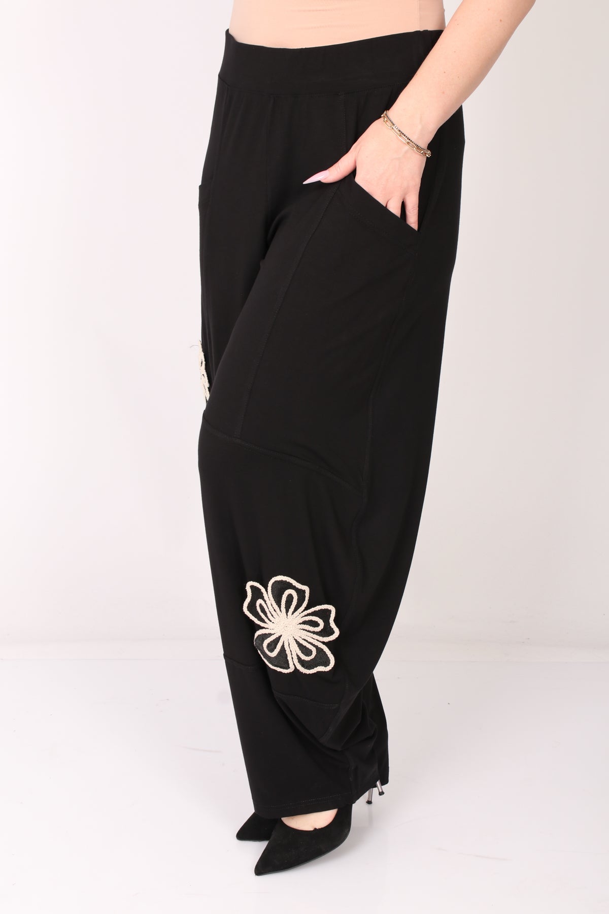 - מכנס עם גומי במותן, מבד נעים ונוח בעיטור פרחים בצבע טבעי