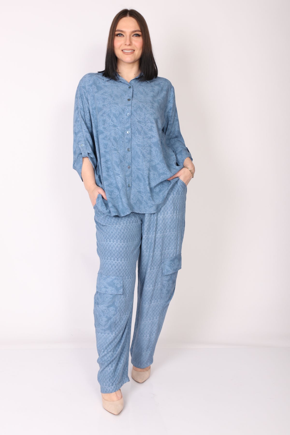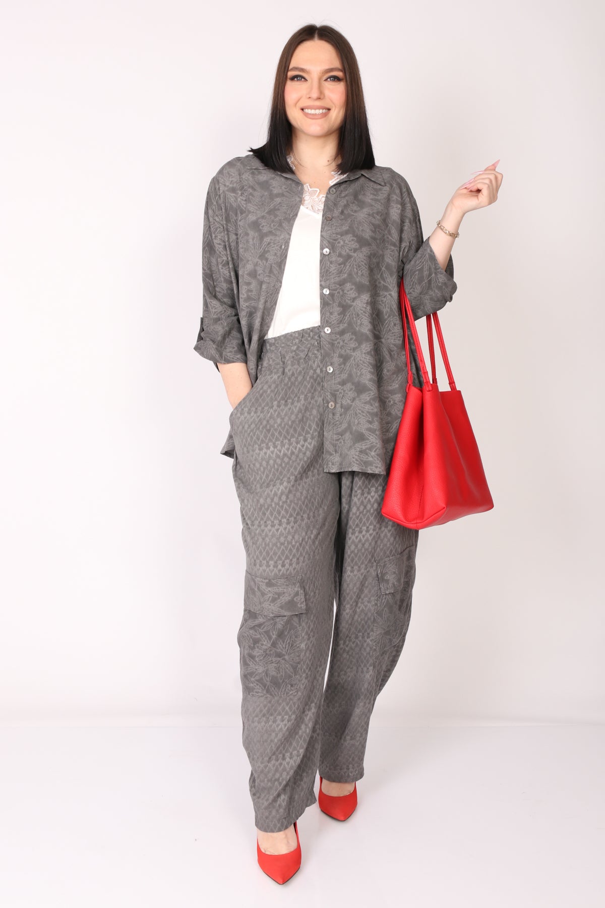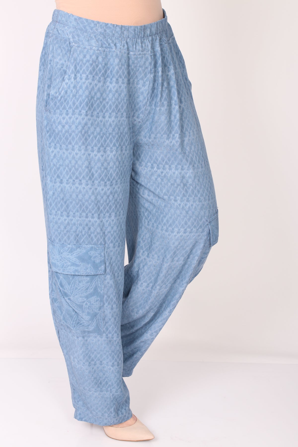 - מכנס עם גומי במותן מבד אריג מודפס בגזרה רחבה.