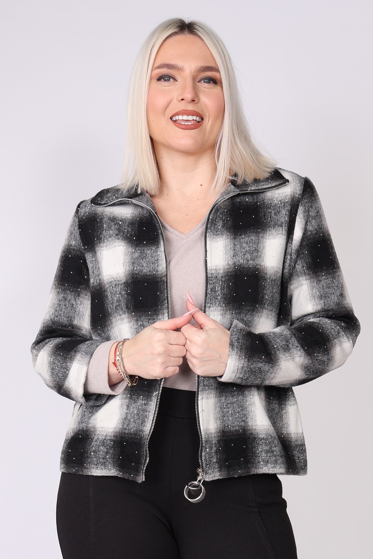 ג’קט משבצות בעיצוב מוקפד, עם עיטור אבנים קטנות שמוסיף נגיעה עדינה של זוהר. הגזרה קצרה במותן ומדגישה את הלוק, עם סגירת הרוכסן יוצרת מראה נקי ומעודכן. בד המשבצות מעניק נוכחות אלגנטית שמתאימה גם ללוק יומיומי וגם לשילוב ערב.