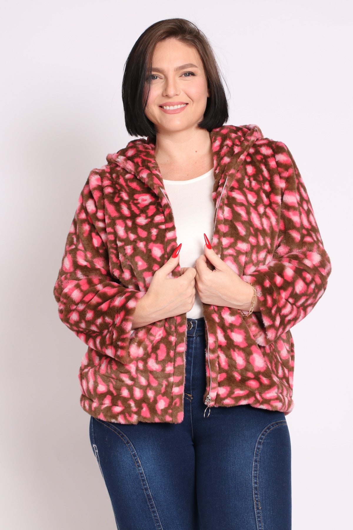 - ג'קט פרווה מדפוס מנומר עם כובע קפוצ'ון לאחור, סגירה ברוכסן ברזל ושני כיסים