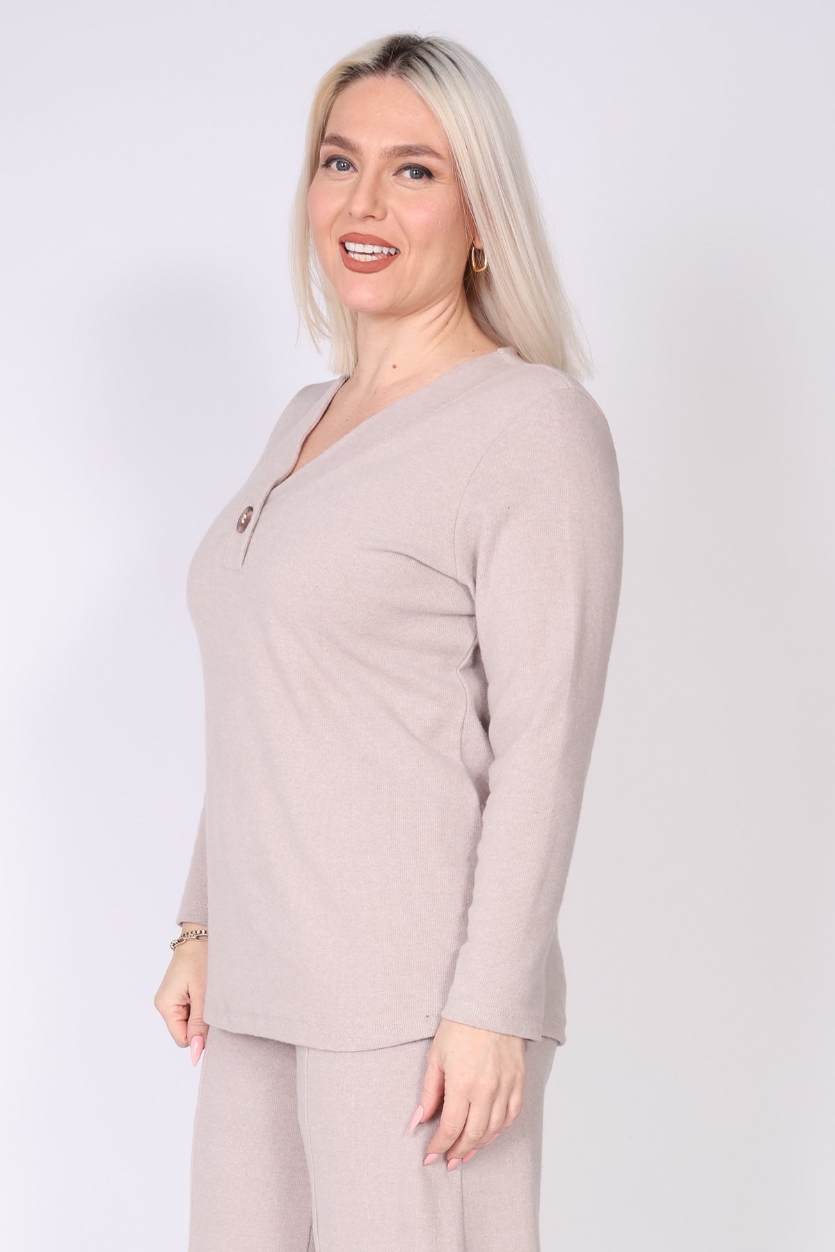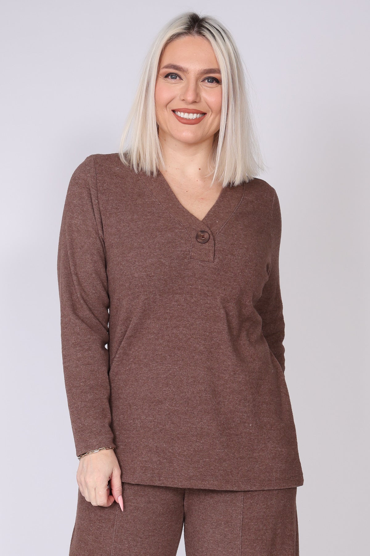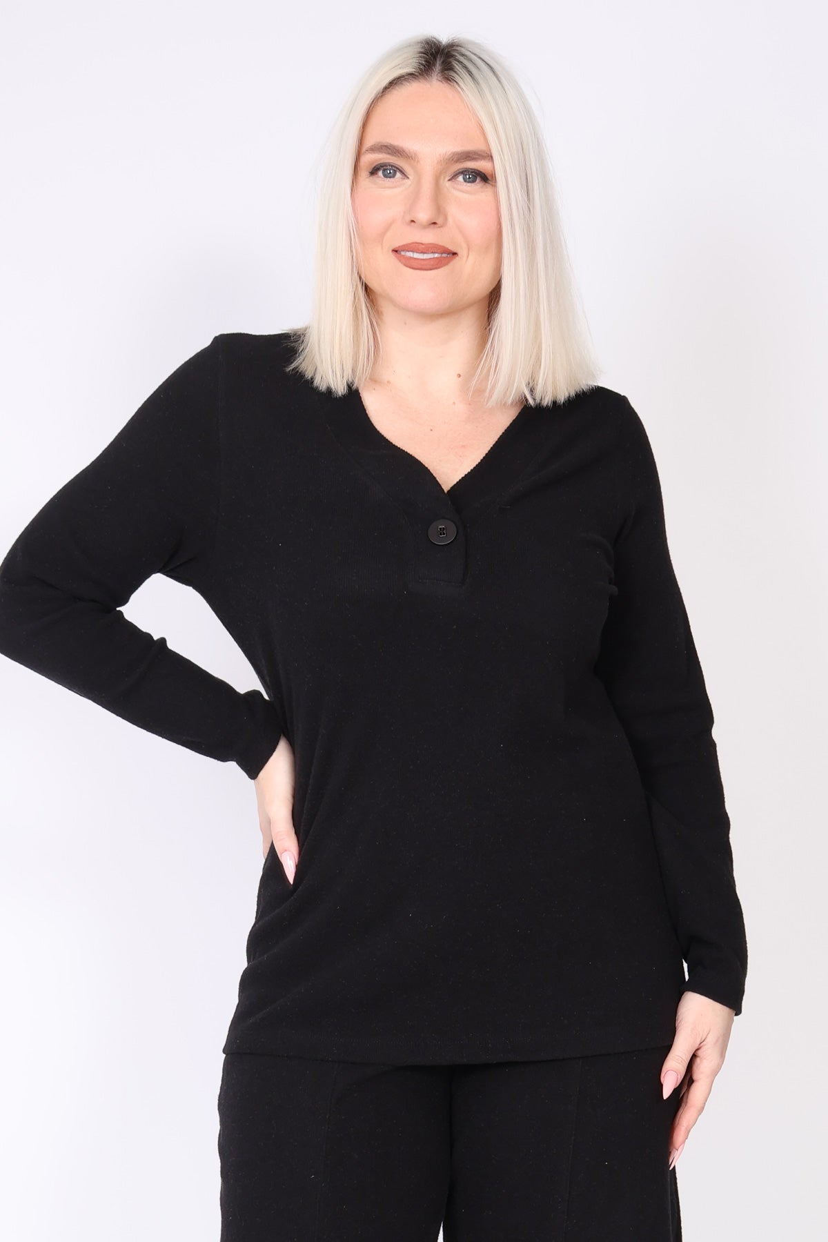 חולצת סריג בגזרה קלאסית ונינוחה, עם מפתח צוואר וי ושרוולים ארוכים. החולצה יושבת בצורה נקייה על הגוף ומעניקה מראה מסודר אך קליל, מושלמת ליום-יום ולשילוב עם שכבות או פריטים בסיסיים.