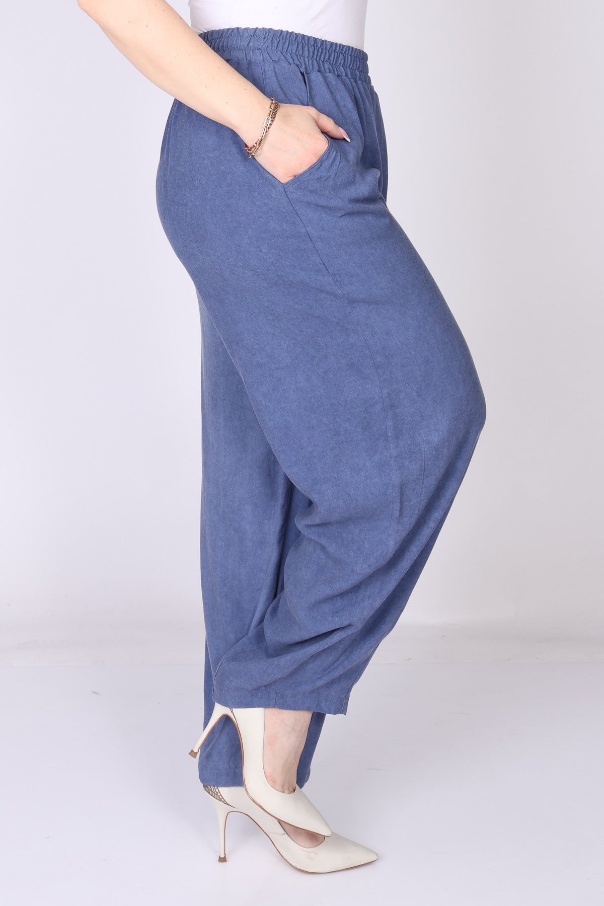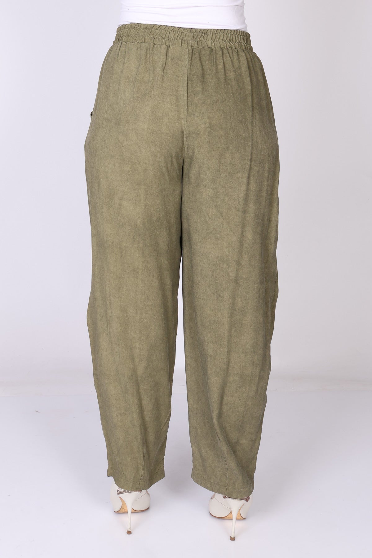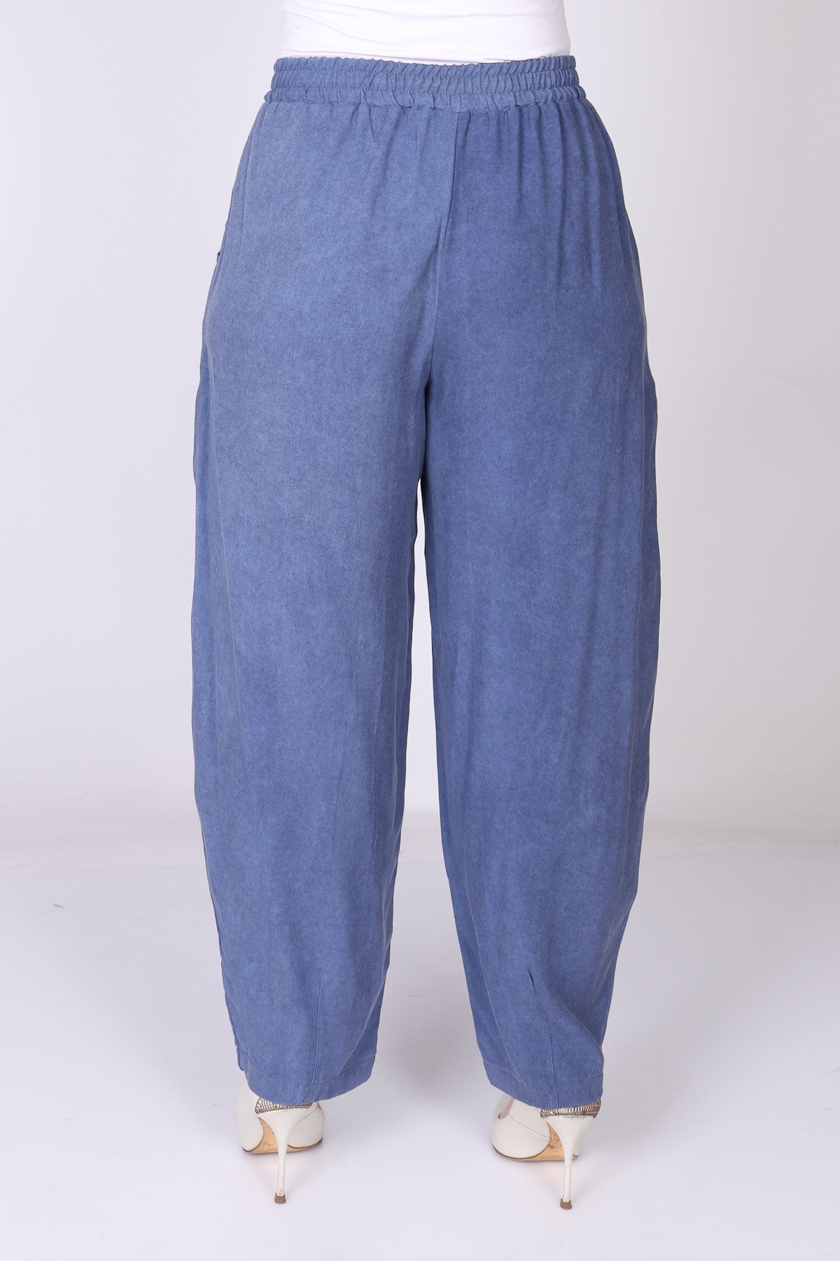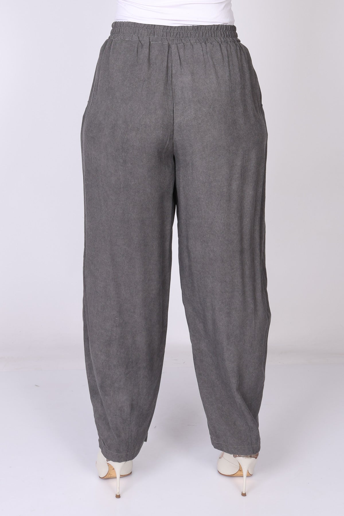 מכנס עם גומי במותן בגזרה מתרחבת המסתיימת בסיומת צרה, שמעניקה מראה מחמיא ומאוזן.
