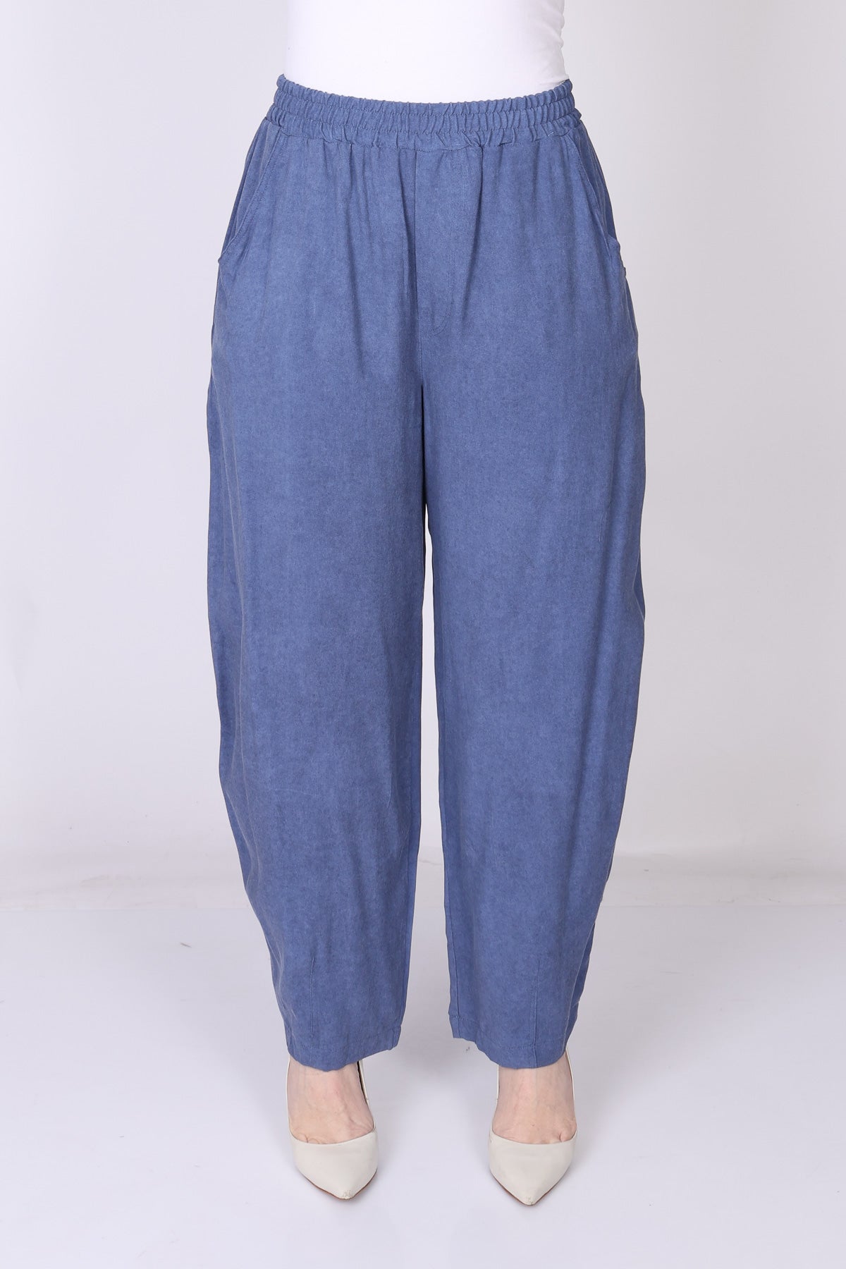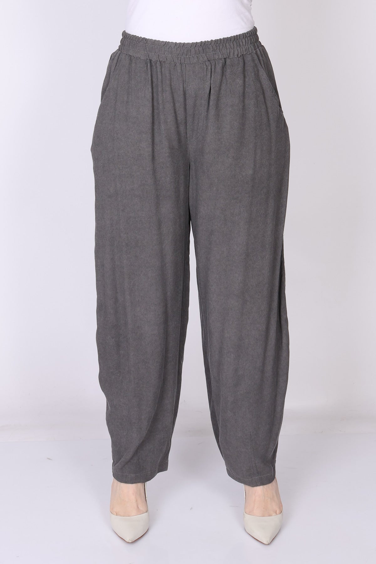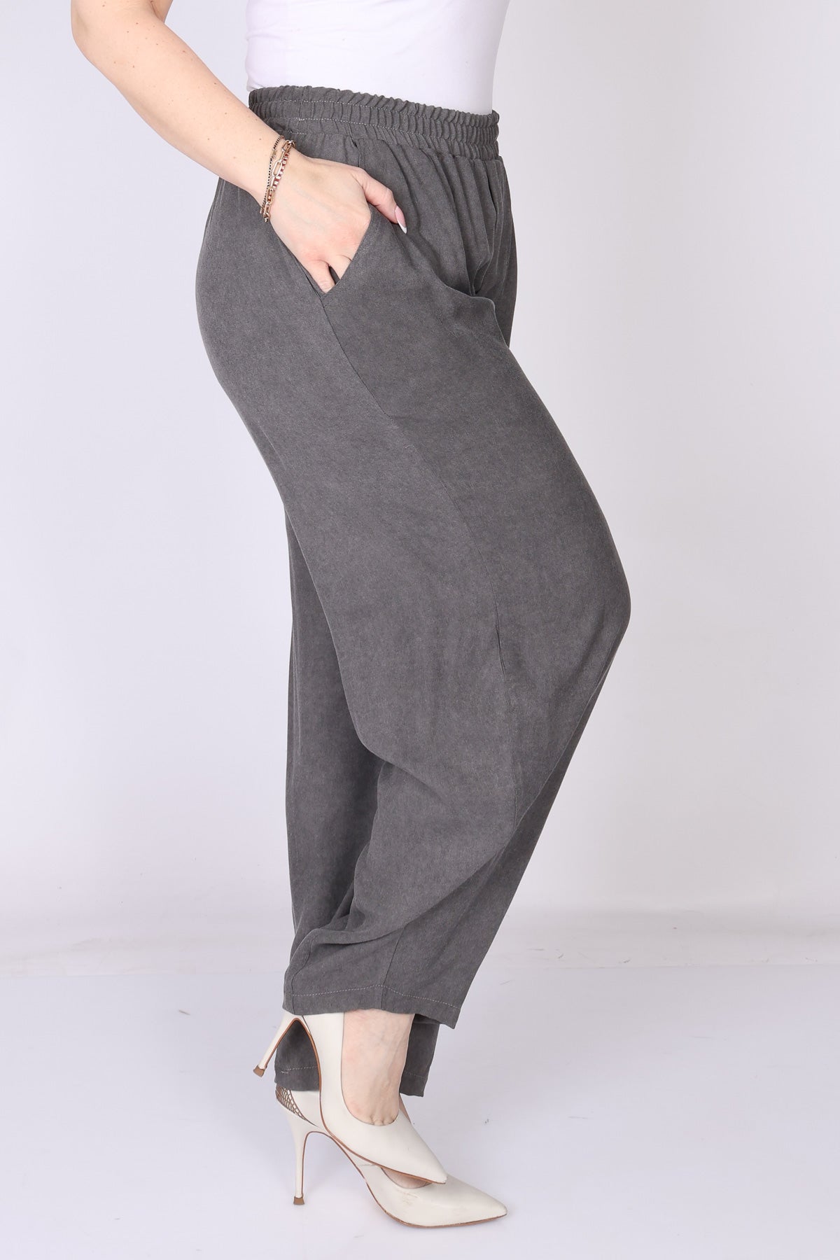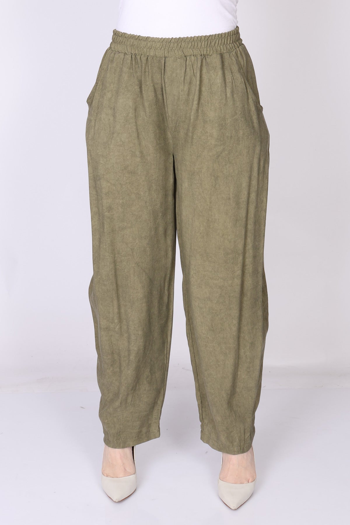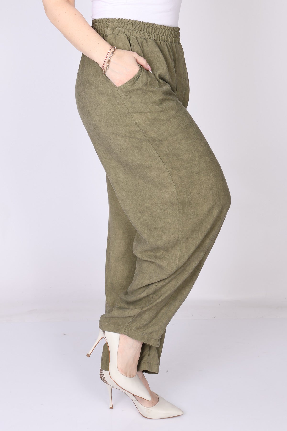 מכנס עם גומי במותן בגזרה מתרחבת המסתיימת בסיומת צרה, שמעניקה מראה מחמיא ומאוזן.