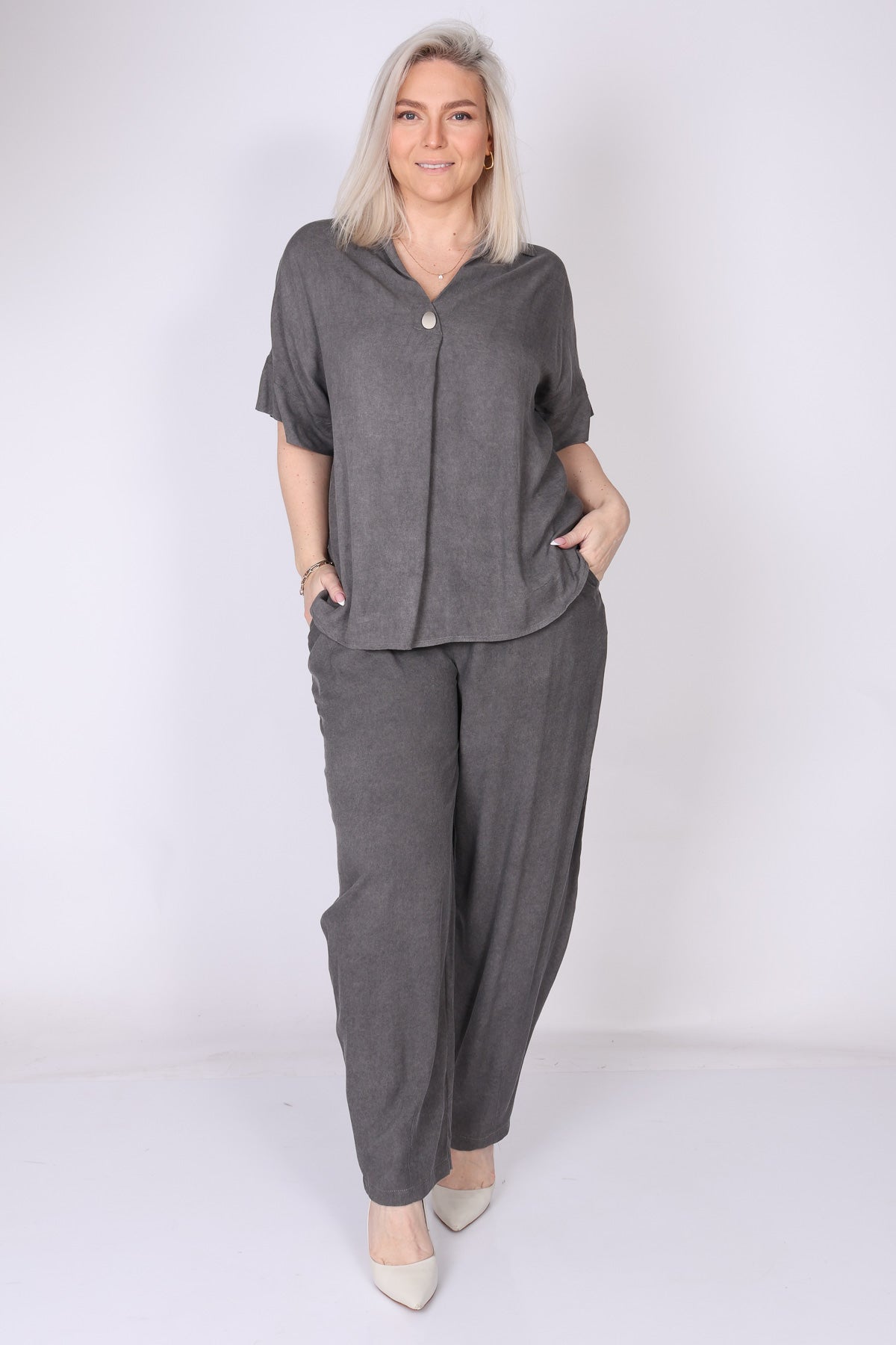 בד רך ונעים יחד עם גזרה מחמיאה שיוצרת מראה נקי ומדויק. ניתן להשלים את הלוק עם חולצה בסט תואם.