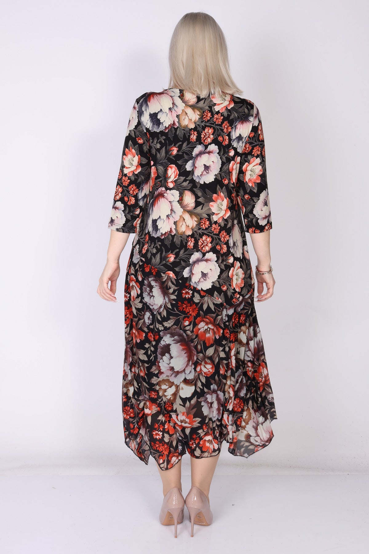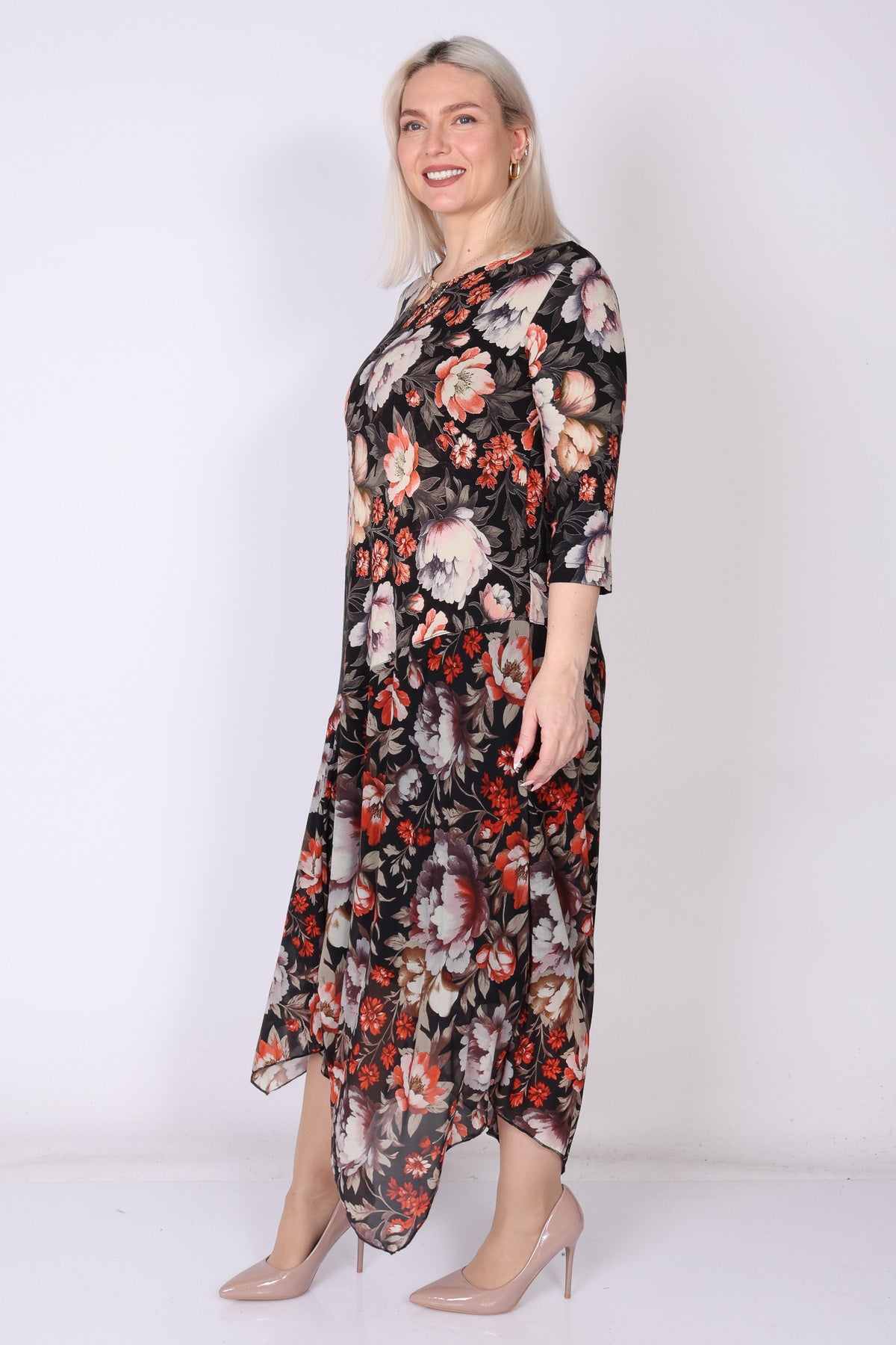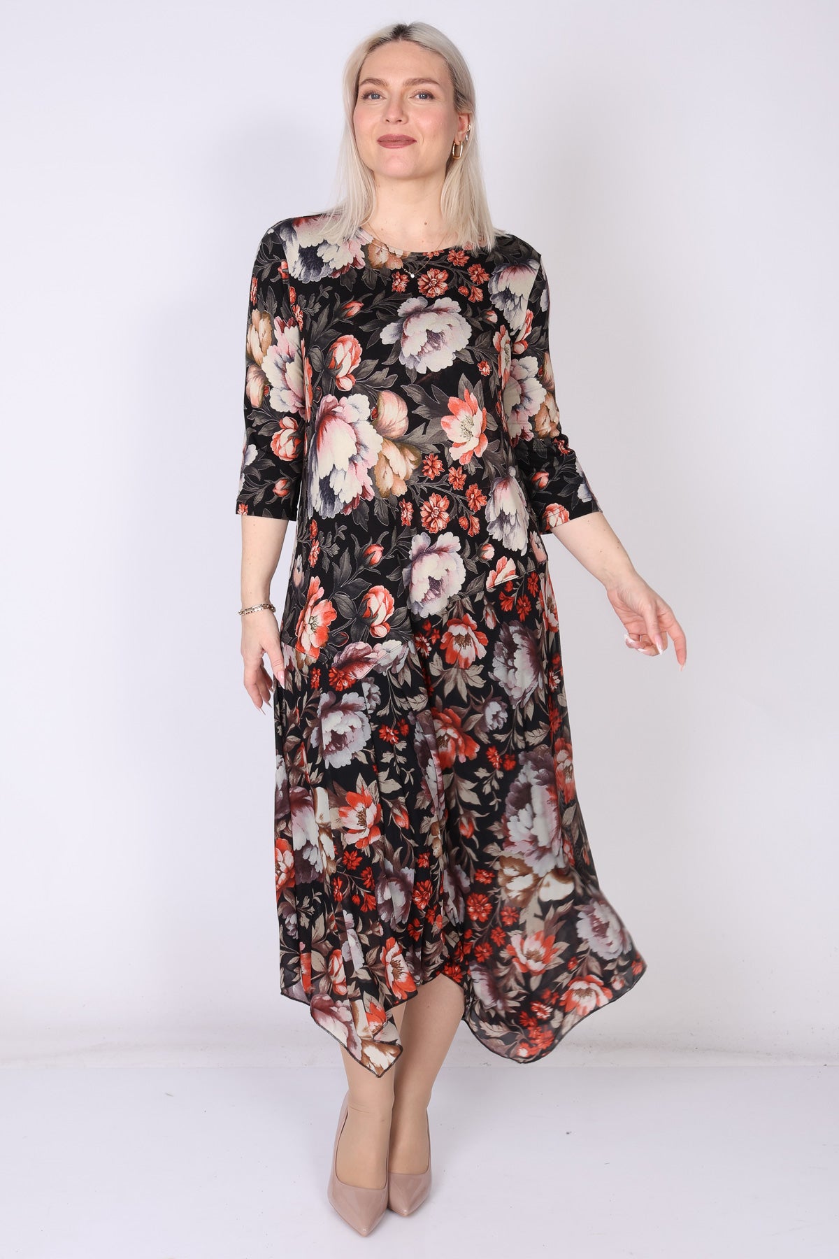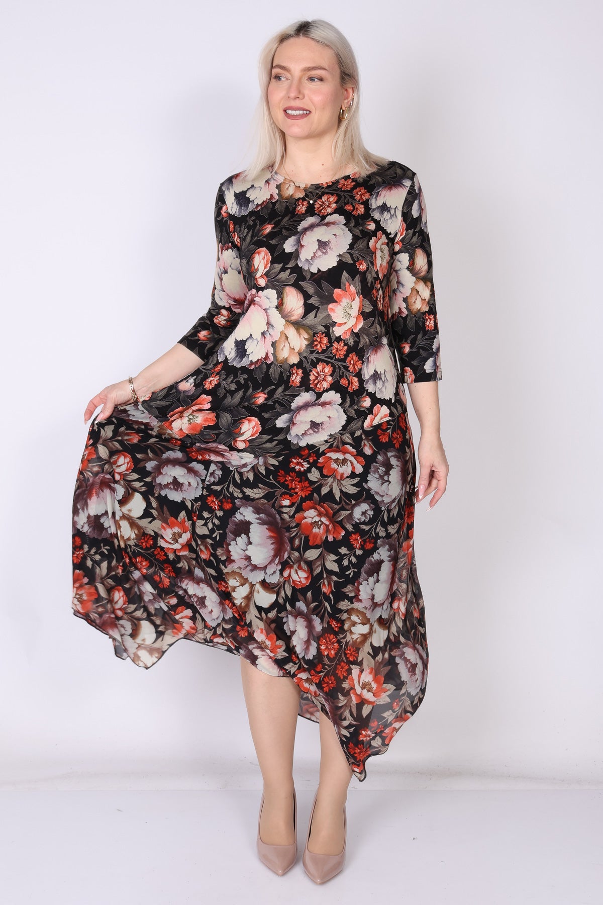 שמלה פרחונית מבד ויסקוזה בסיומת וולן א-סימטרית, מבד רשת עדינה, מפתח צוואר עגול ושרוולים המכסים את המרפק  פריט שמשדר נשפך קליל ונוכחות מוקפדת בכל מראה.