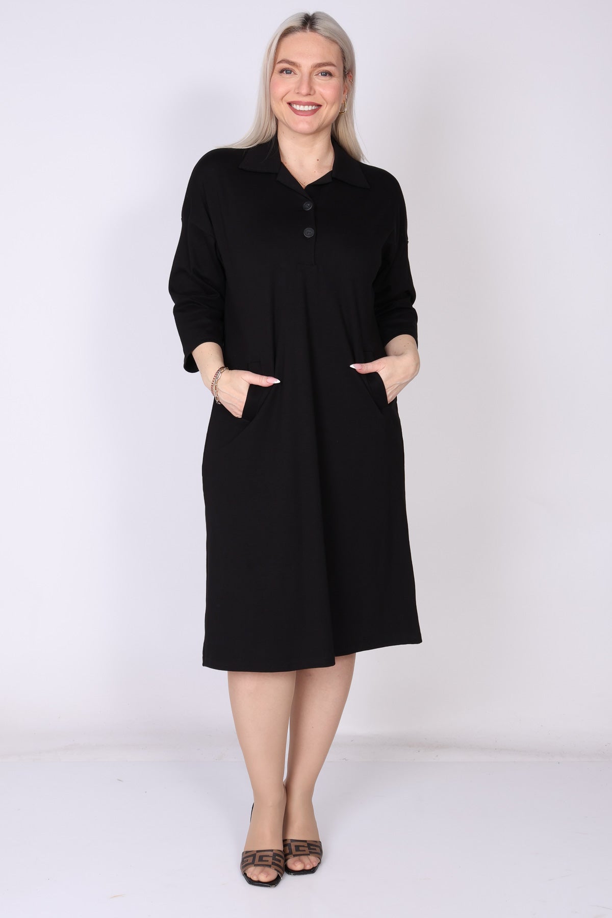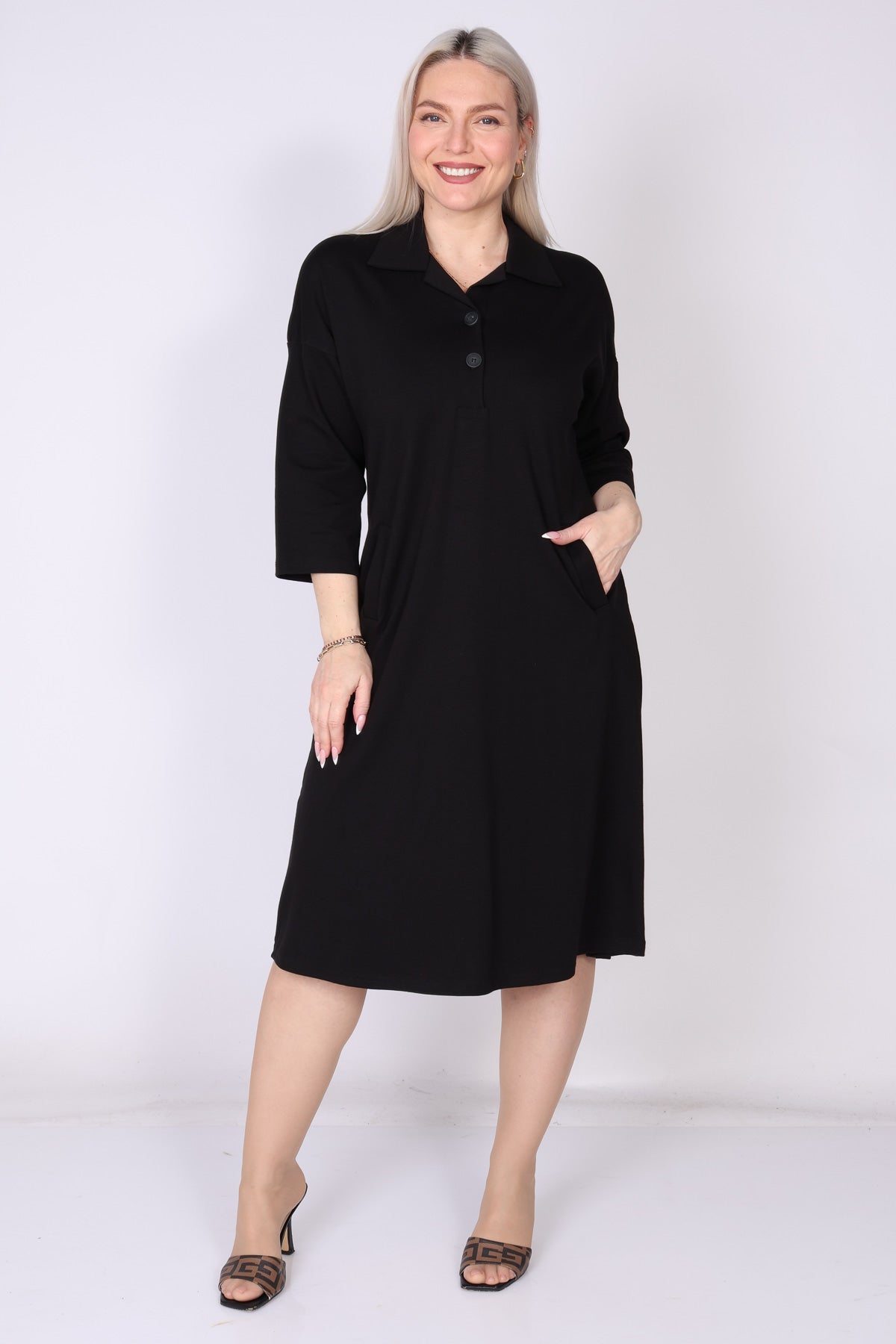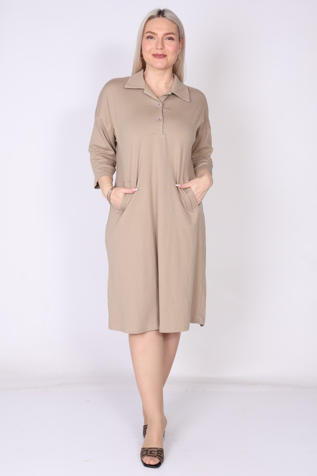 שמלת כותנה בגזרה מתרחבת קלות, נעימה ונוחה על הגוף. מפתח צוואר וי עם כפתורים וצווארון פולו מוסיפים טאץ’ קלאסי, ושרוולים המכסים את המרפק יחד עם כיסים משלימים מראה יומיומי אלגנטי ונוח.