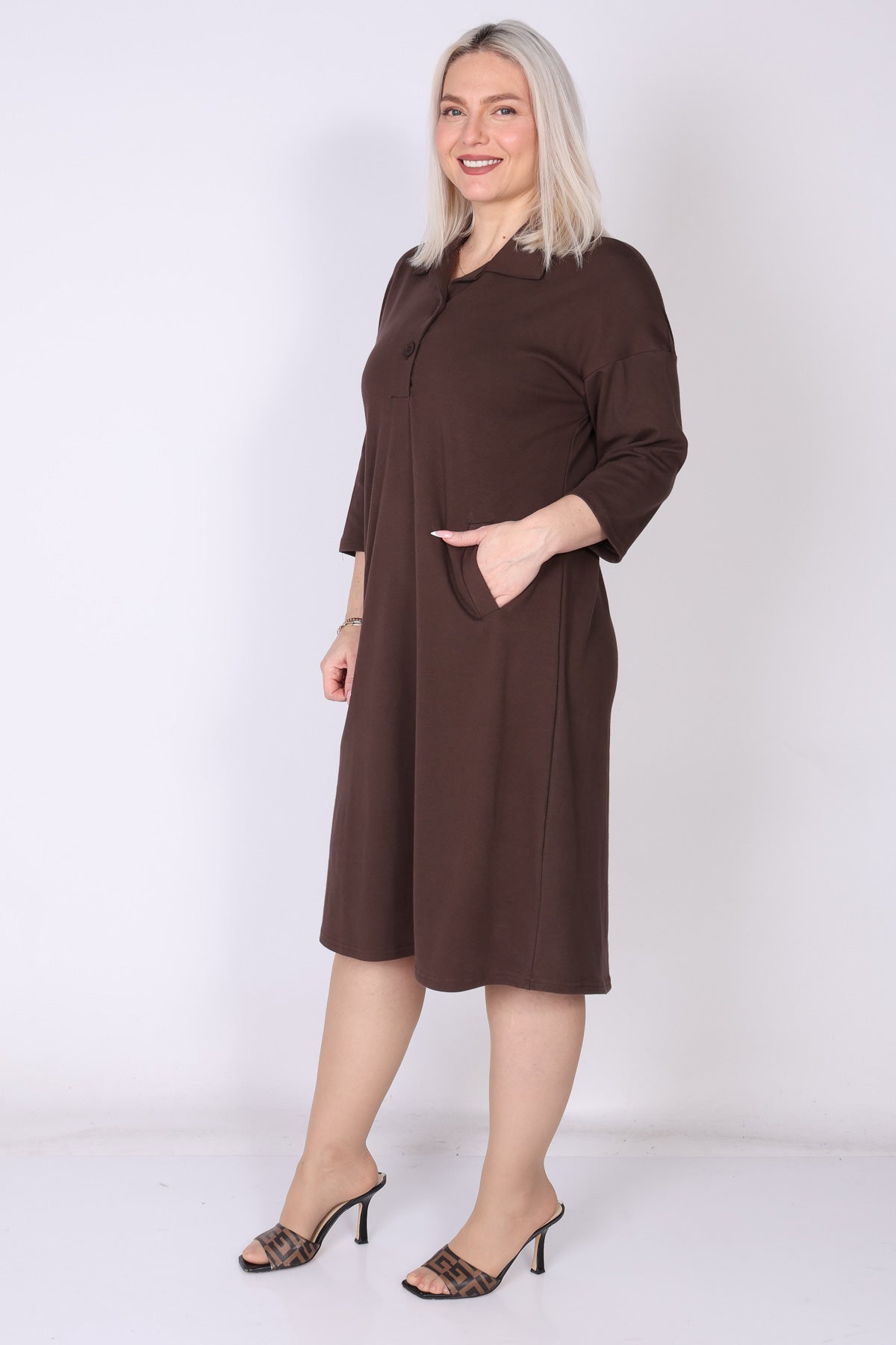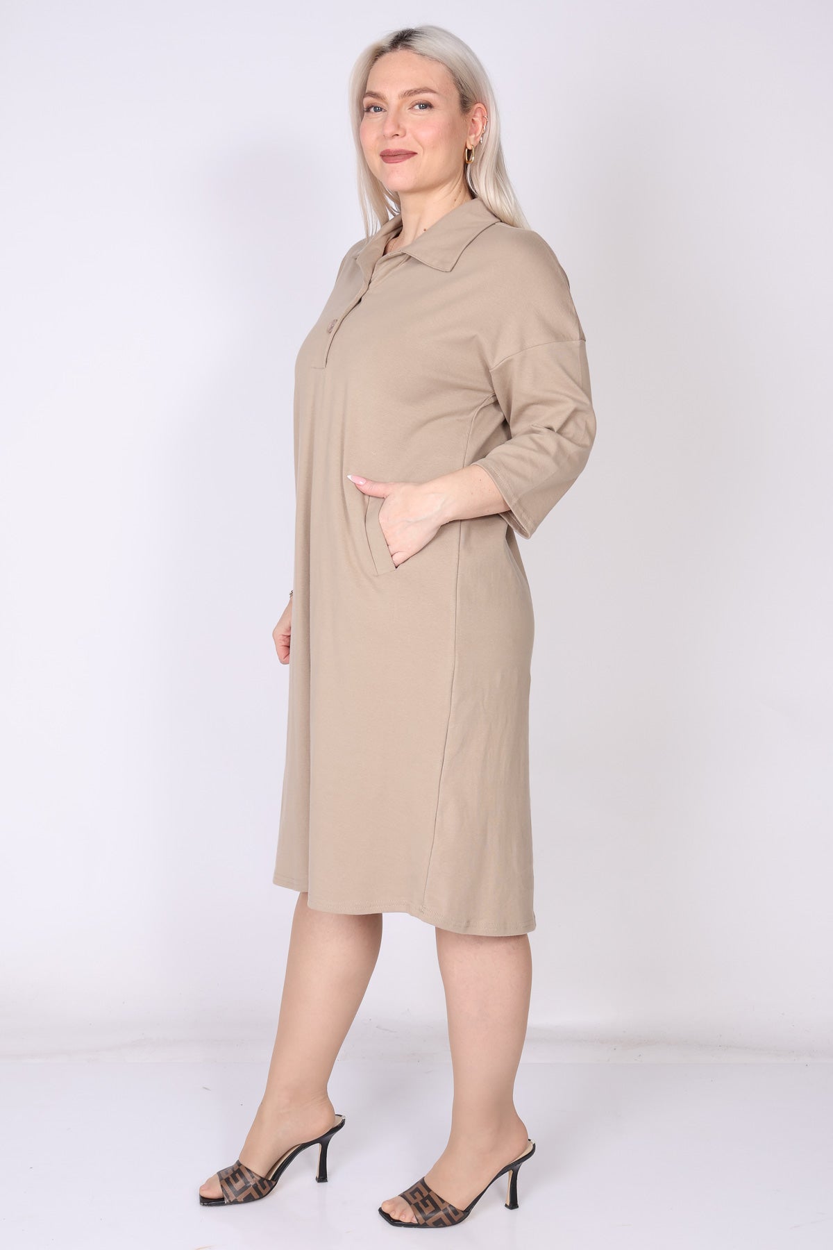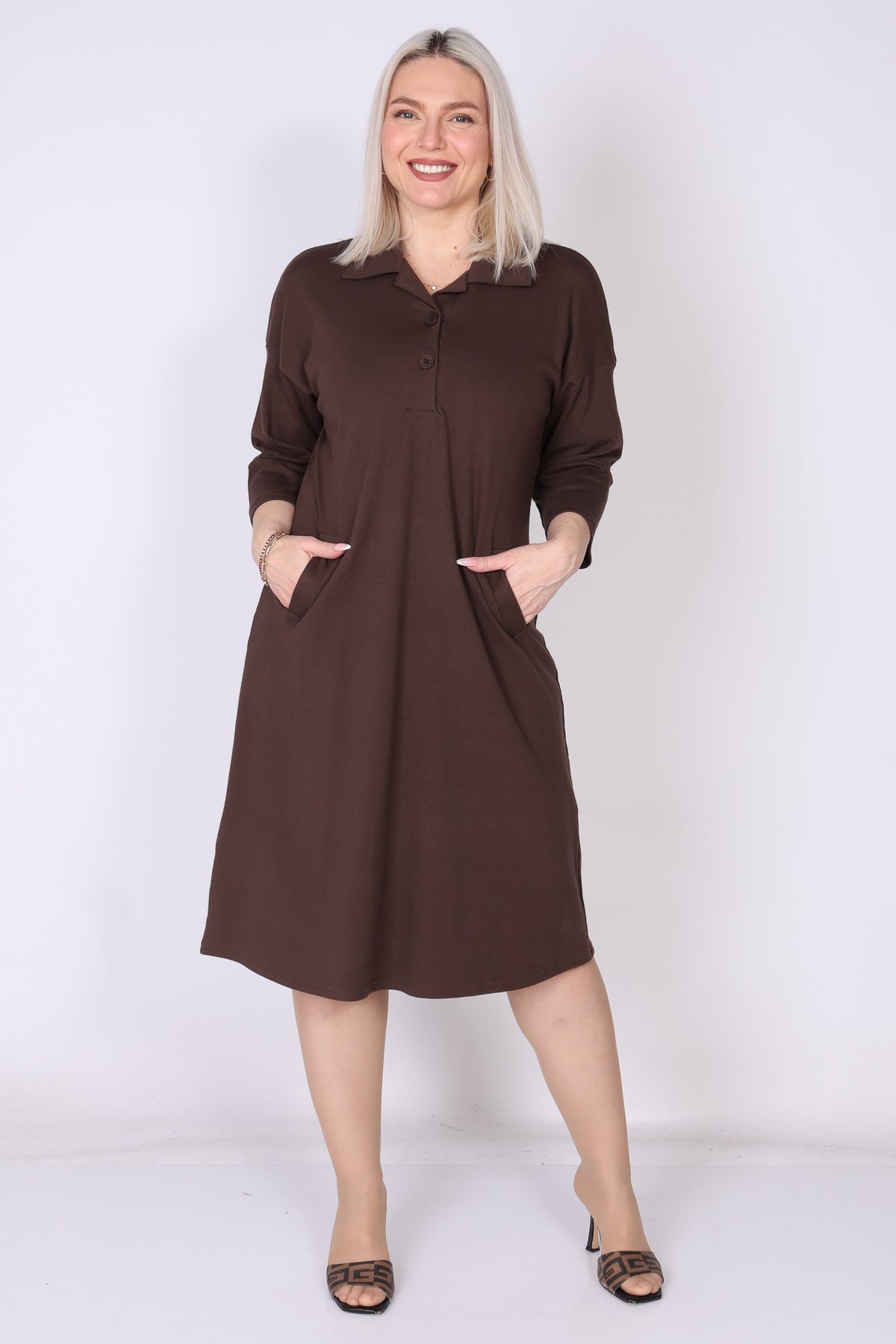 שמלת כותנה בגזרה מתרחבת קלות, נעימה ונוחה על הגוף. מפתח צוואר וי עם כפתורים וצווארון פולו מוסיפים טאץ’ קלאסי, ושרוולים המכסים את המרפק יחד עם כיסים משלימים מראה יומיומי אלגנטי ונוח.