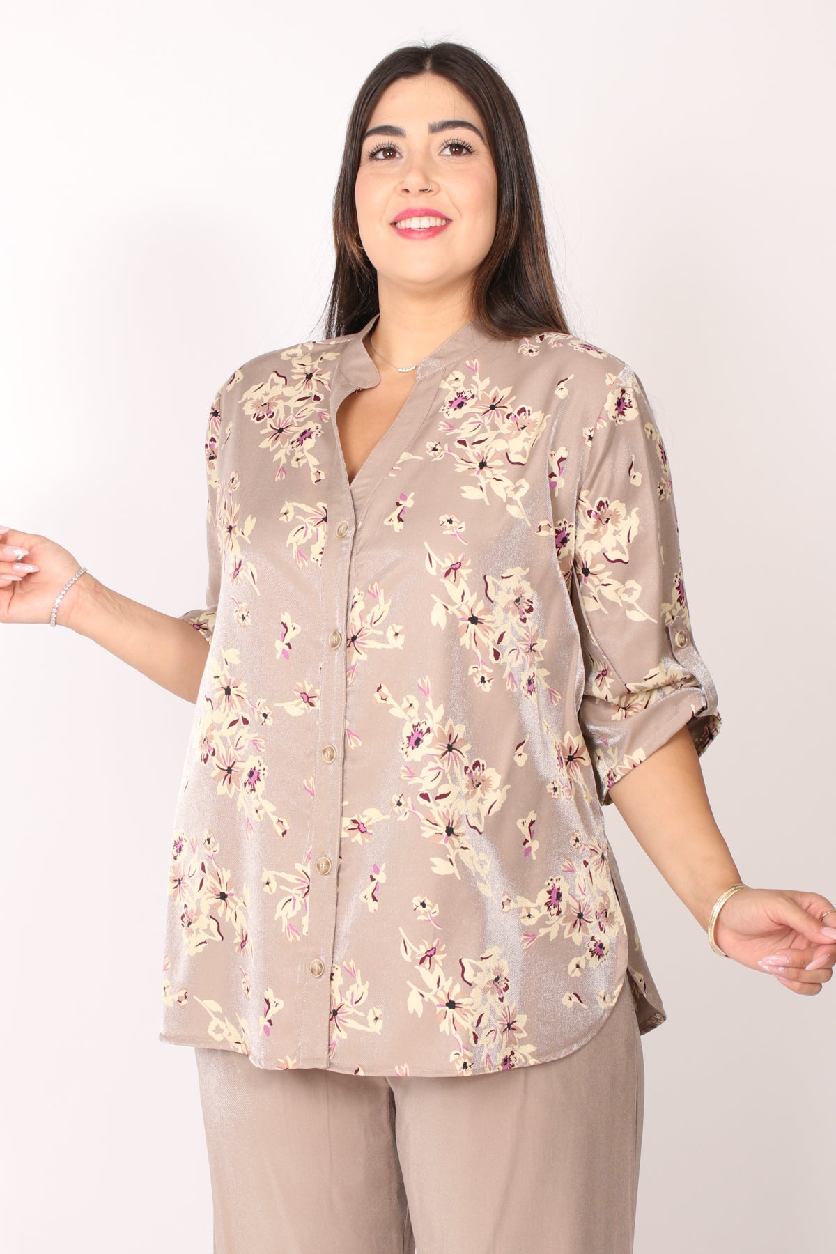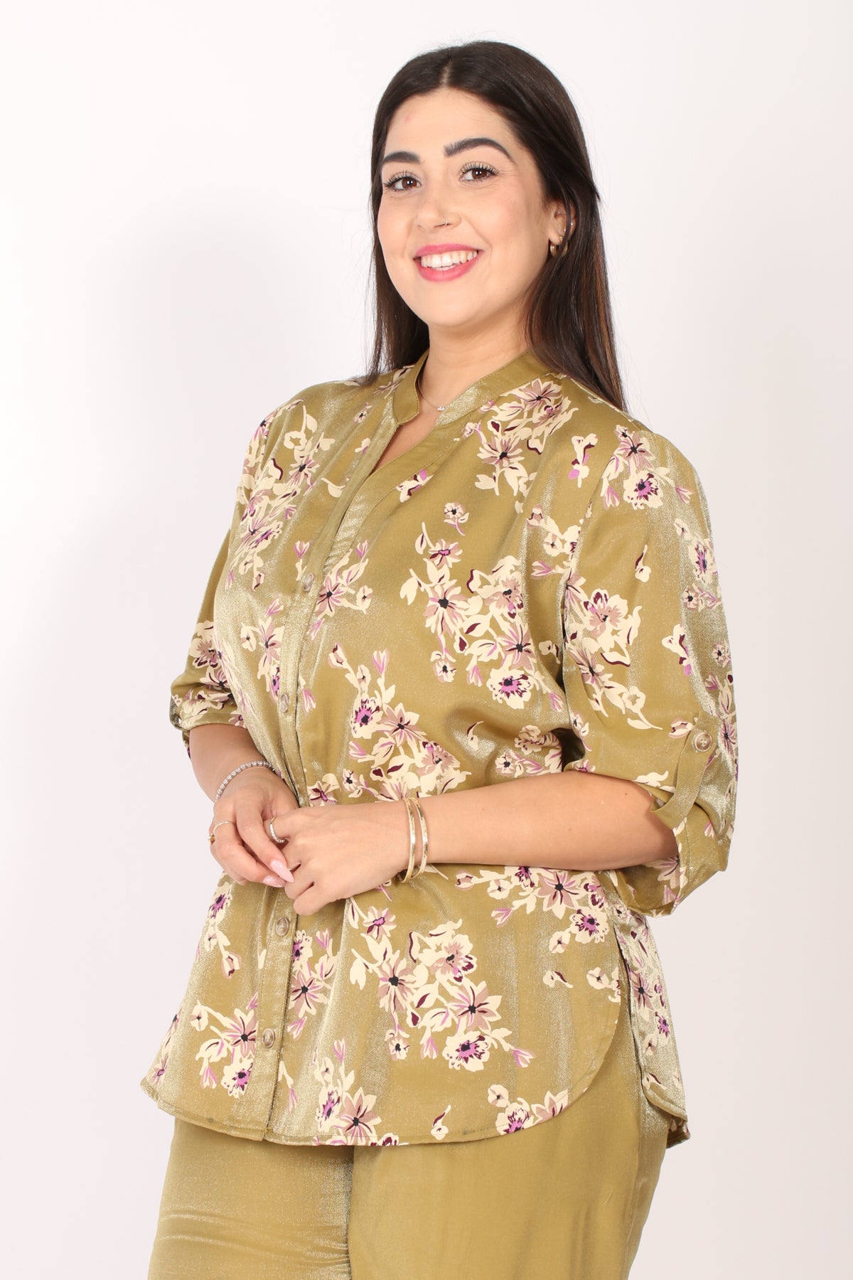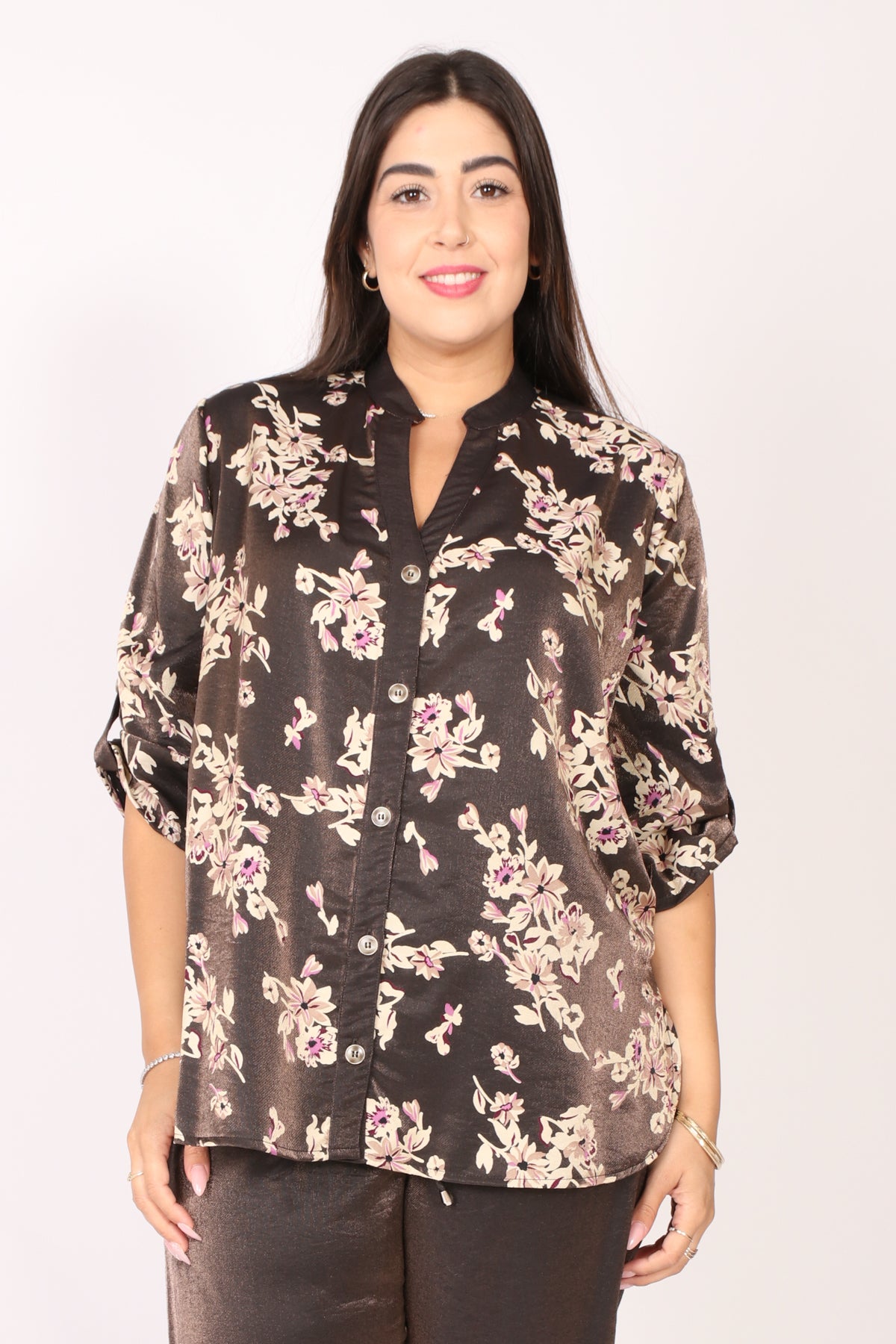 - חולצת אריג מכופתרת מבד מודפס בפרחים אלגנטיים