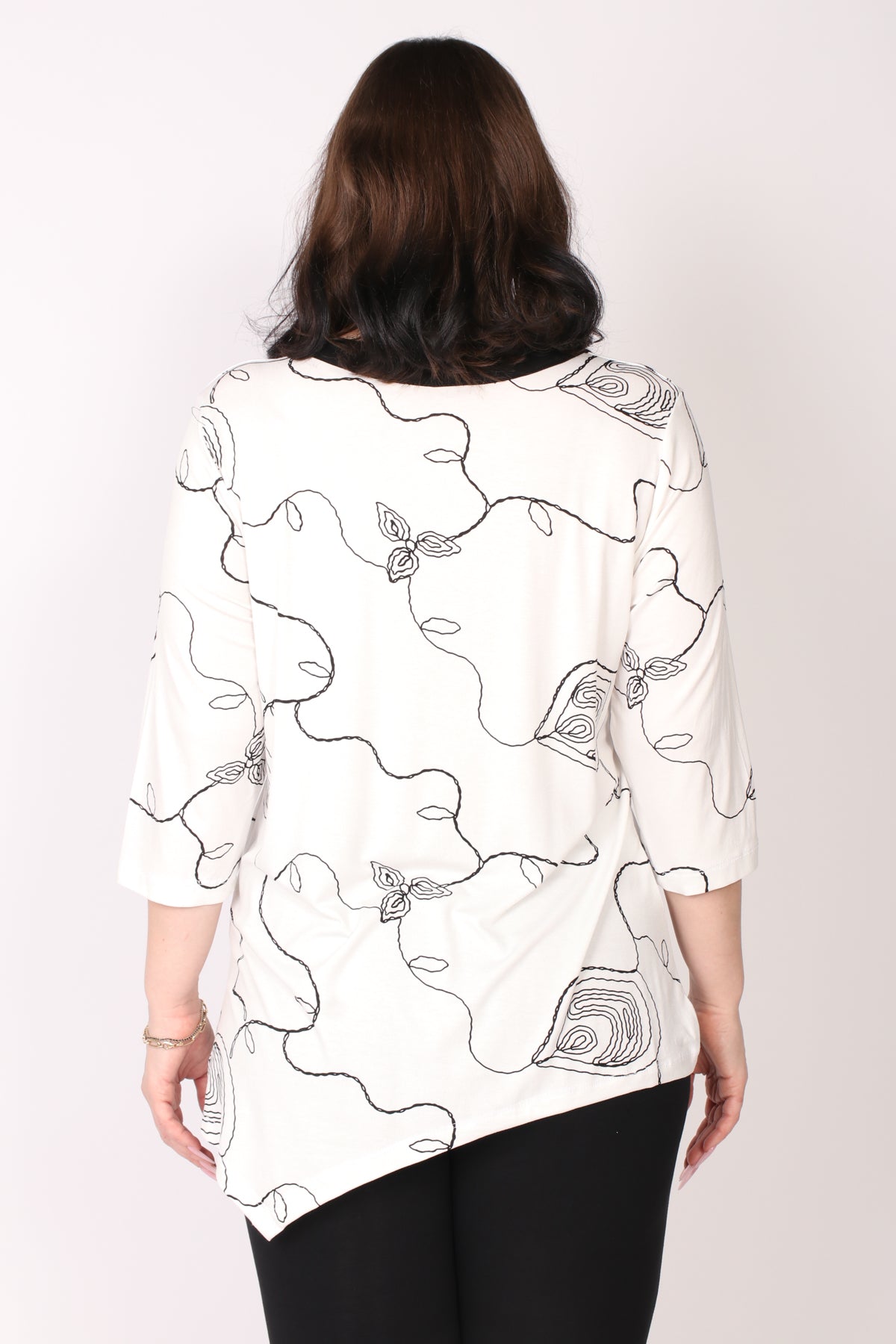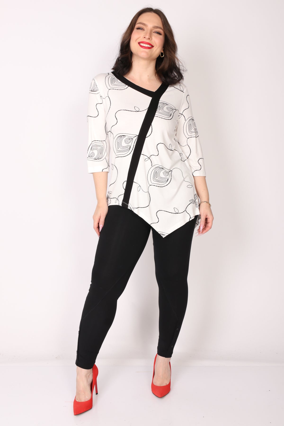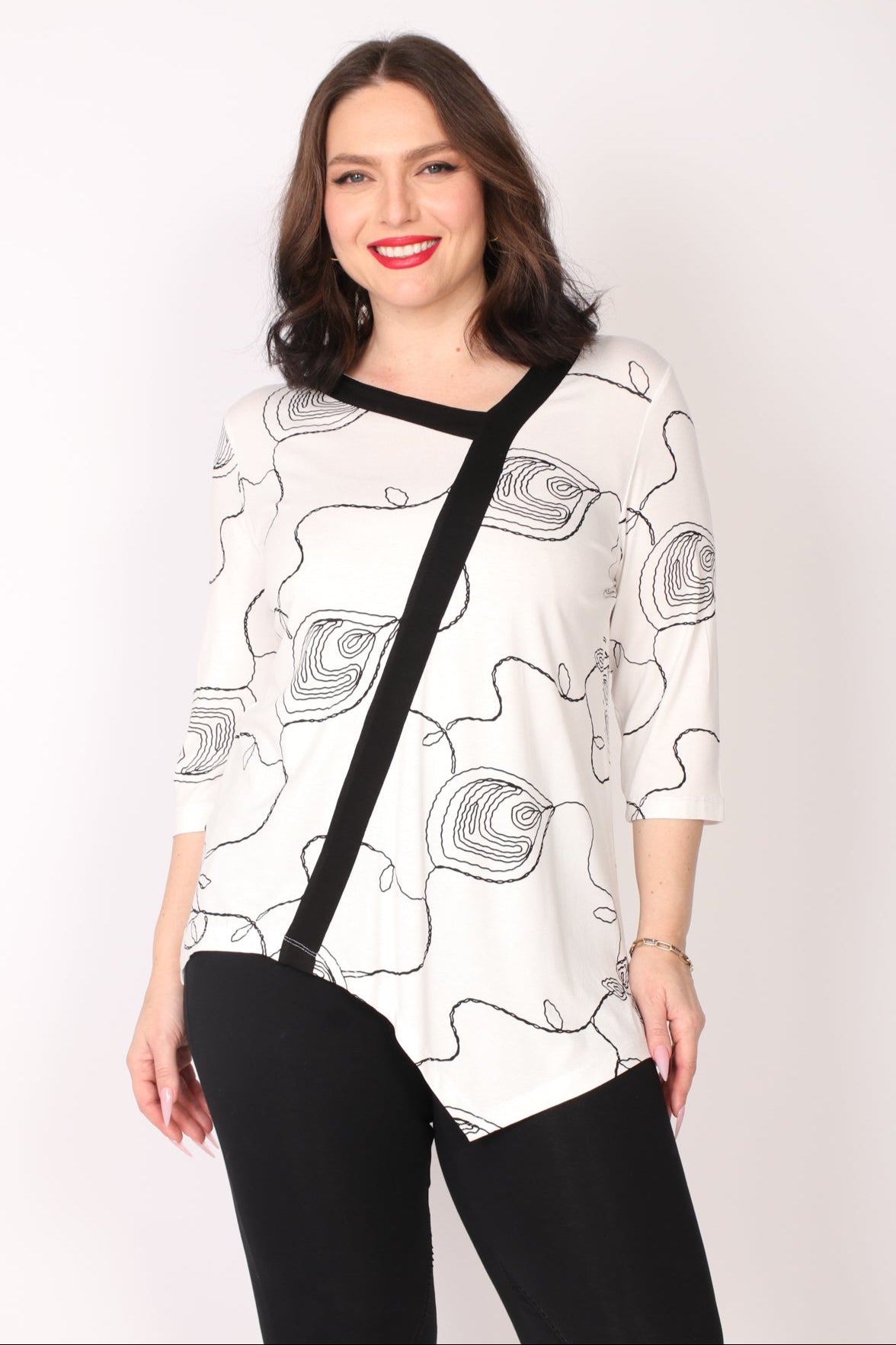 - טוניקת מודפסת בצבעים מונוכרומטיים בסיומת א-סימטרית עם סרט אלכסוני