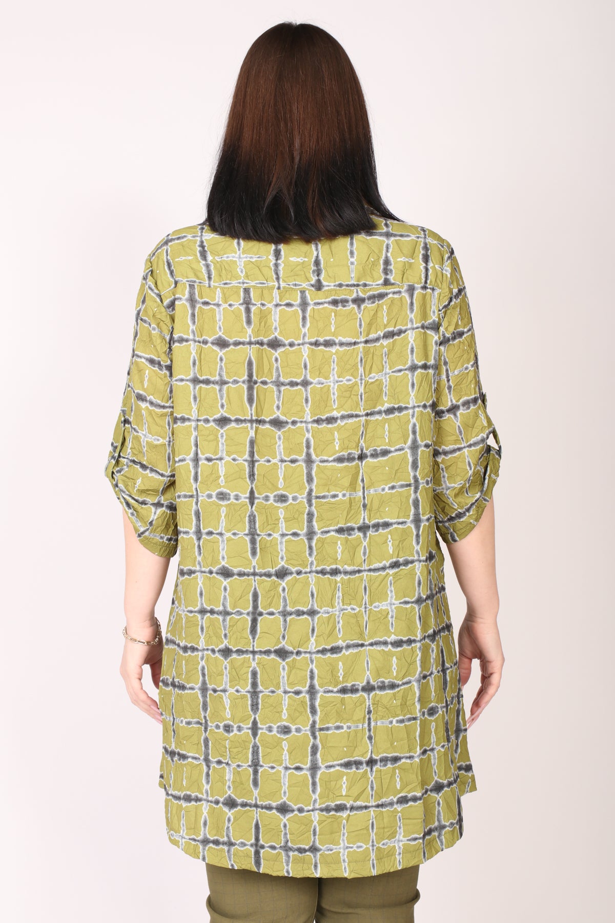 - עליונית אריג מכופתרת מבד מקומט ומודפס