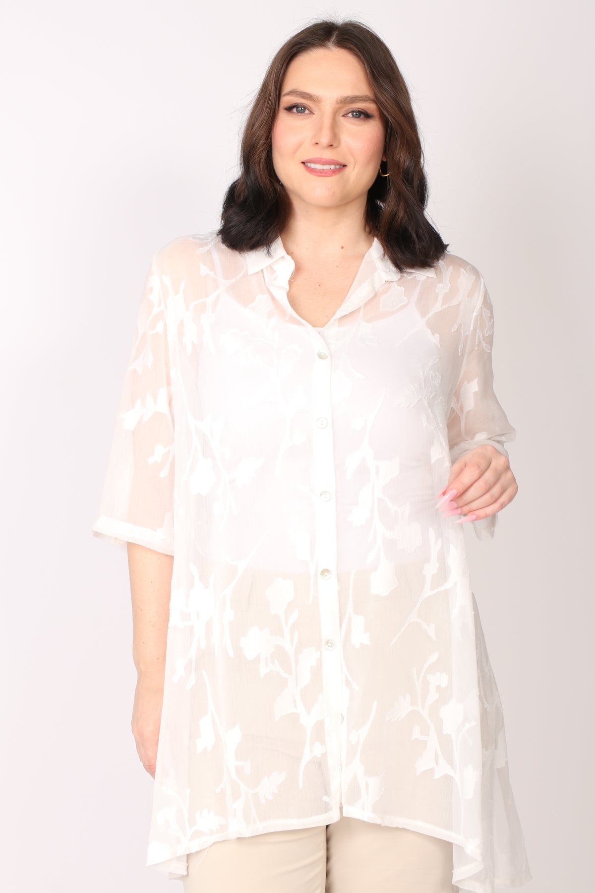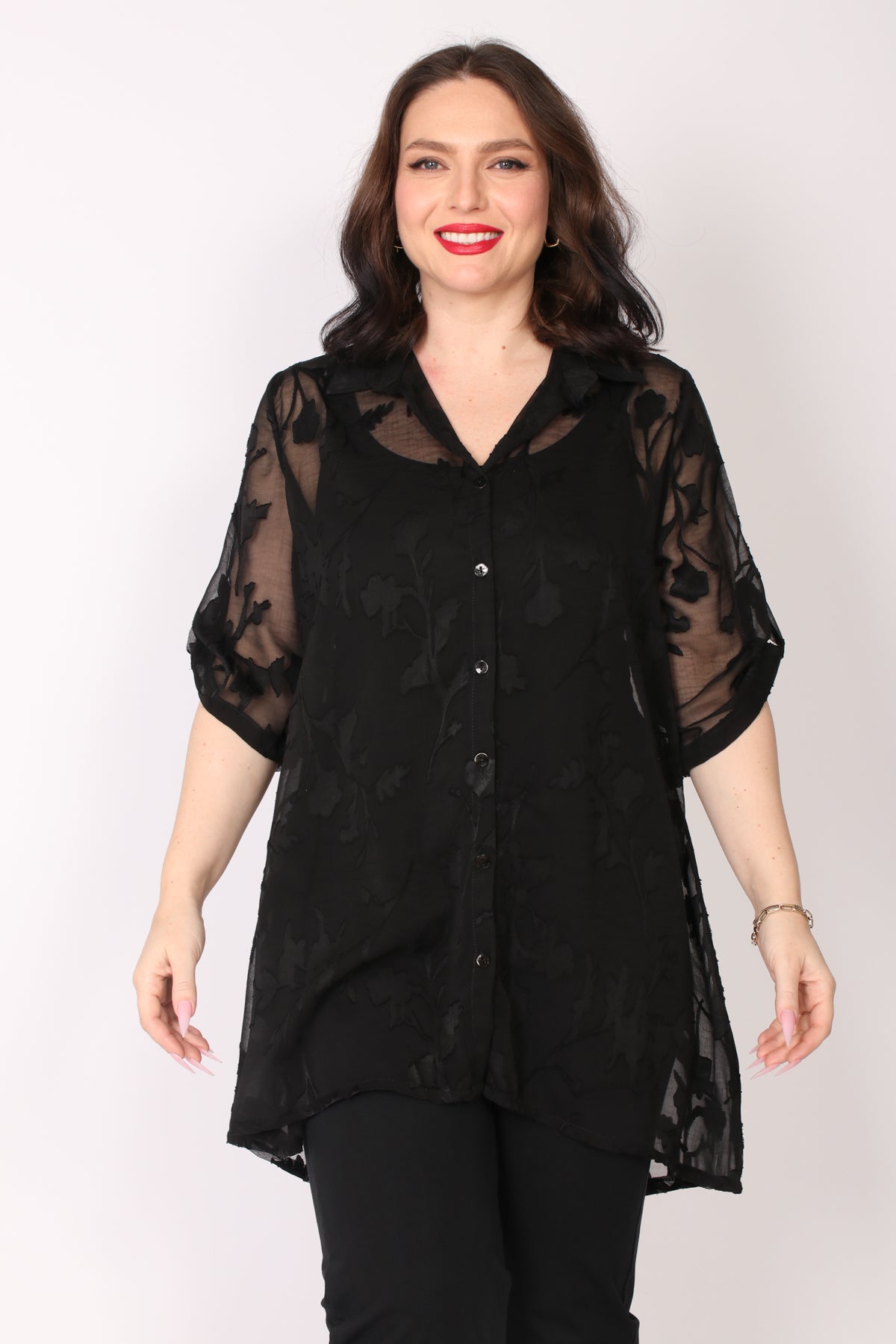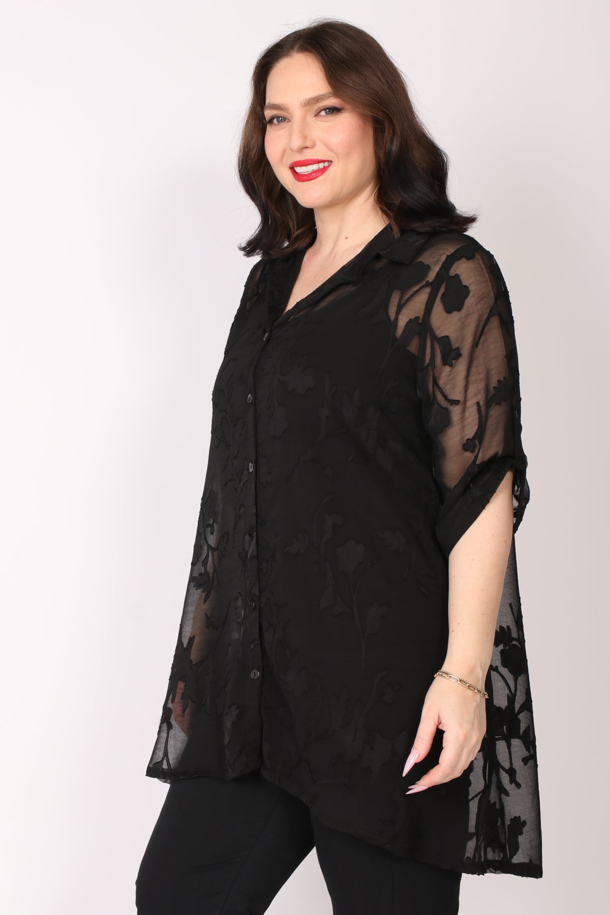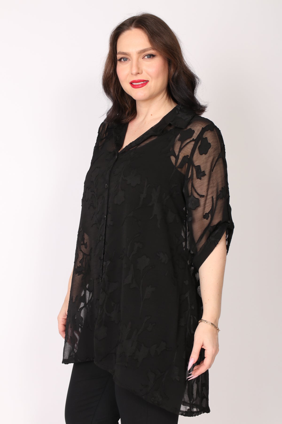 - עליונית מכופתרת מבד שיפון פרחים בגזרה מתרחבת