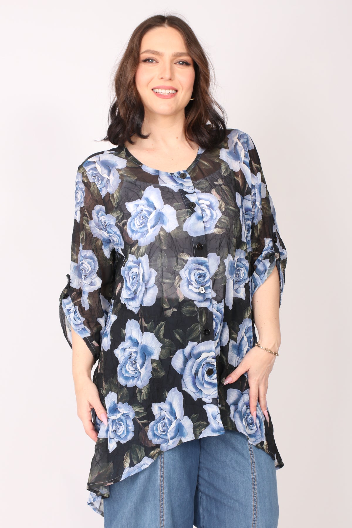 - שרוולי 3/4 בקיפול שרוך וכפתור, מפתח צוואר עגול