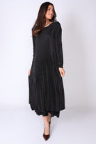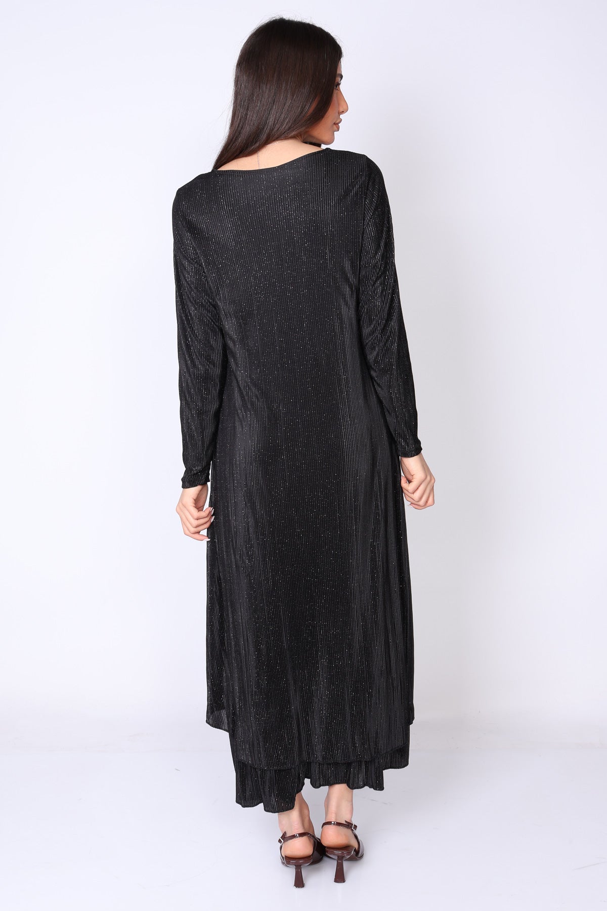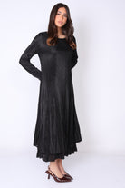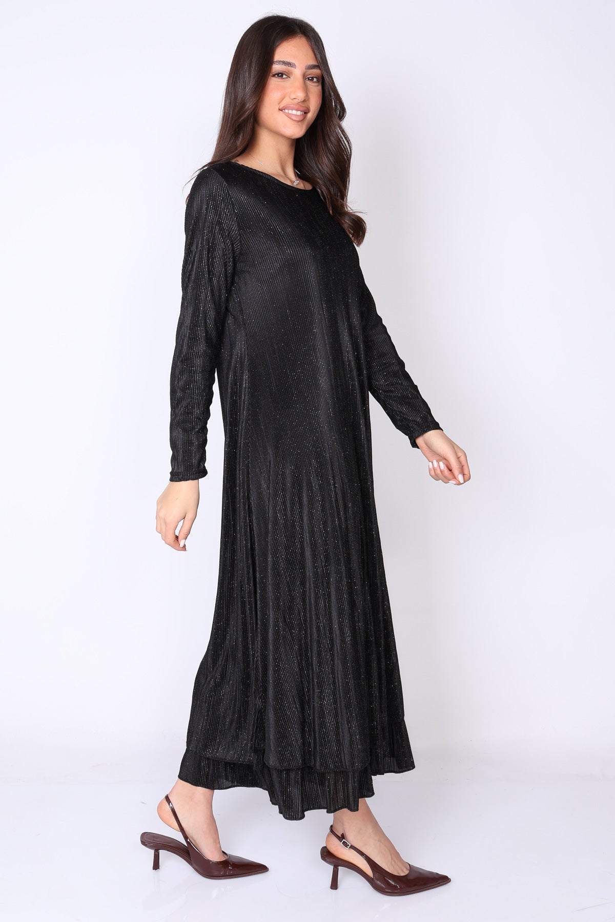 שמלת ערב מבד לורקס במראה יוקרתי, בגזרה נשפכת עם סיומת וולנים נשית ועדינה. מפתח צוואר עגול ושרוולים ארוכים משלימים את המראה האלגנטי, עם נפילה מחמיאה שמעניקה תחושת קלילות ויוקרה בו זמנית.