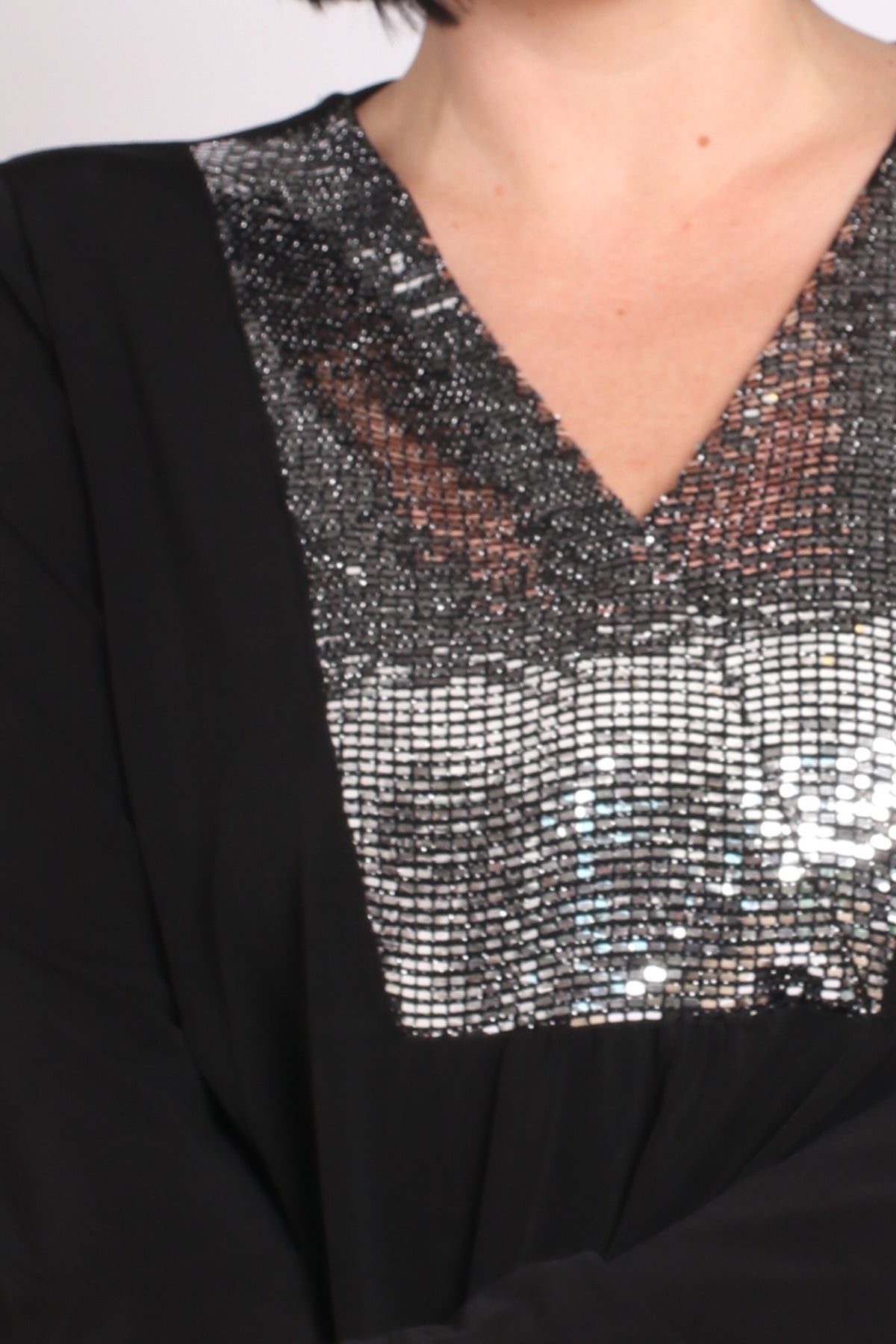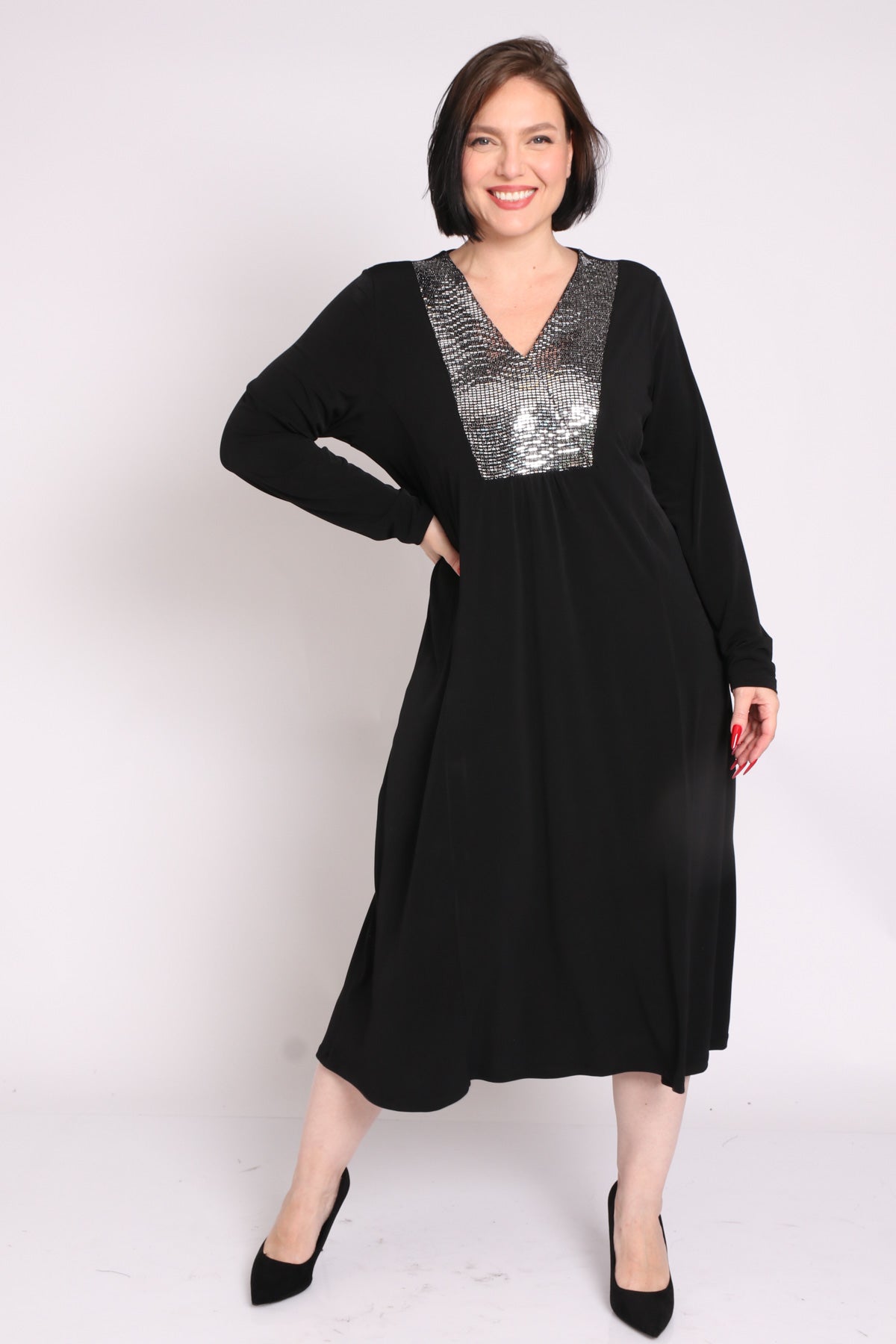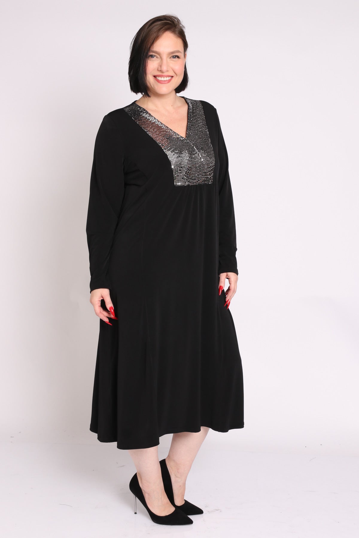 • שמלת ערב בגזרה מתרחבת מקו החזה ומטה עם עיטור פאייטים עשיר בחזה
