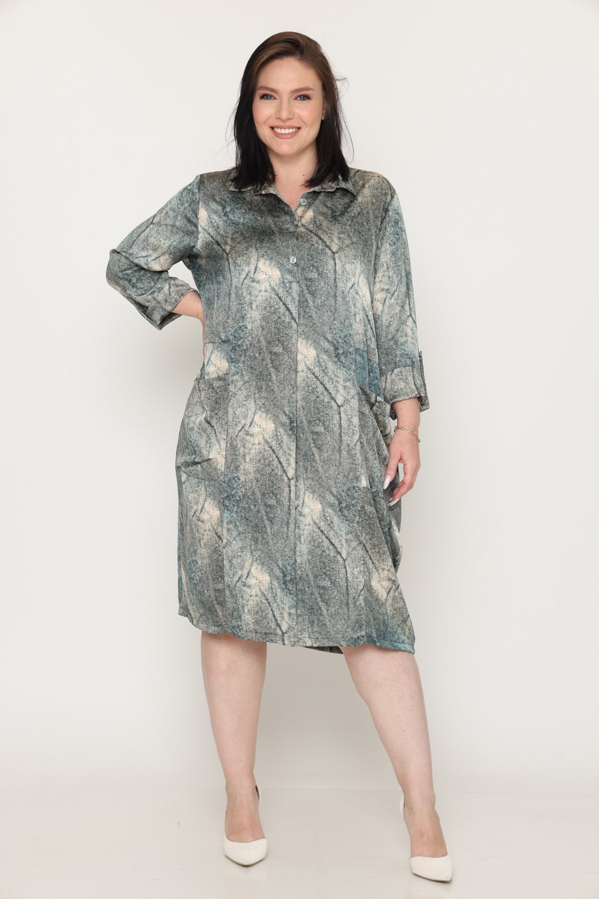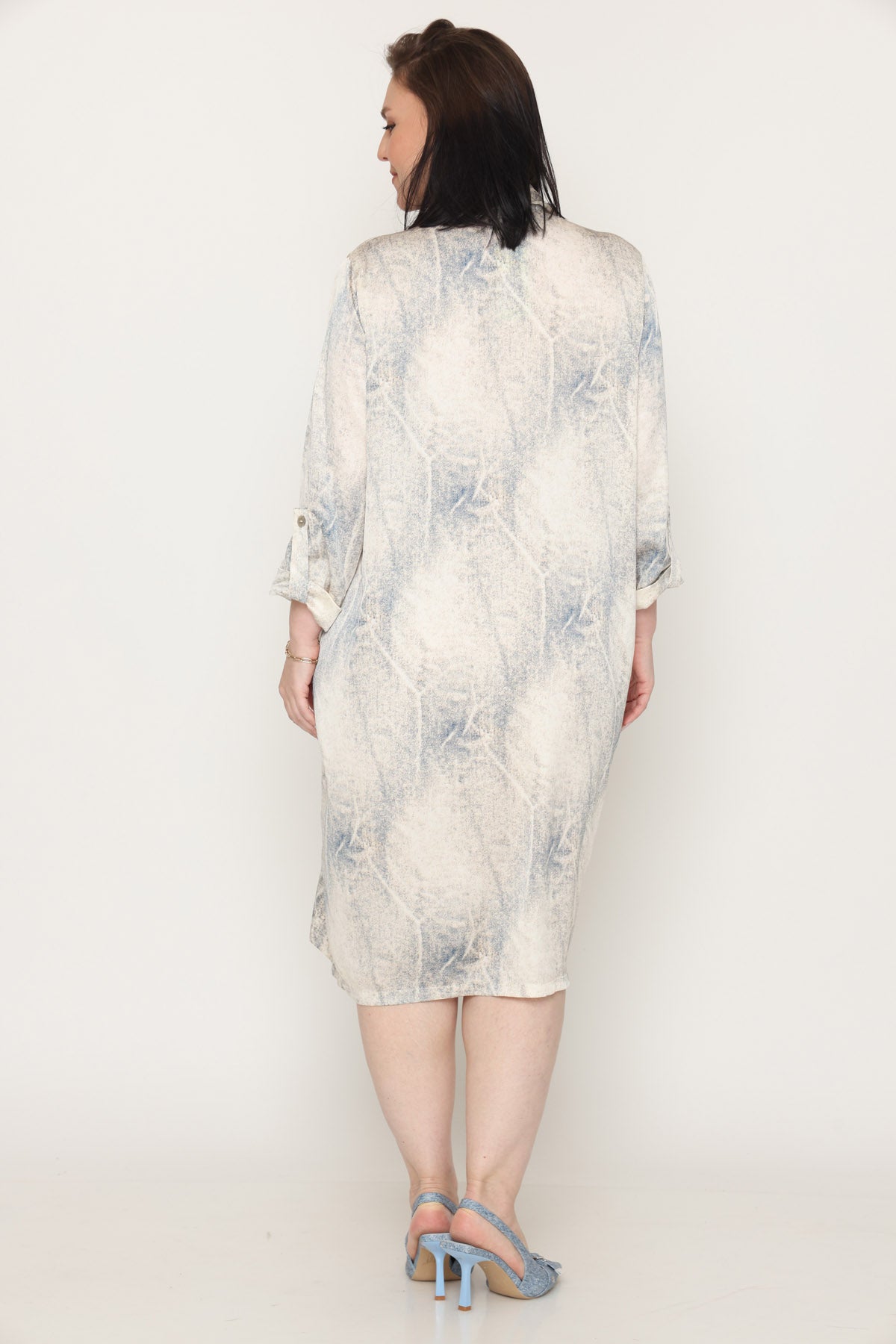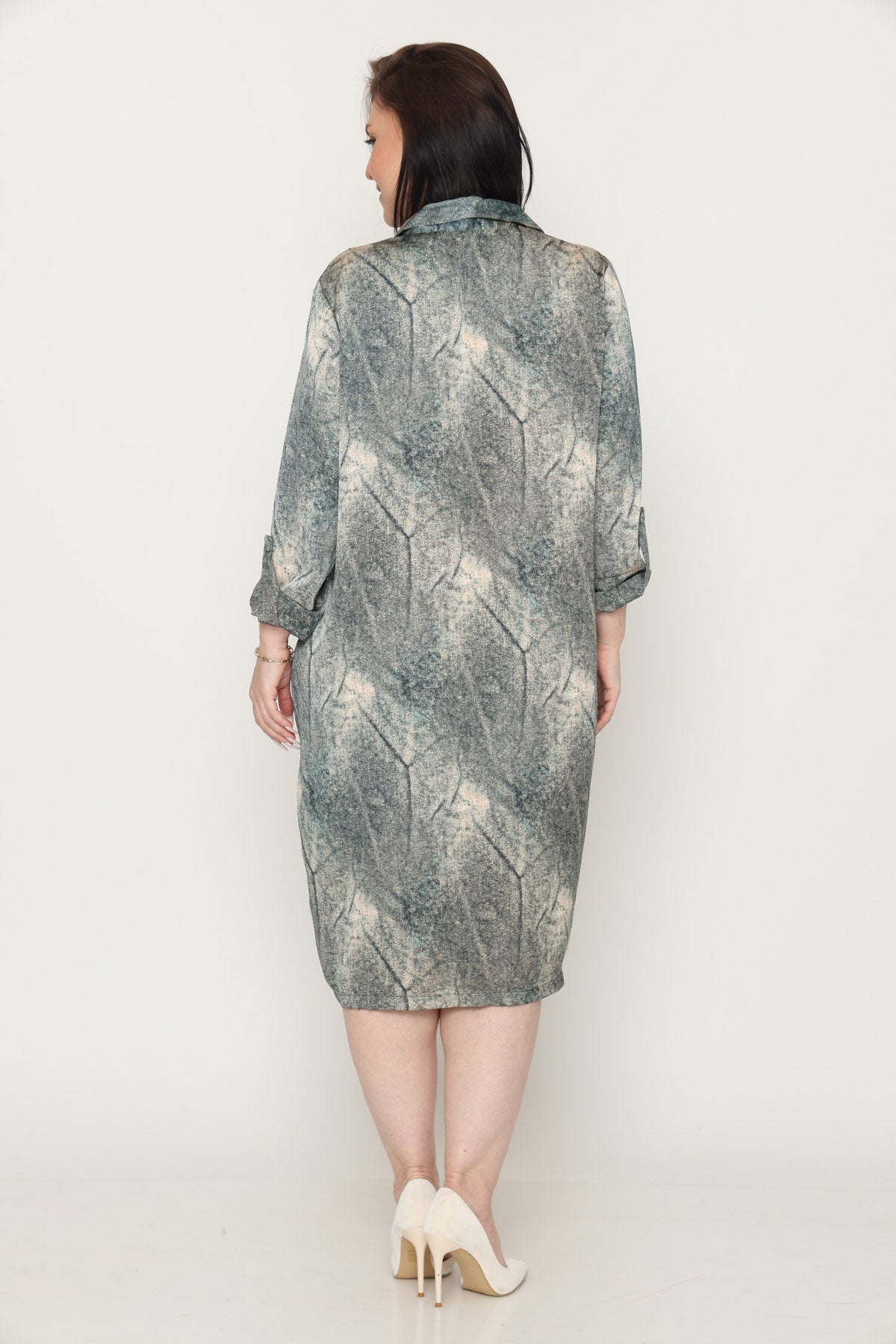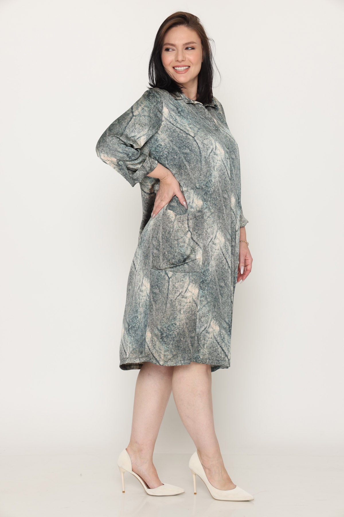 - שמלה באורך הברך מבד מודפס עם צווארון פולו וסגירת 3 כפתורים