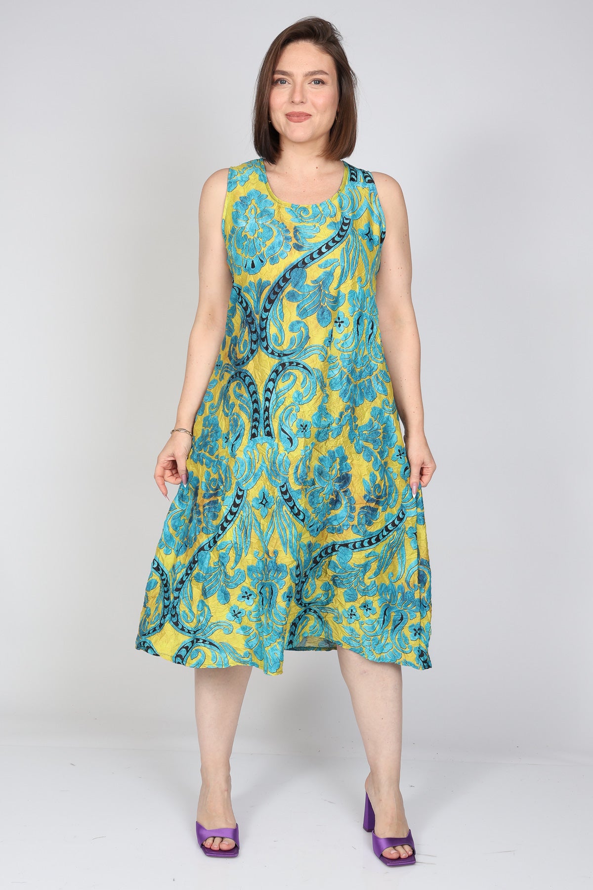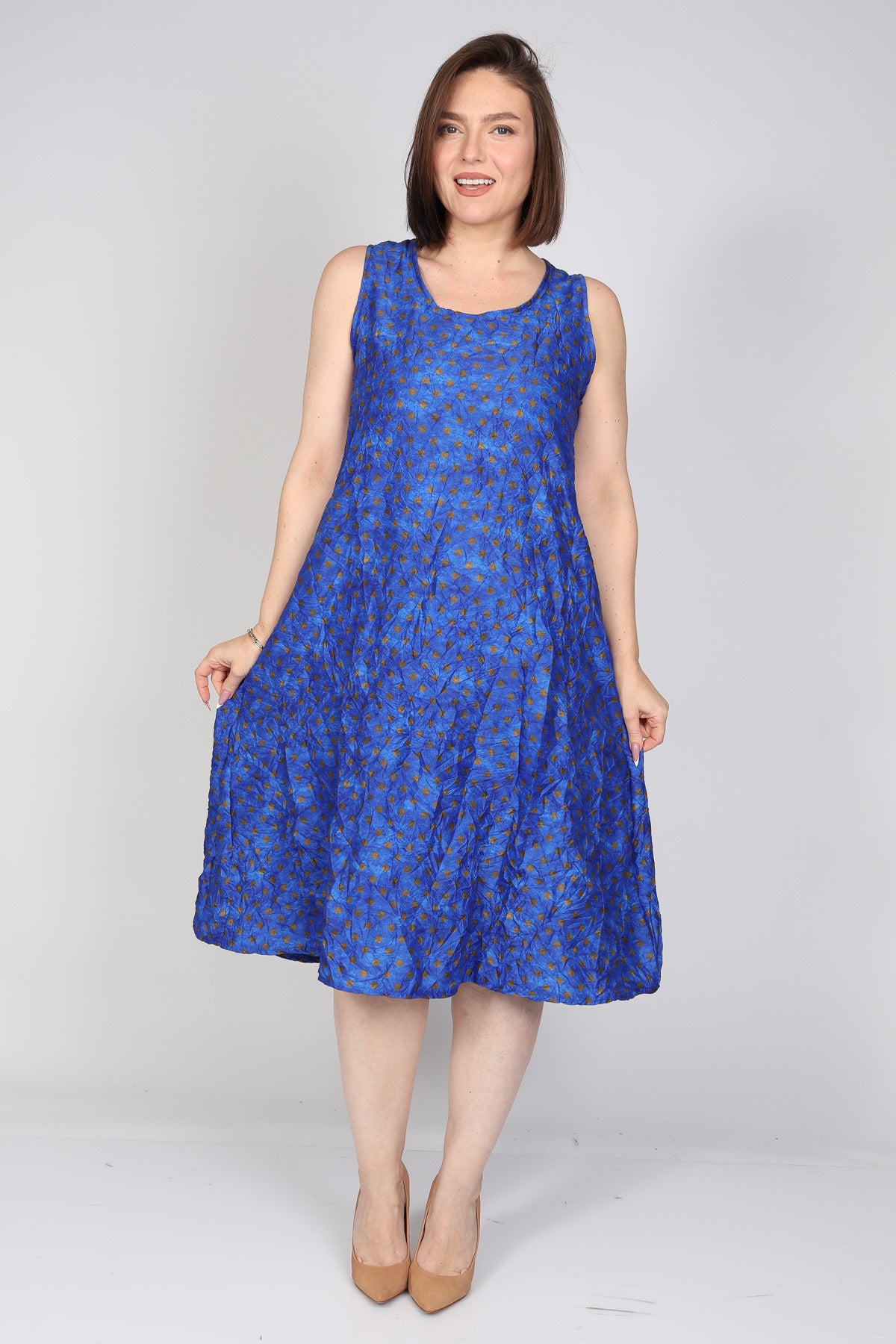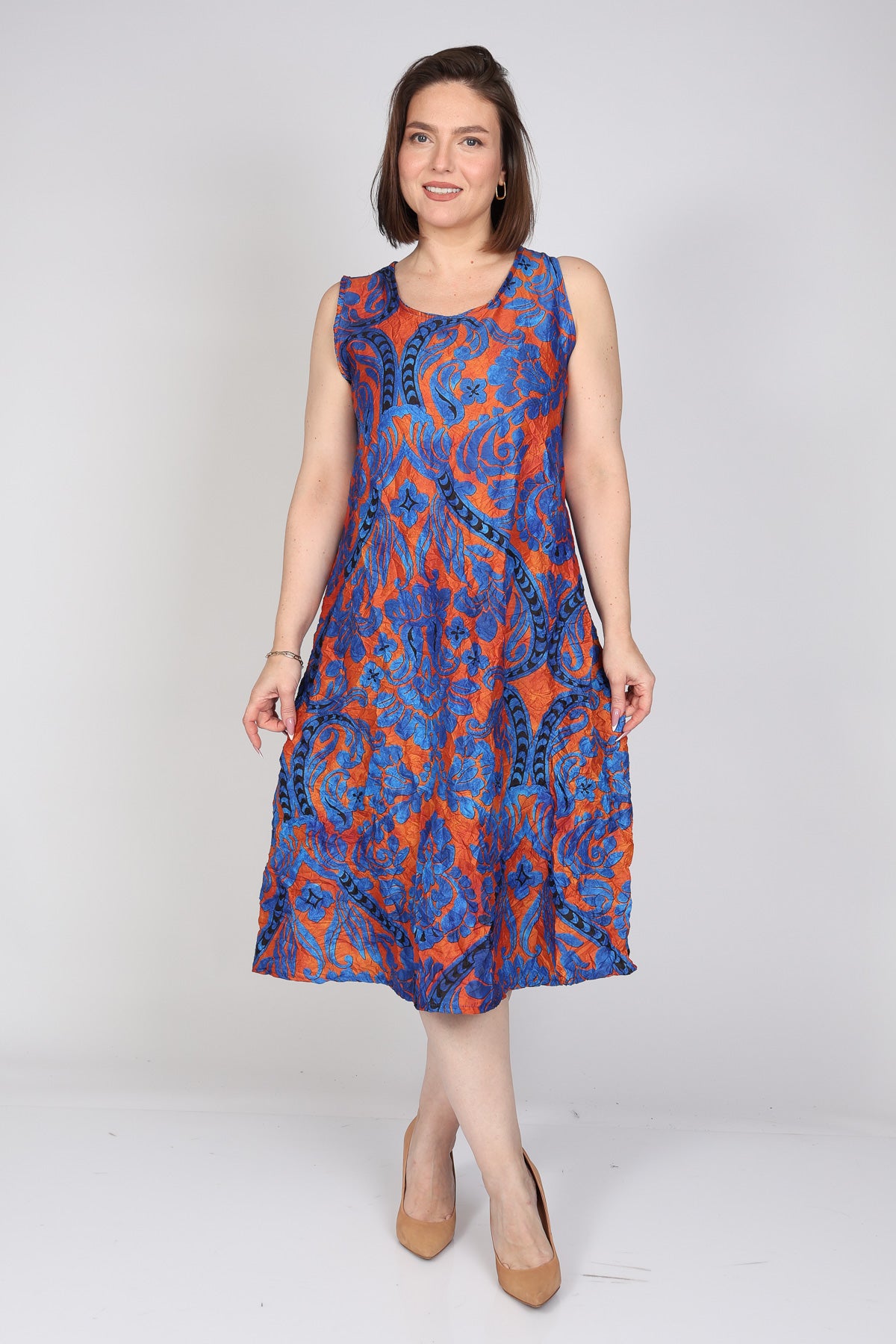 - שמלת גופייה בגזרת קומות מבד אריג מודפס