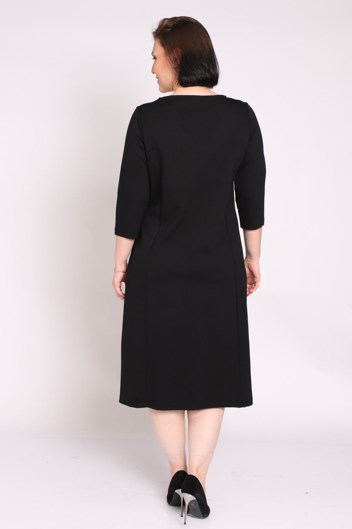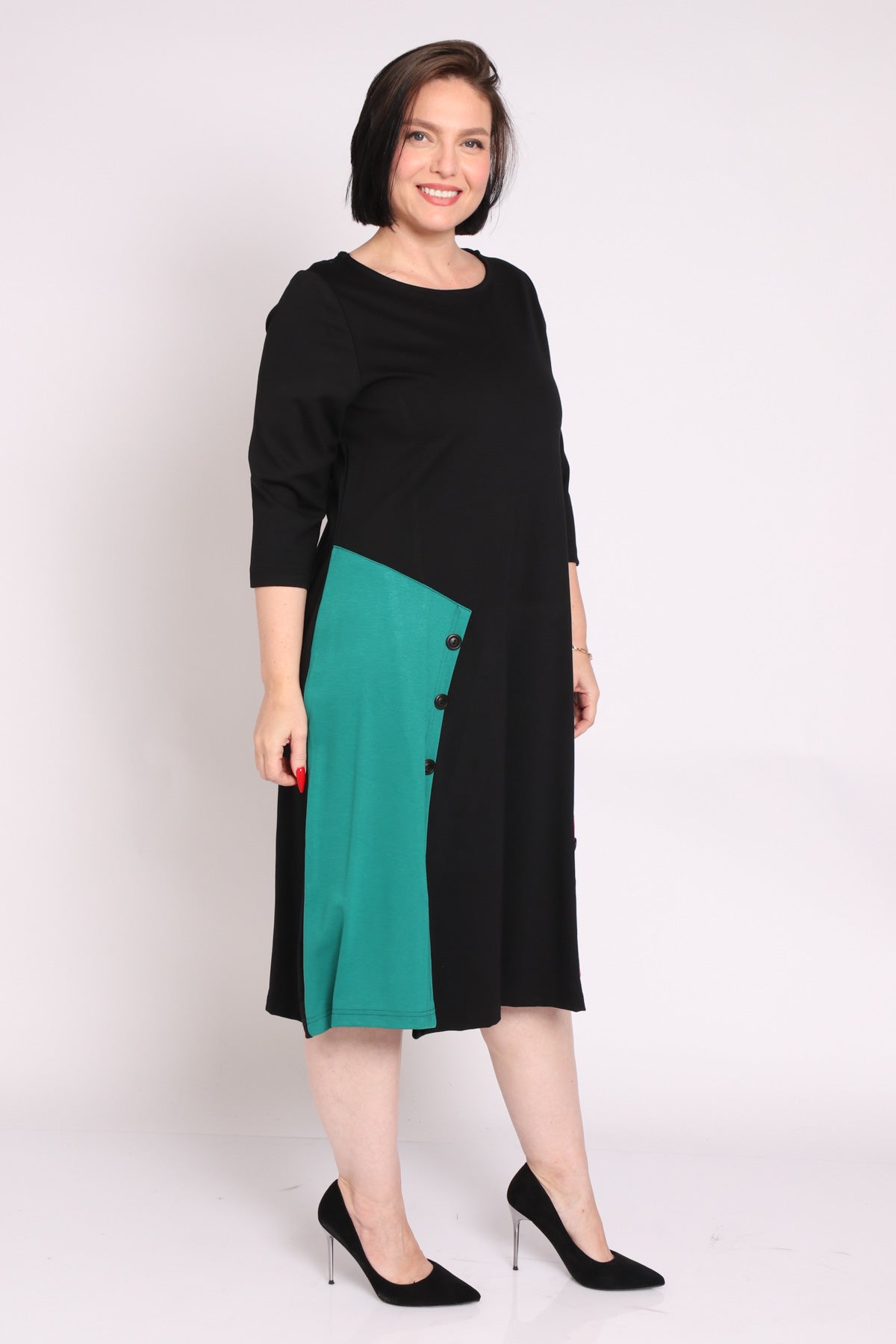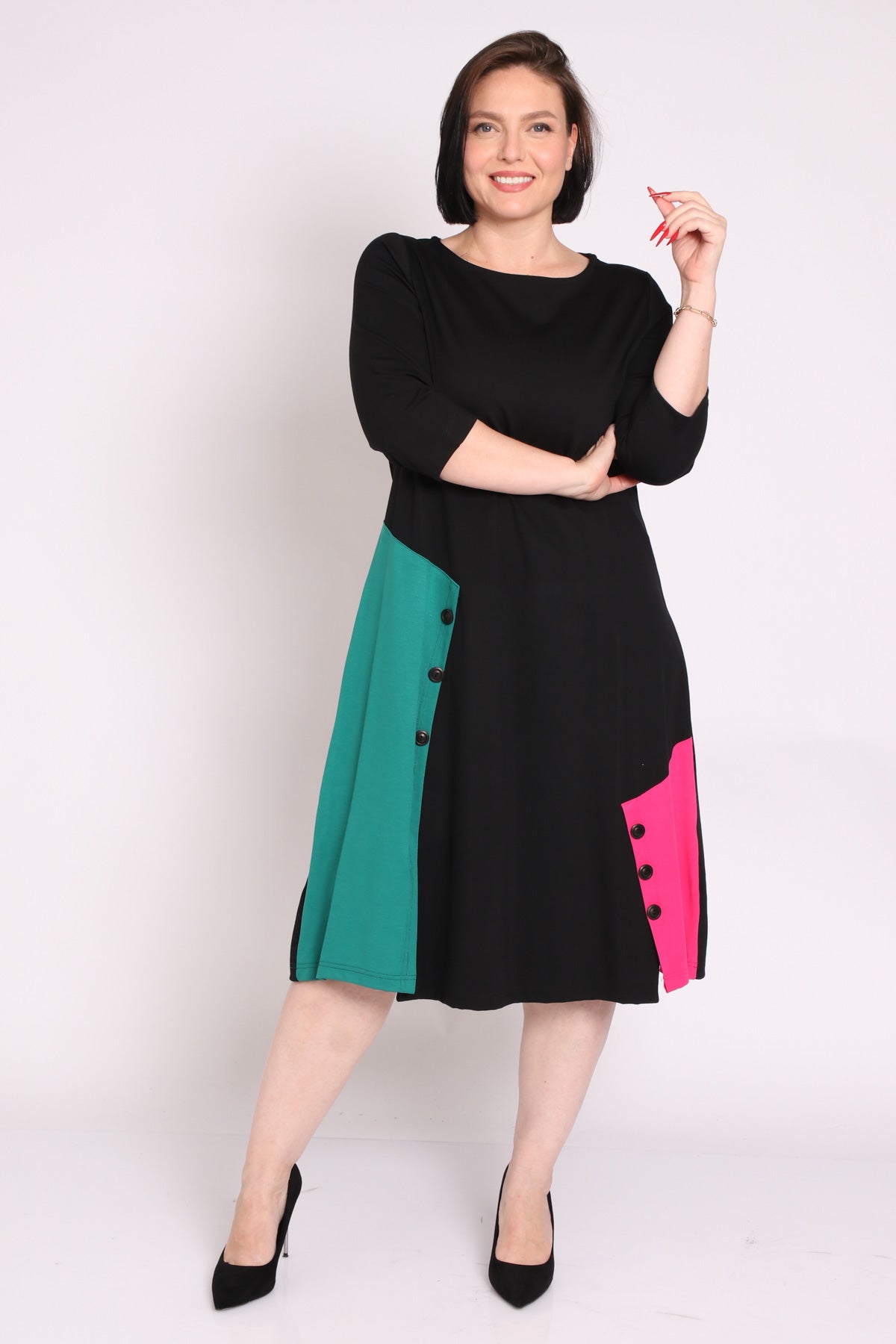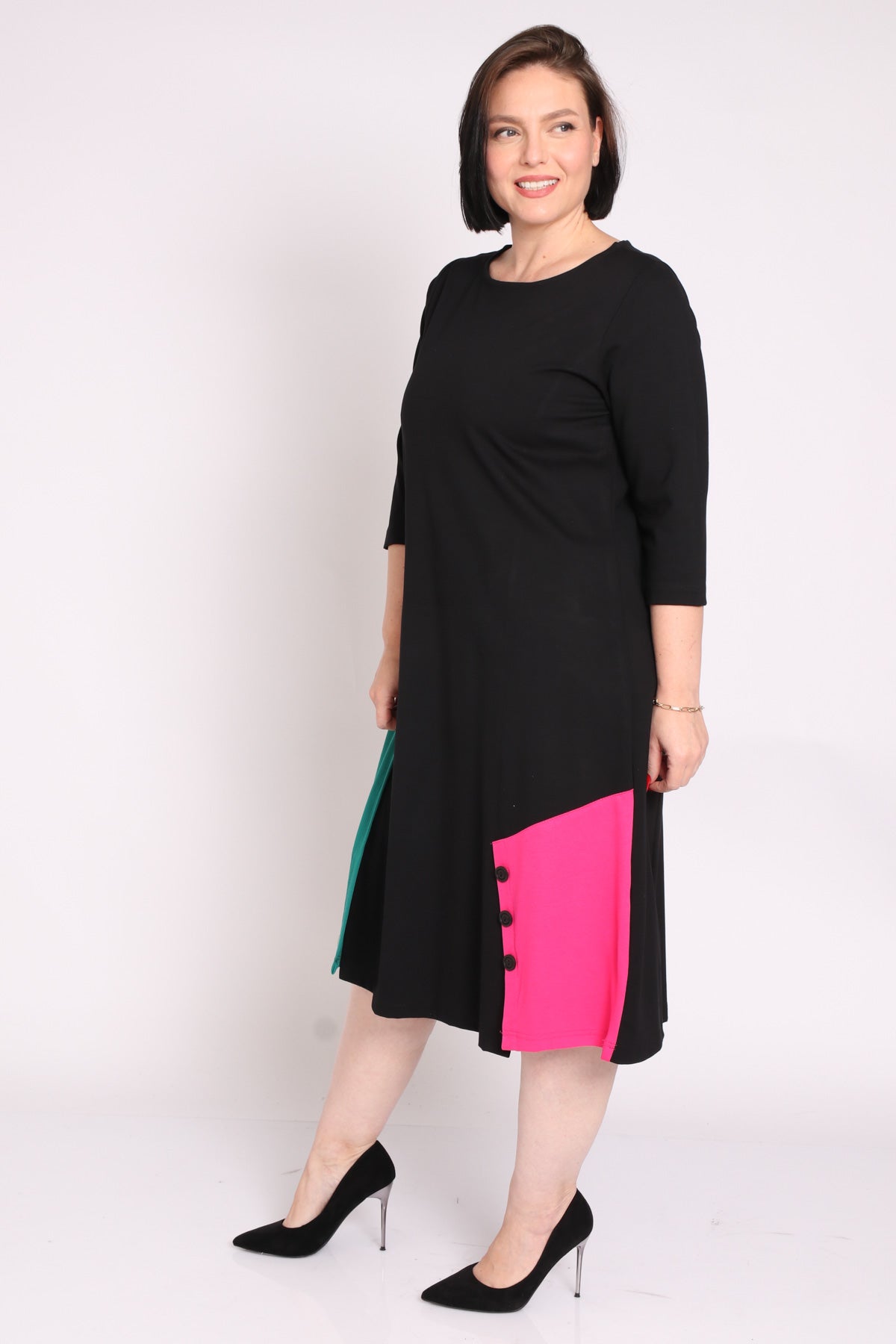 שמלה קצרה בגזרה מתרחבת קלות, בשילוב בדים בצבעים קונטרסטיים