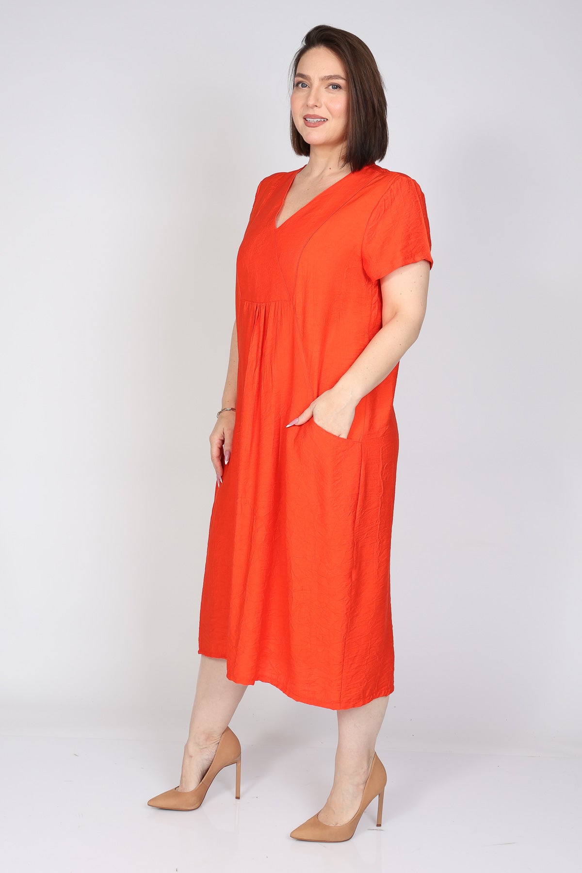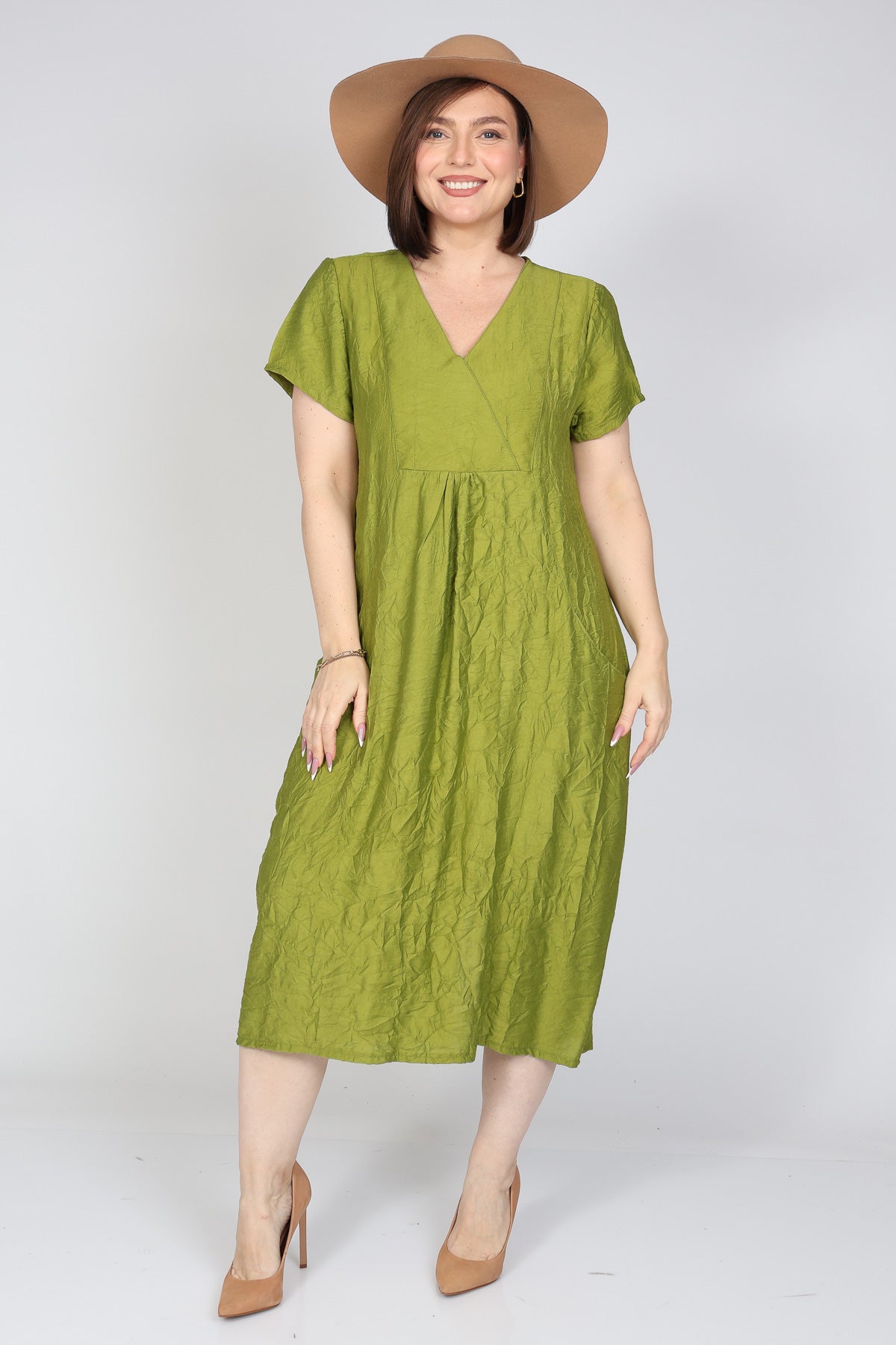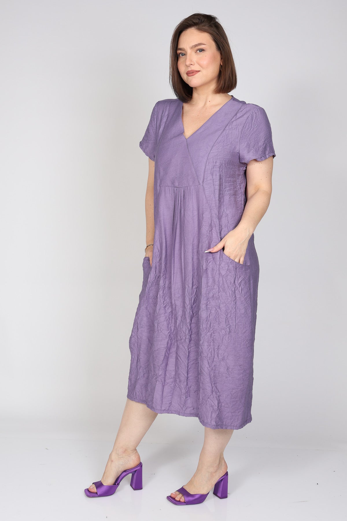 - שמלת מקסי מבד ויסקוזה במראה מקומט בגזרה נשפכת ושני כיסים