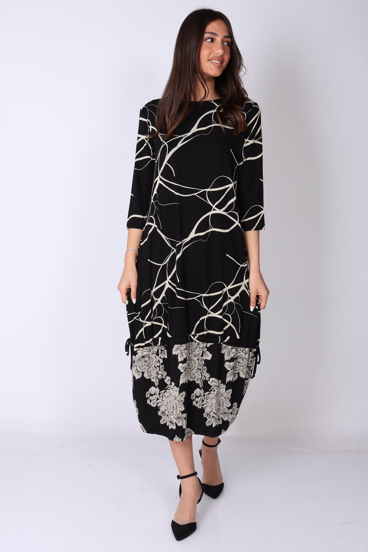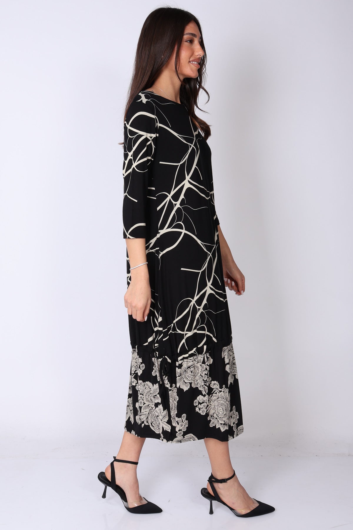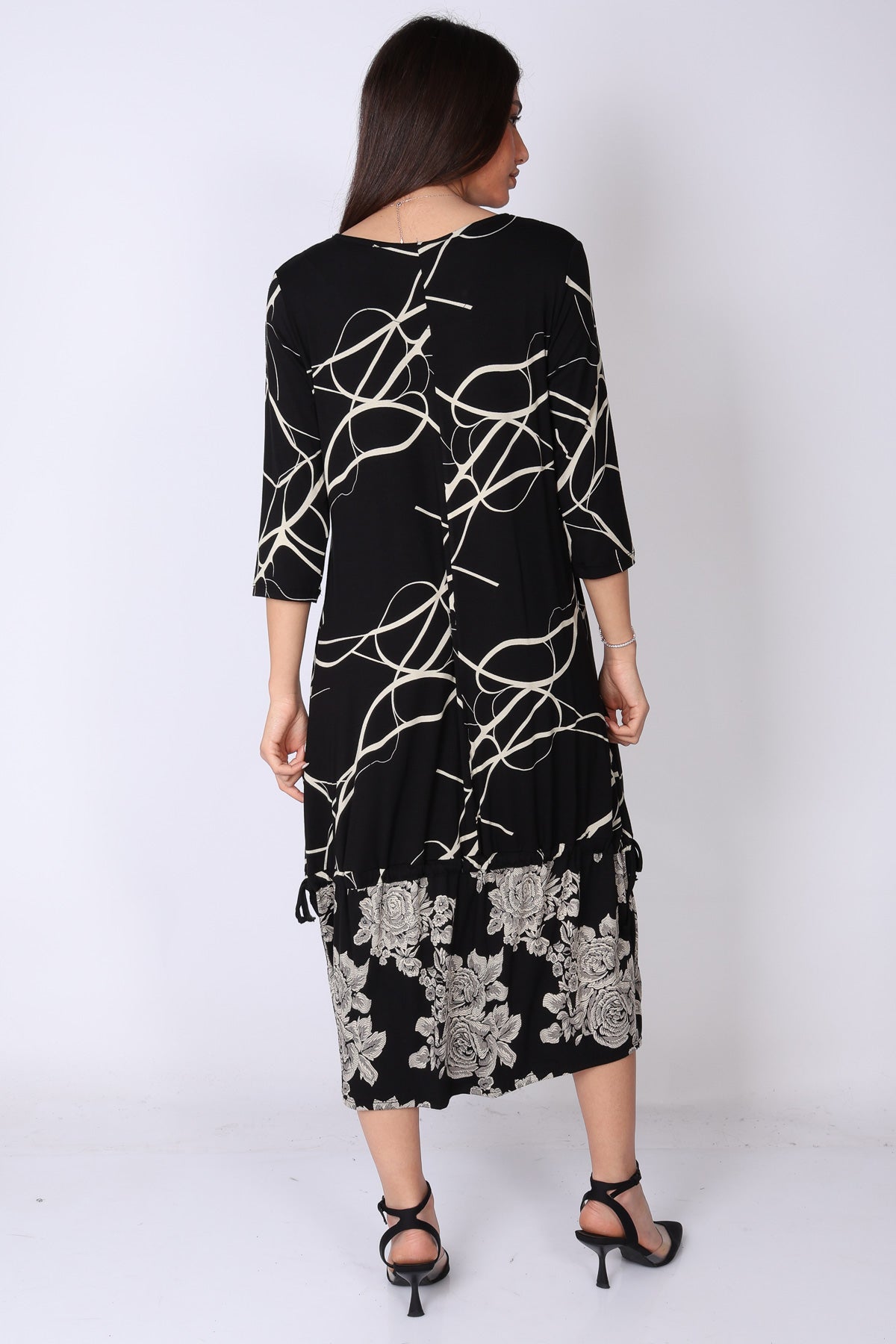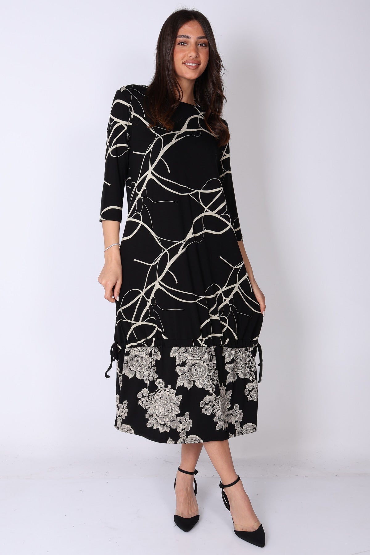 שמלה בגזרה ישרה עם סיומת וולן קלילה, בשילוב שני דפוסים שמוסיפים עניין ועומק למראה.