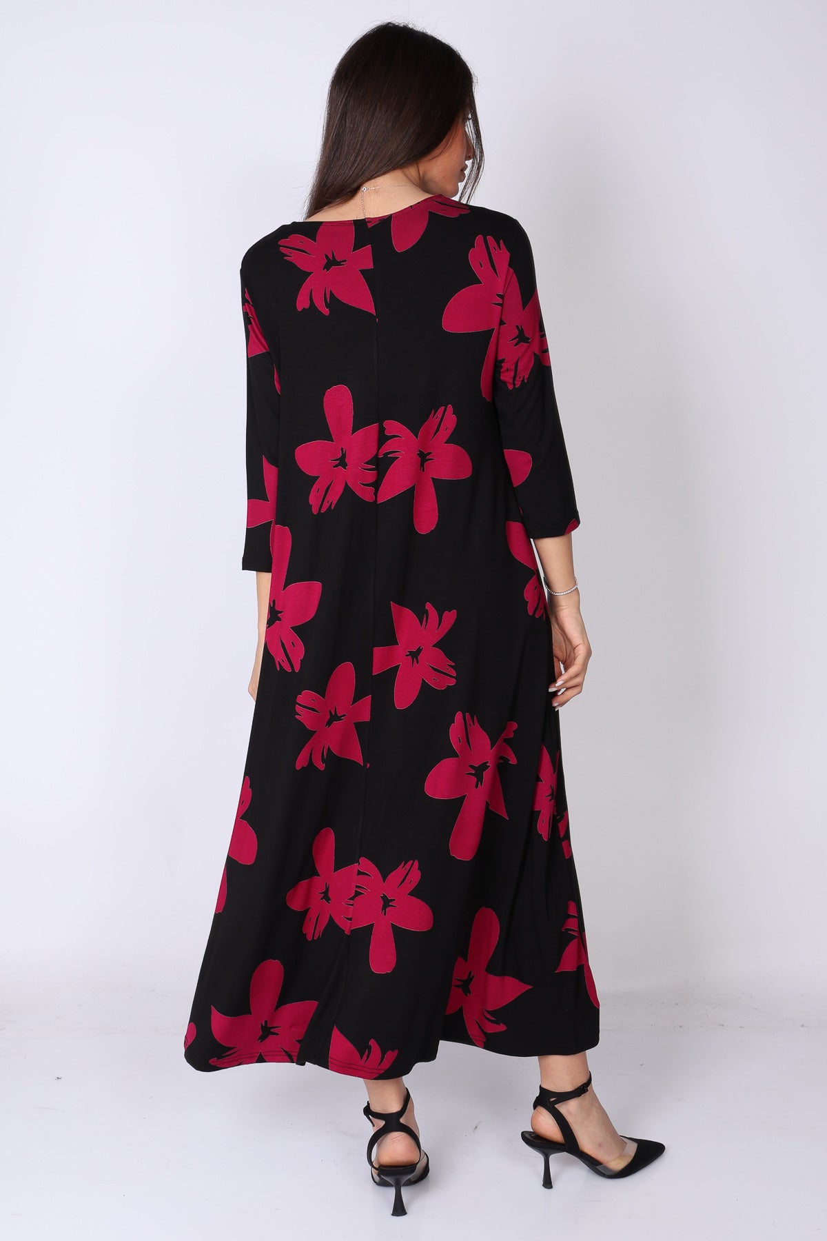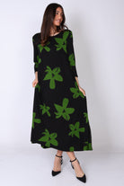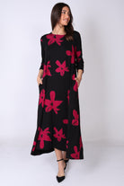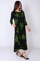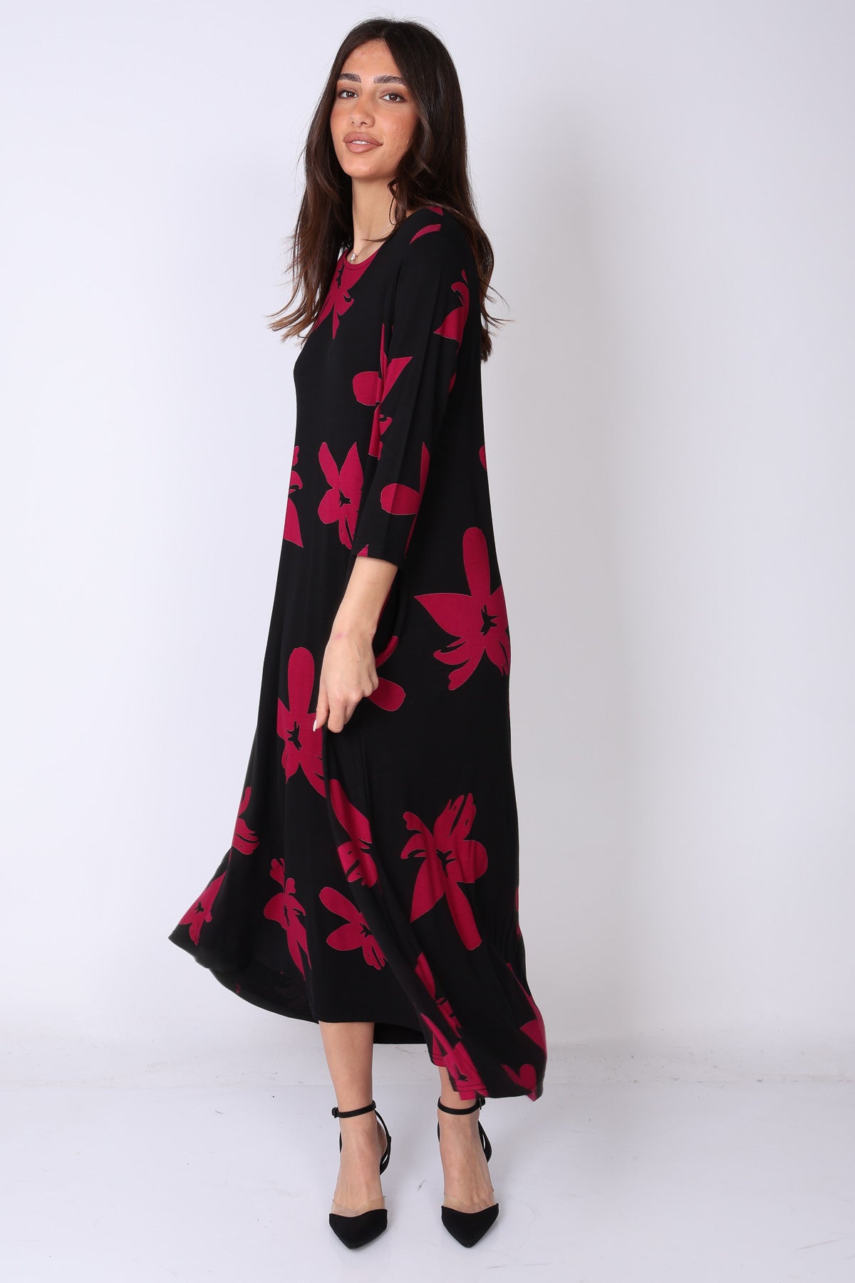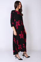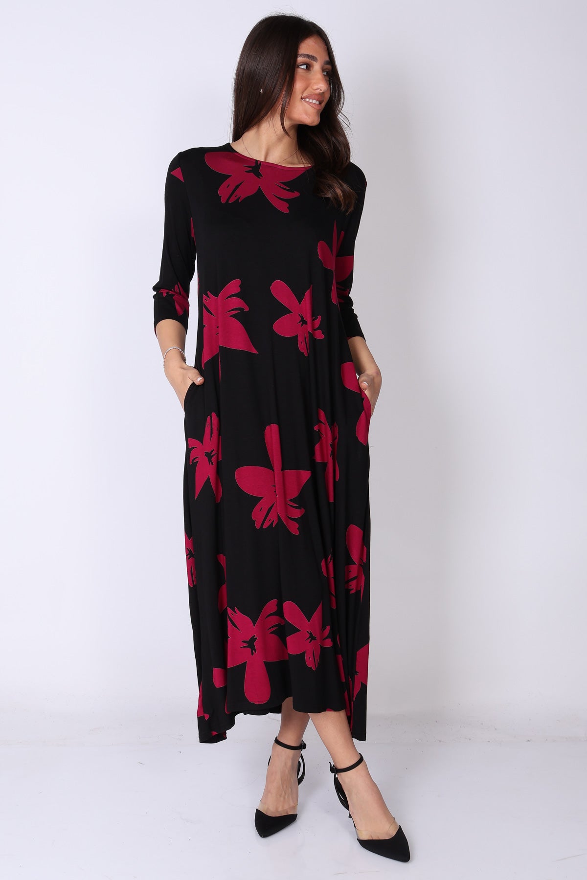 שמלה בגזרת A‑ליין נשפכת, עשירה בבד ומלאה בסטייל, עם דפוס פרחים בצבעים עזים שמושכים את העין ומוסיפים נוכחות.