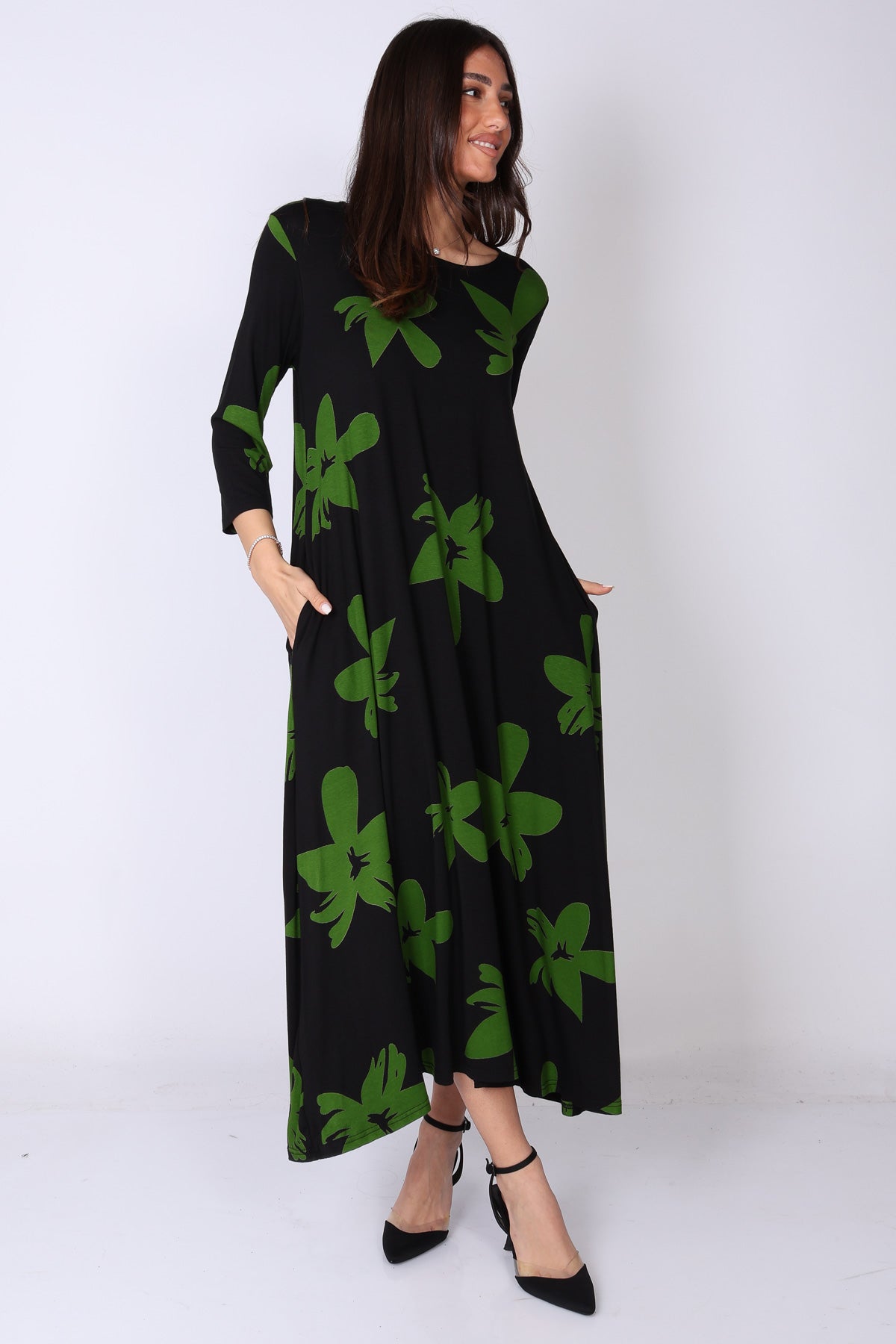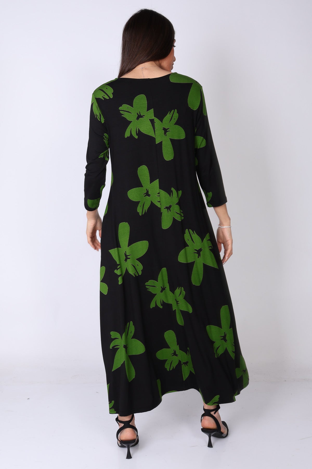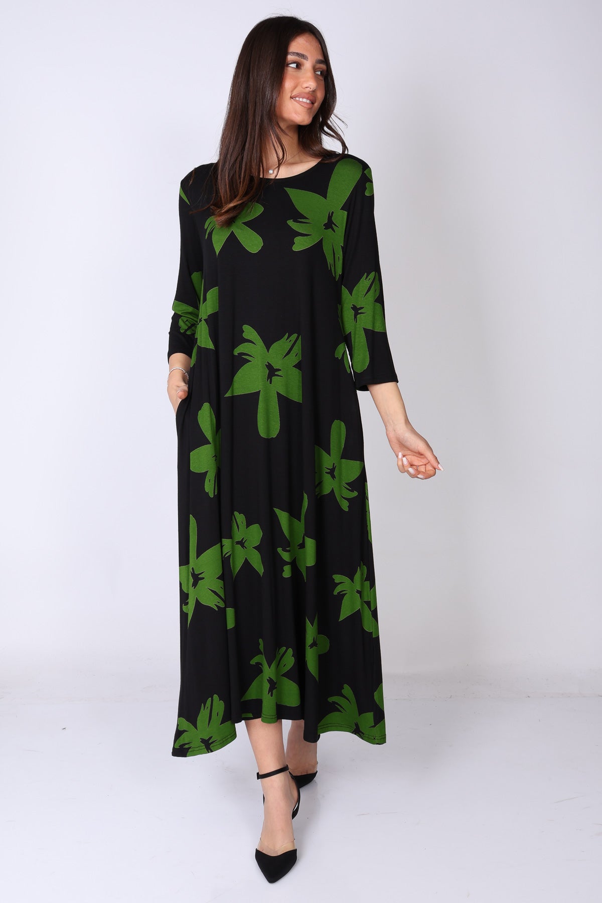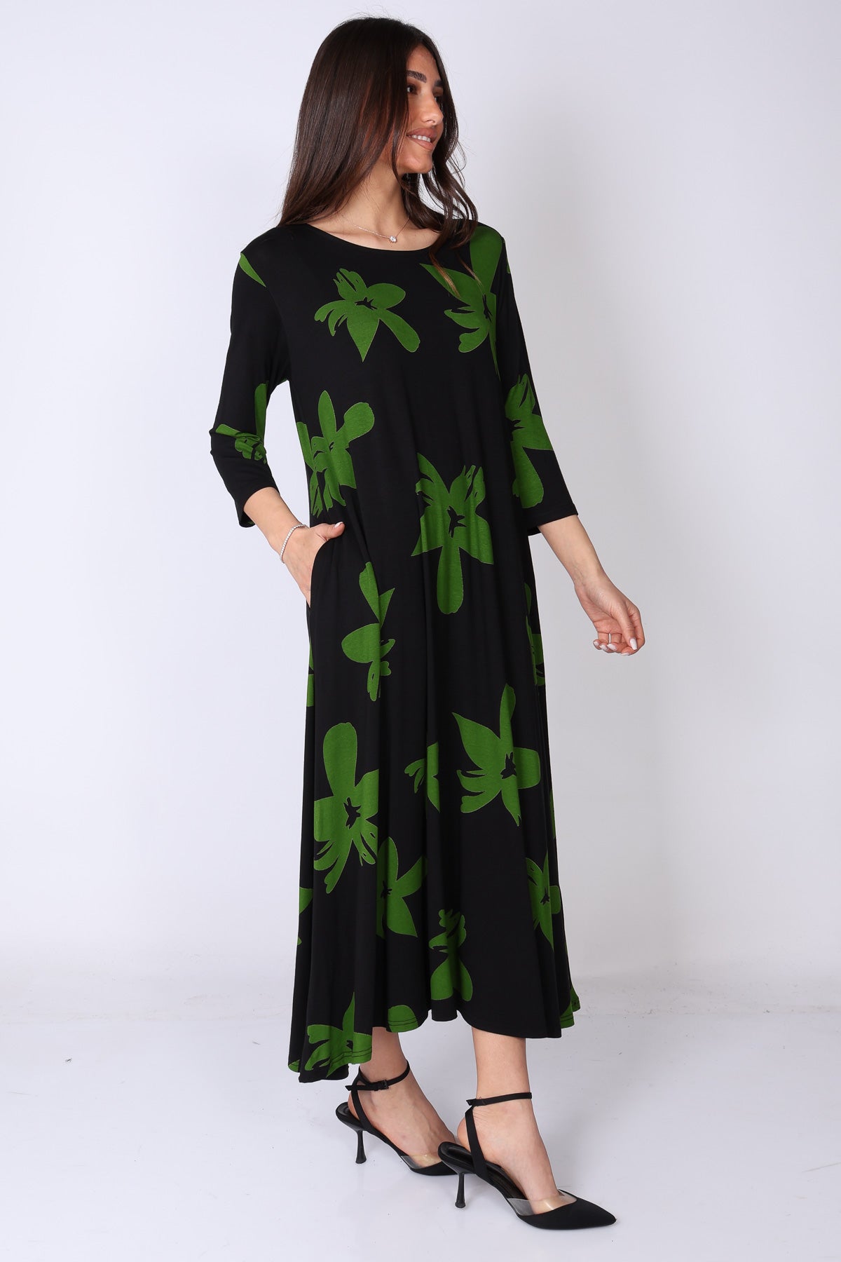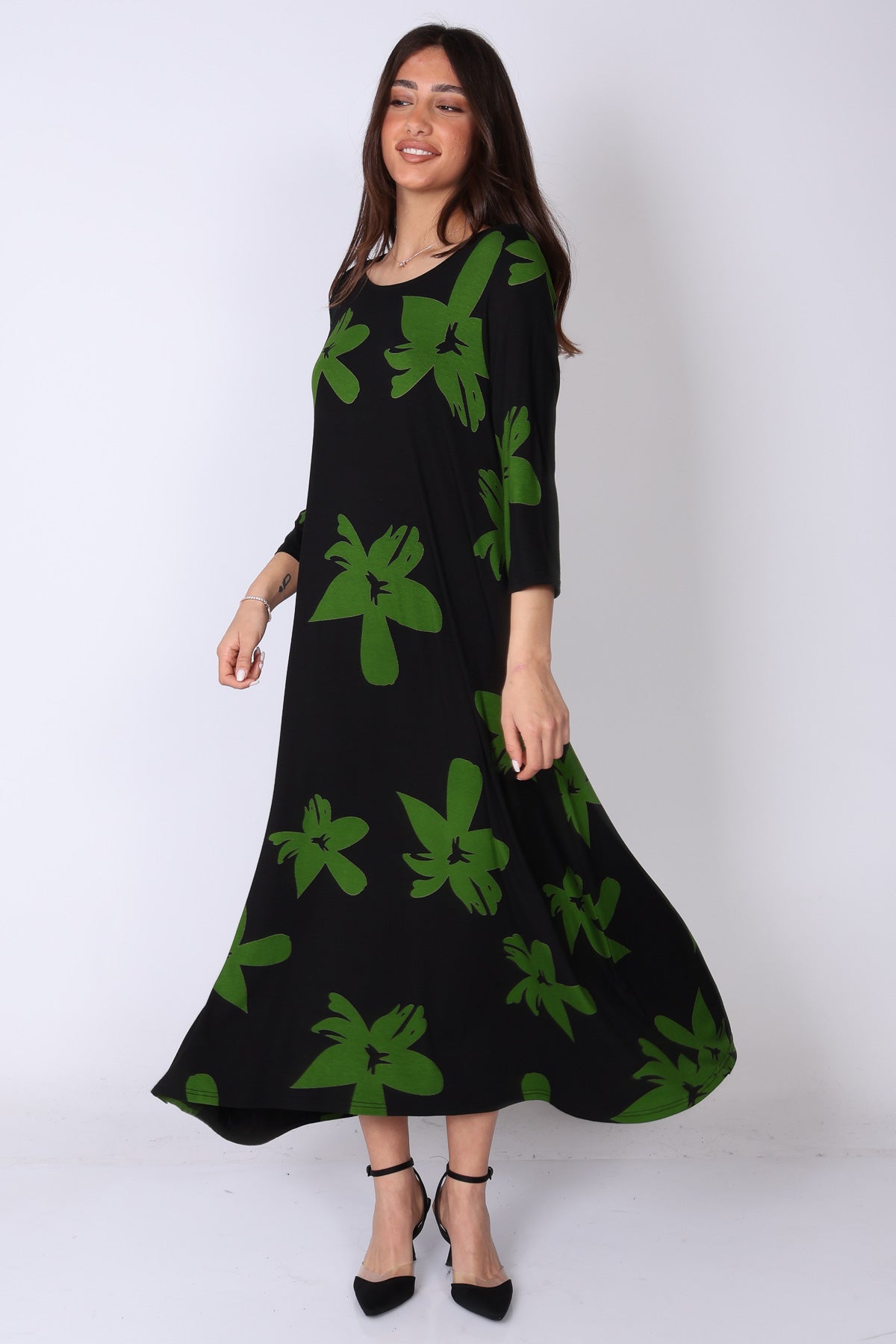 הגזרה הנשפכת יחד עם הבד העשיר והדפוס הבולט יוצרים שמלה עם נוכחות עדינה אך מדויקת – פריט שמשדר אלגנטיות, סטייל ונוחות בו‑זמנית.