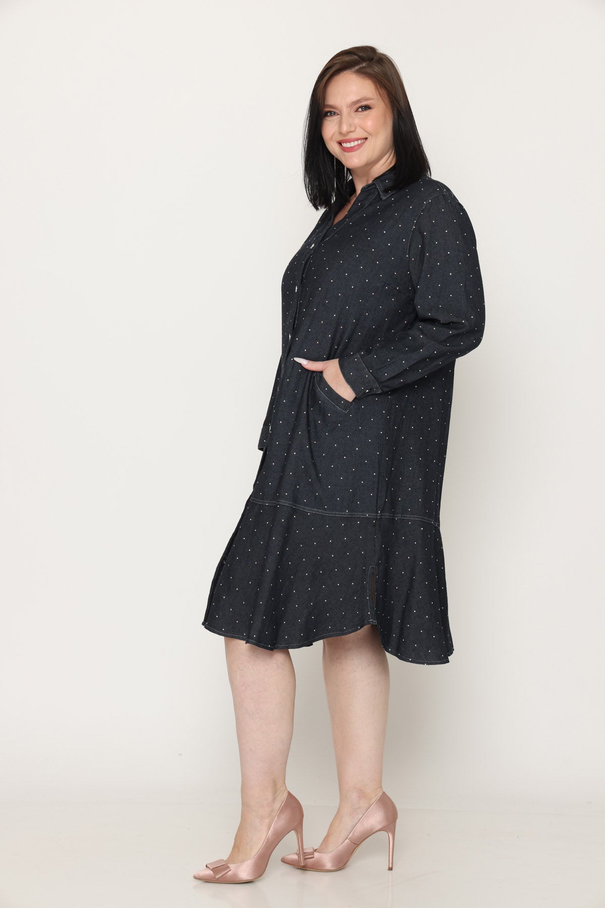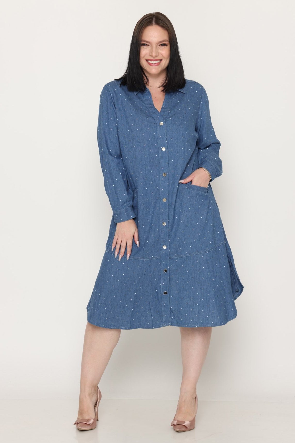 - שמלת ג'ינס עם אבנים קטנות וכפתורים לכל האורך בסיומת וולן