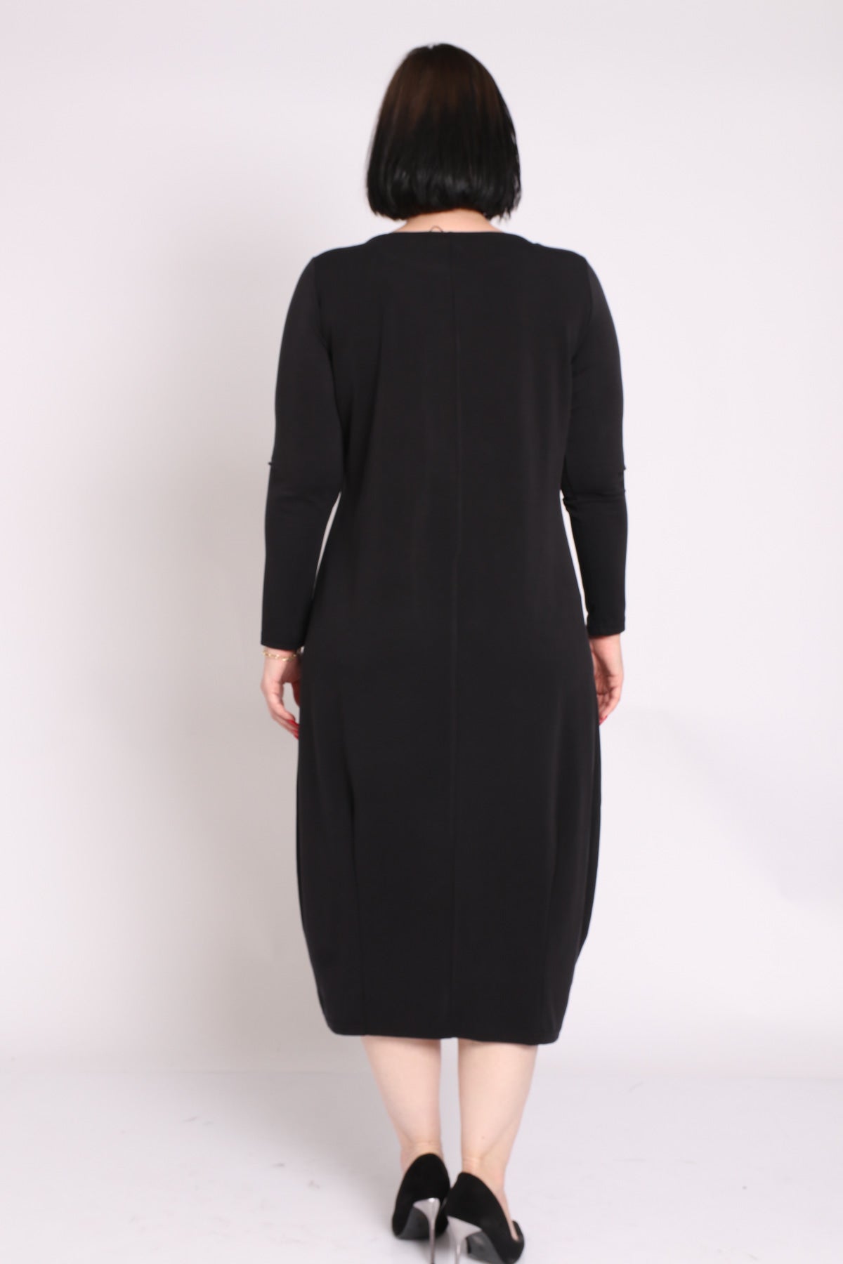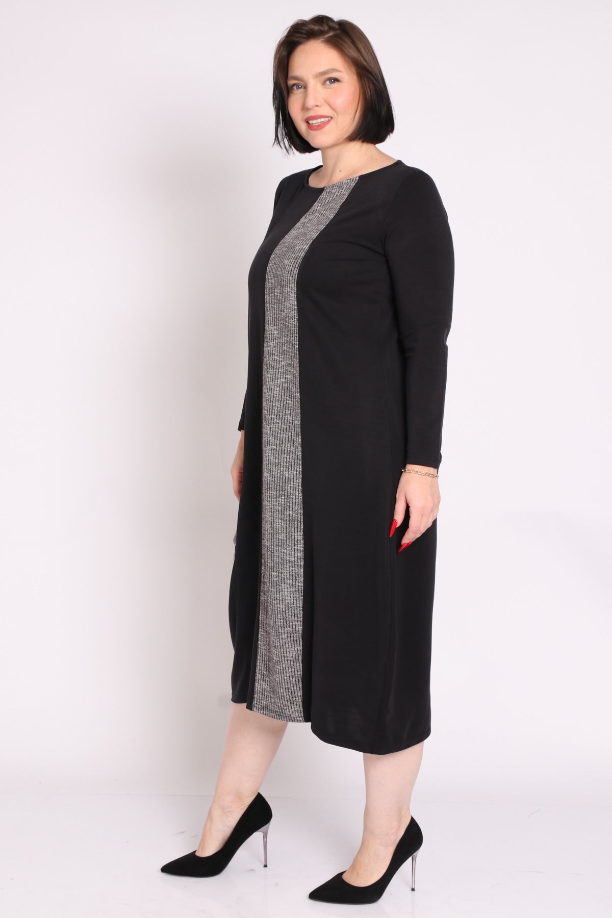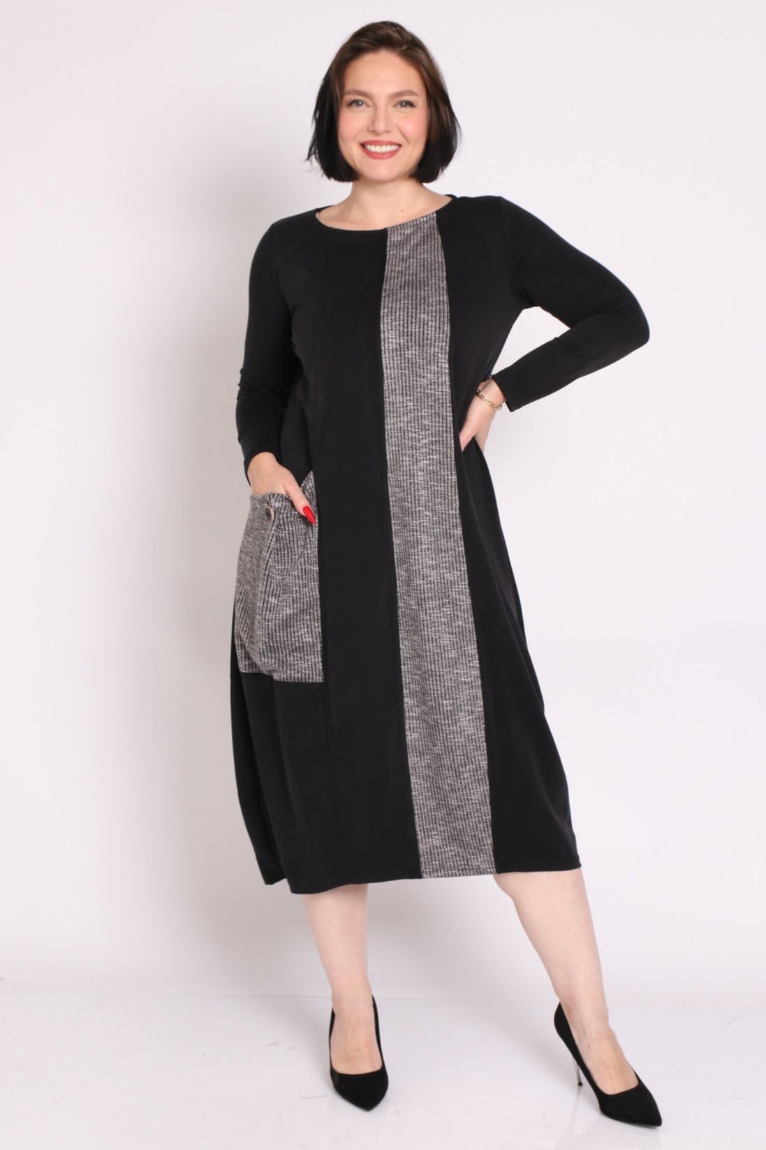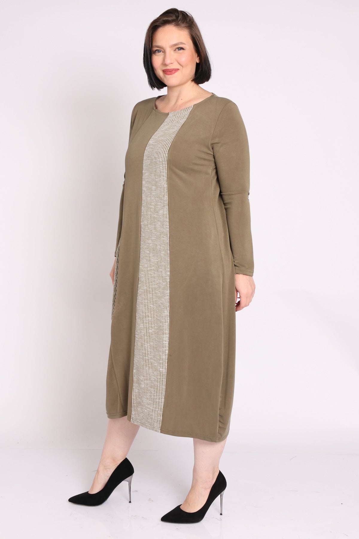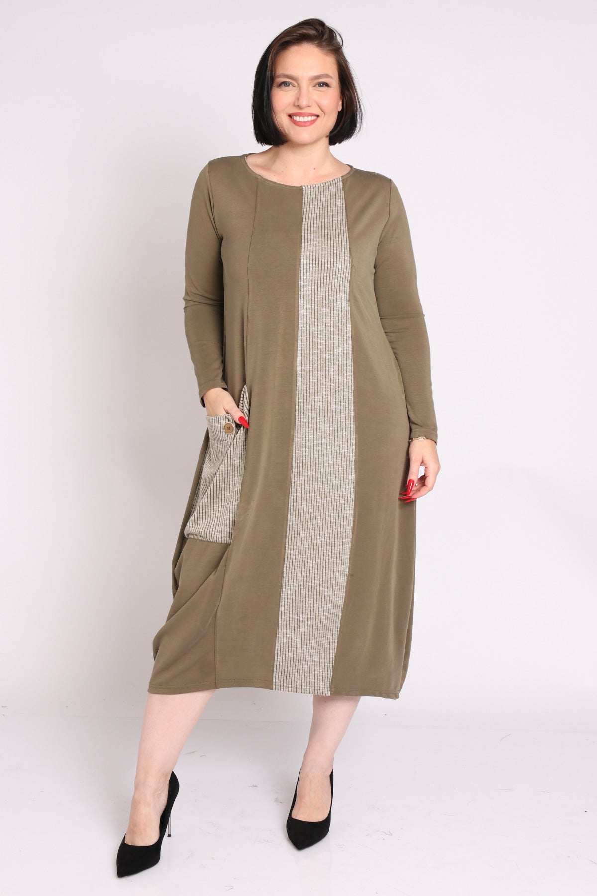 • שמלה בעלת צללית בלון עדינה משולב בד חלק ובד עם טקסטורה