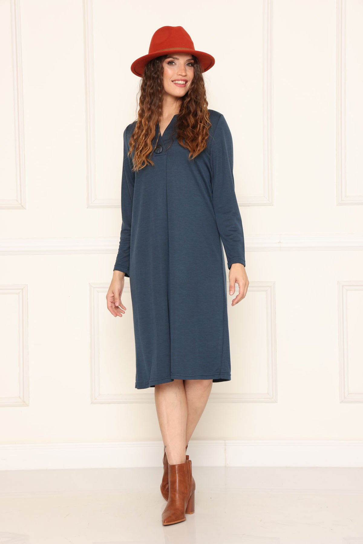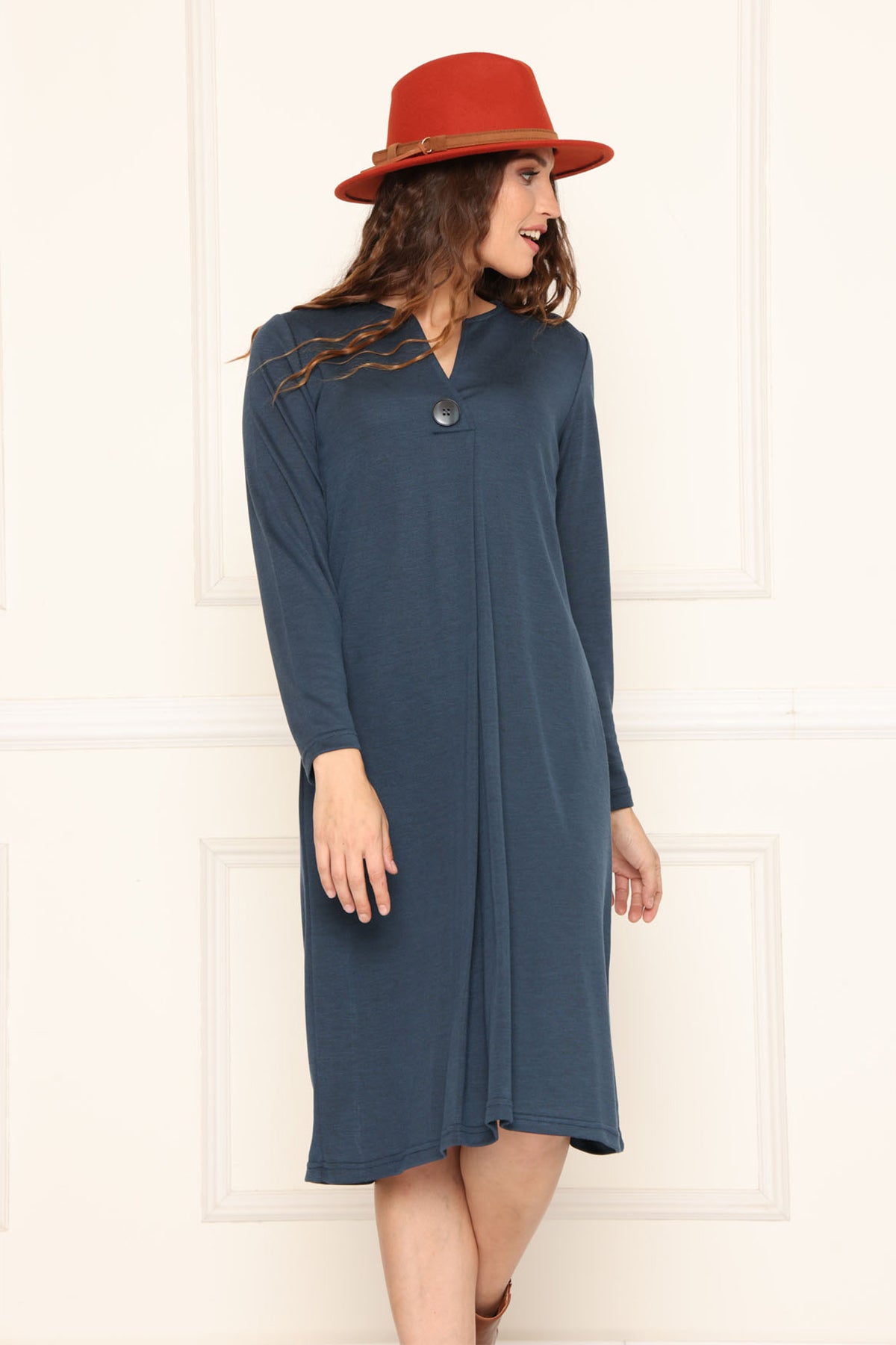 - לשמלה צווארון מפתח צוואר וי עם סיומת כפתור וקפל עדין ושרוולים ארוכים ושסע קל מאחור