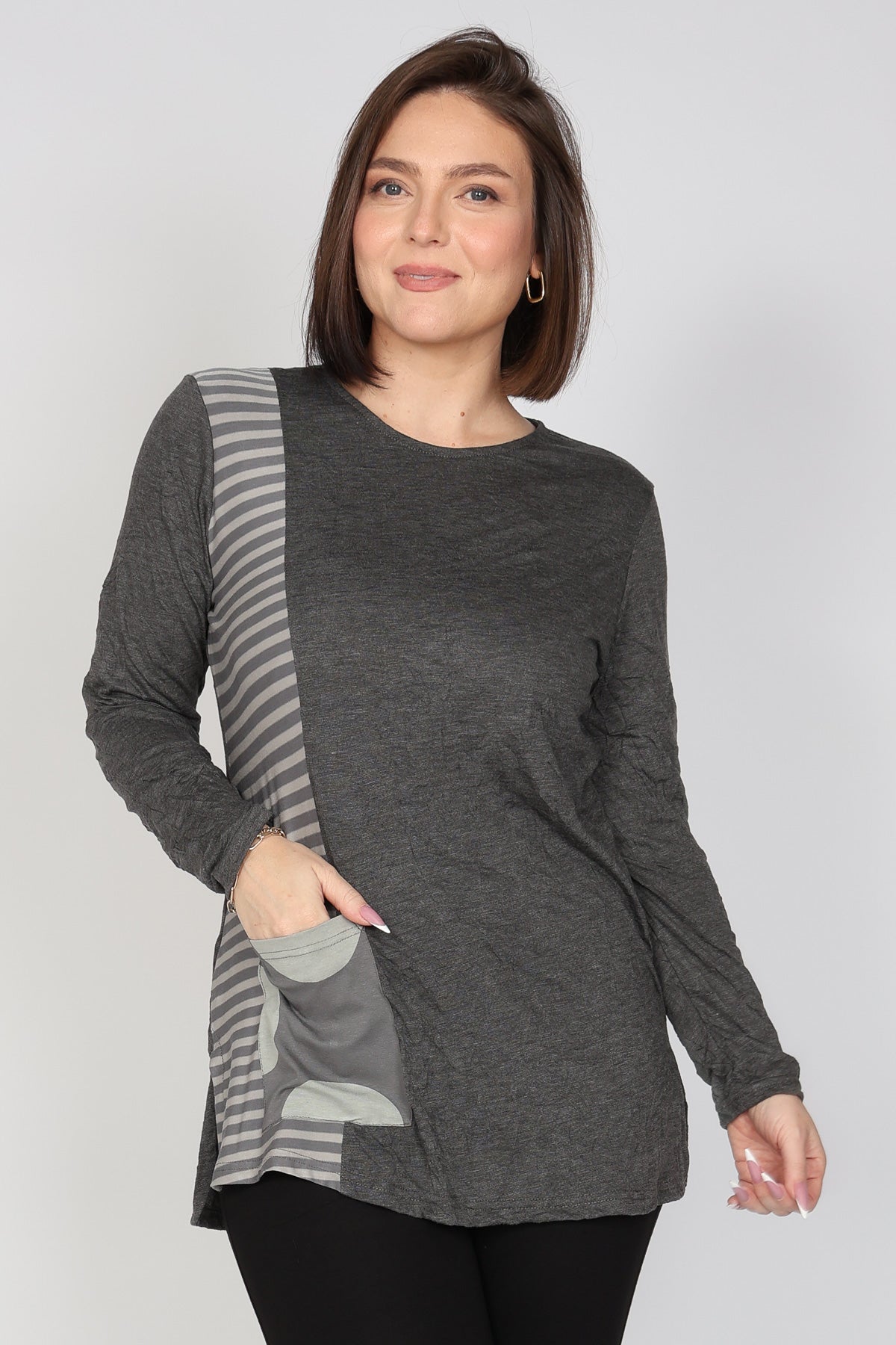 - חולצה משולבת בד פסים ובד חלק עם כיס בודד בדפוס נקדות