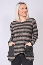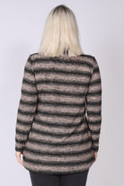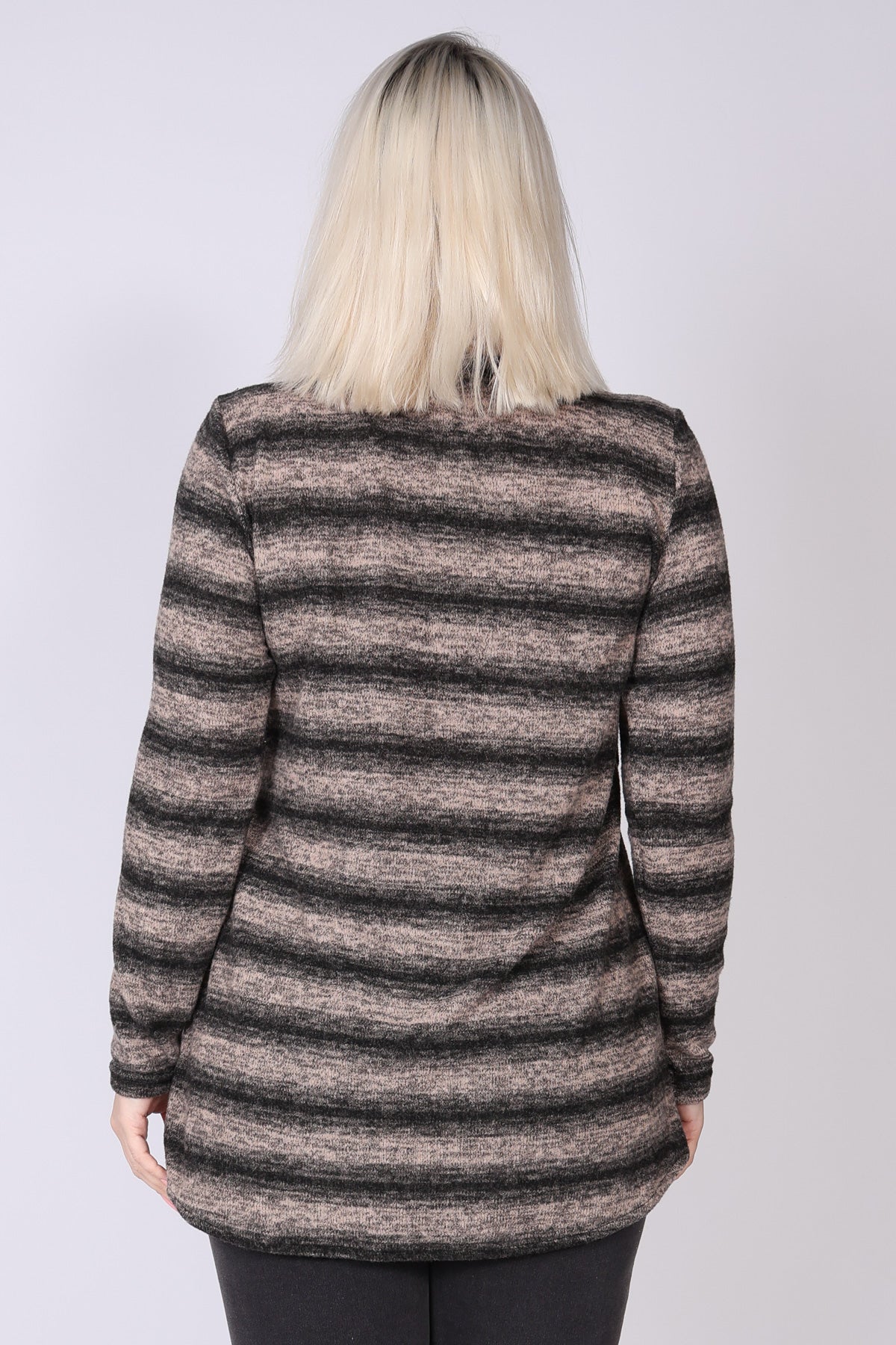 טוניקת פסים בגזרה ישרה עם שוליים א-סימטריים שמוסיפים תנועה ועדינות למראה. שני כיסים גדולים מבד סריג חלק מעניקים פונקציונליות ומדגישים את העיצוב הייחודי, בעוד מפתח הצוואר העגול והשרוולים הארוכים יוצרים מראה מוקפד ונוח. הבד עשוי סריג רך ונעים למגע, שמותאם במיוחד לחורף הישראלי.