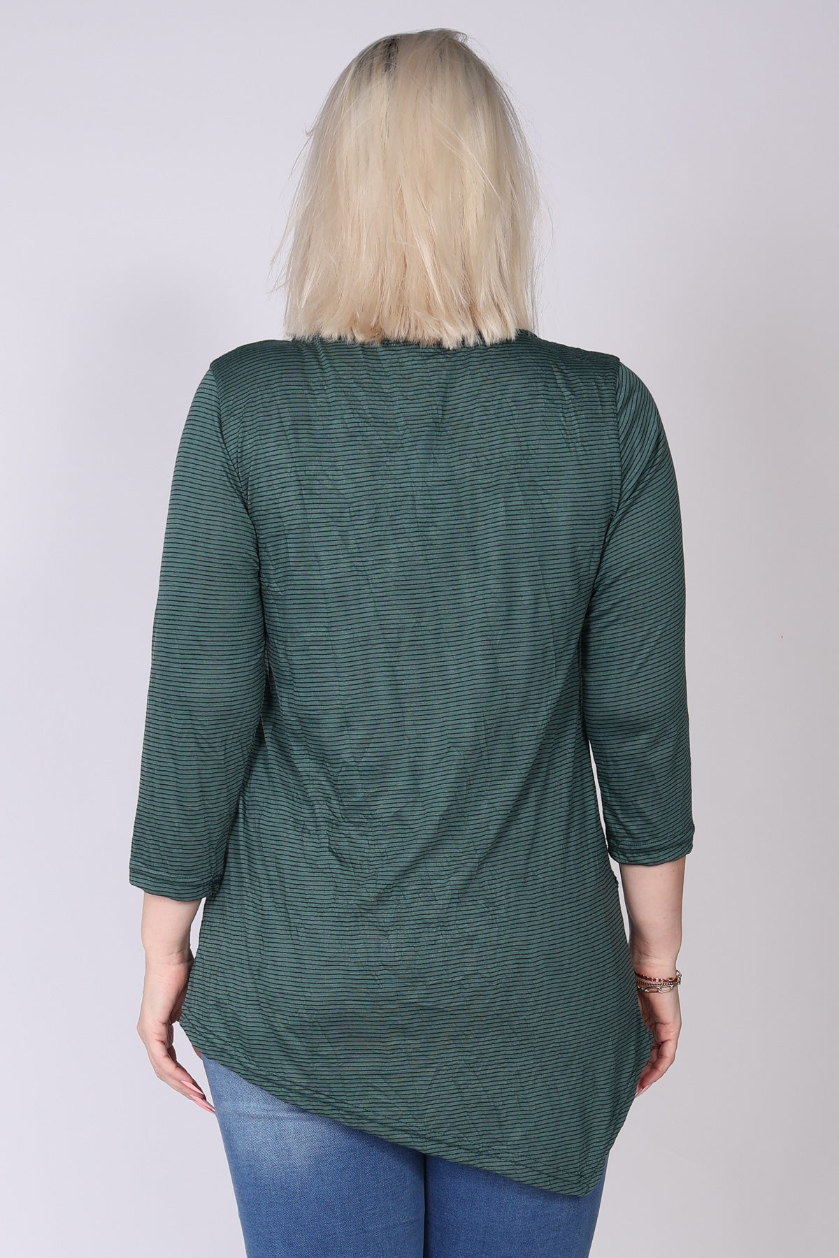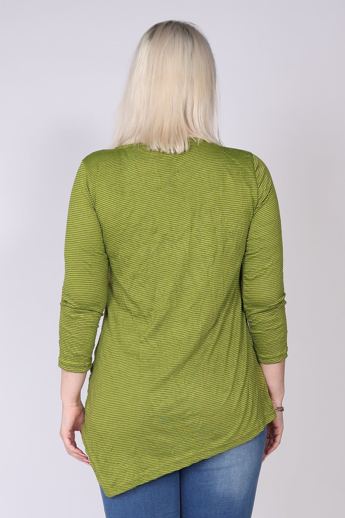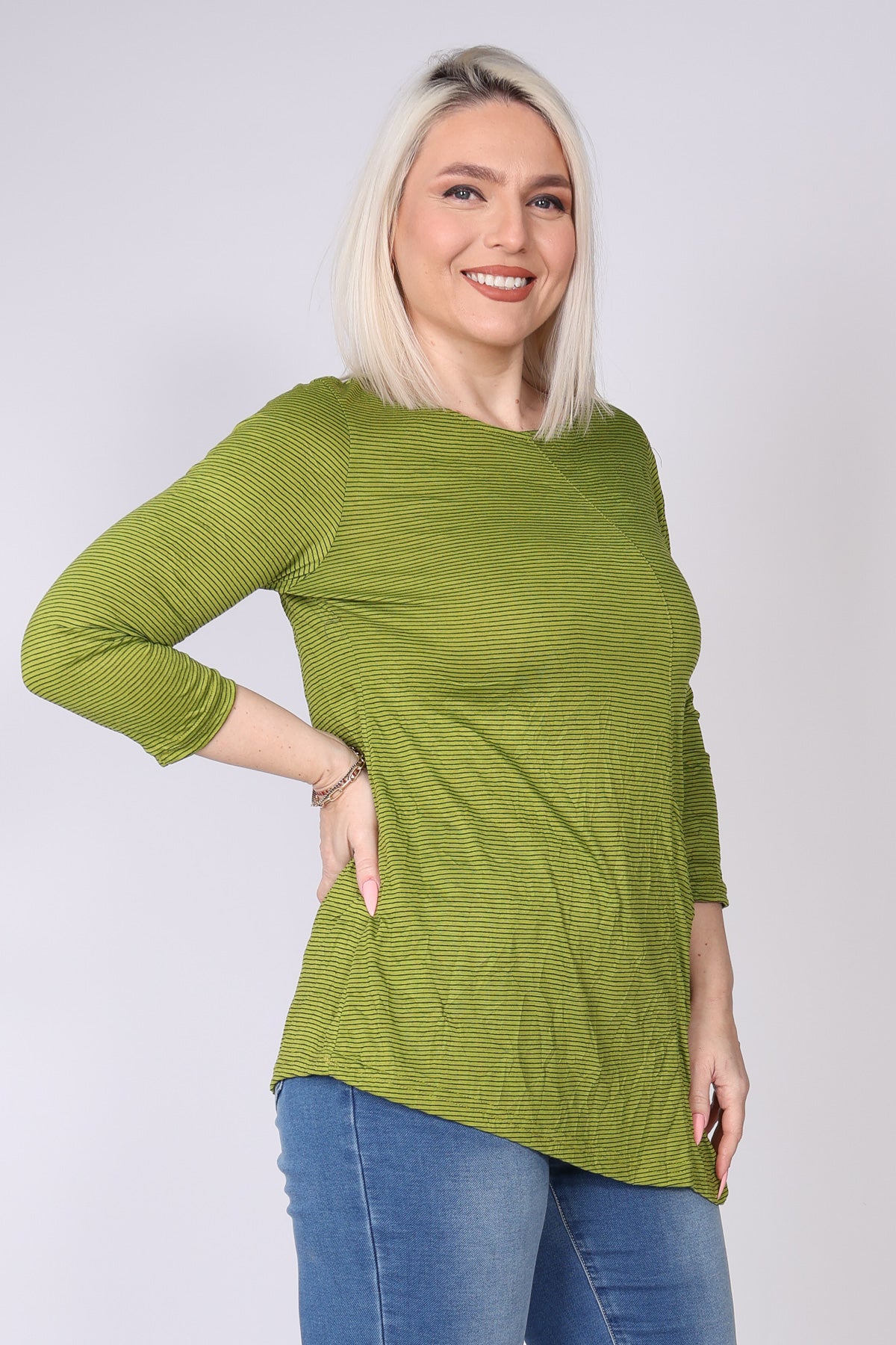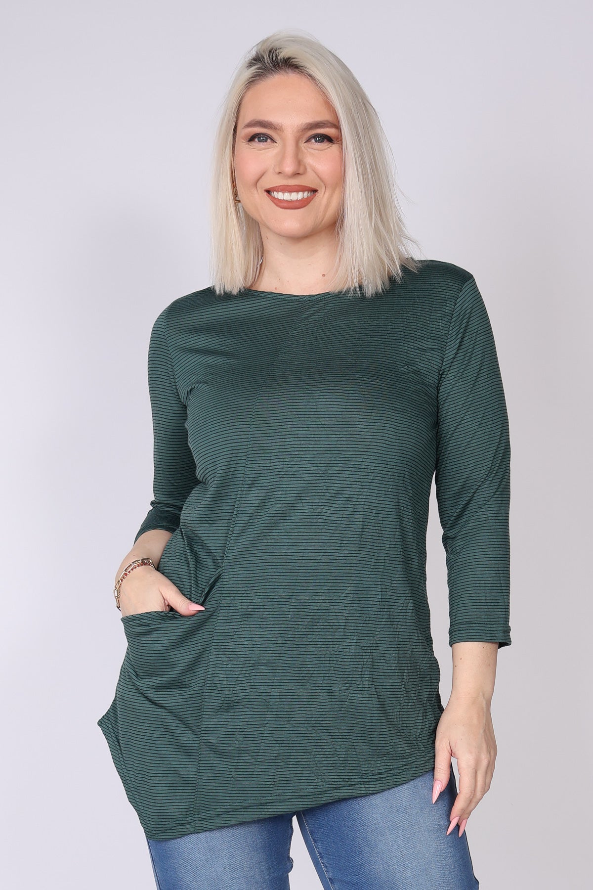 טוניקה בסיומת א-סימטרית מבד פסים דקיקים, עם כיס נסתר בודד לשילוב של פונקציונליות וקו נקי. מפתח צוואר עגול ושרוולים המכסים את המרפק, בגזרה נעימה ומרגיעה שמתאימה ליום יום ולמראה קלאסי ועדכני.