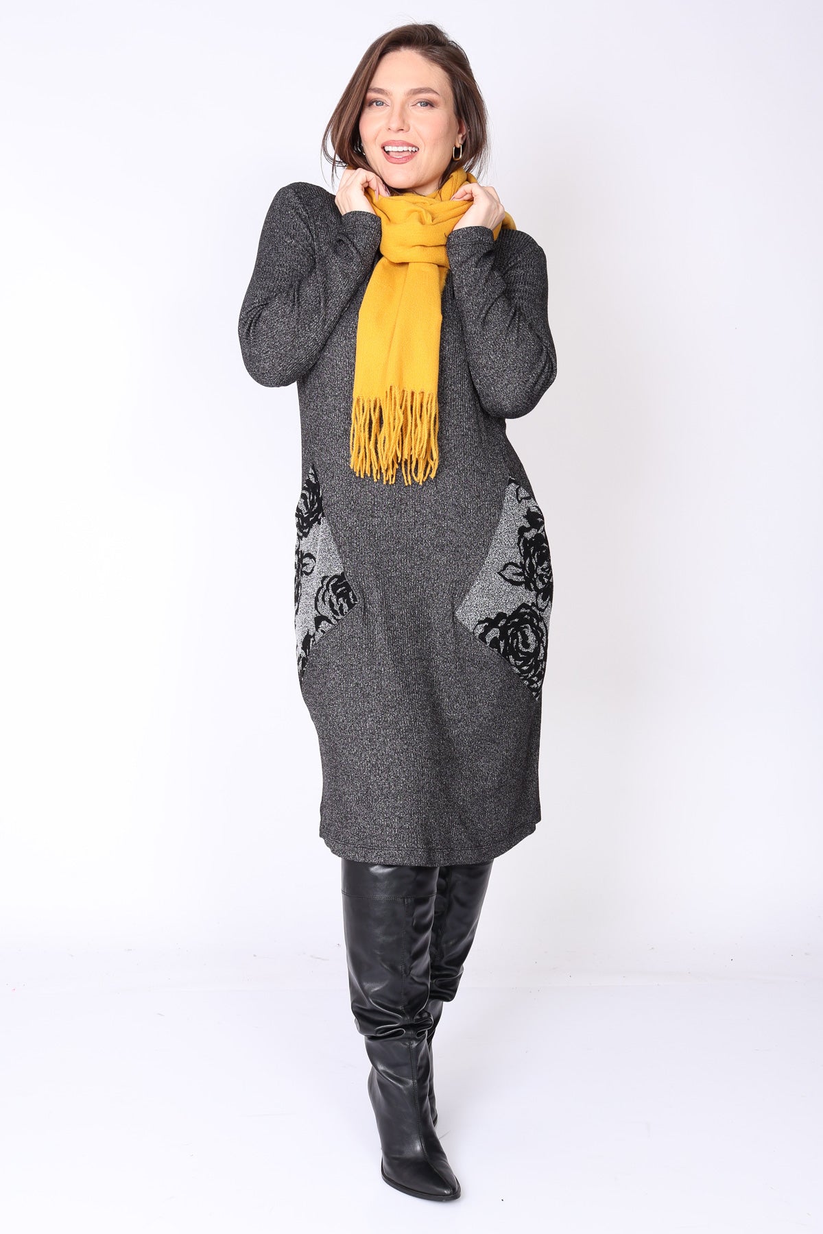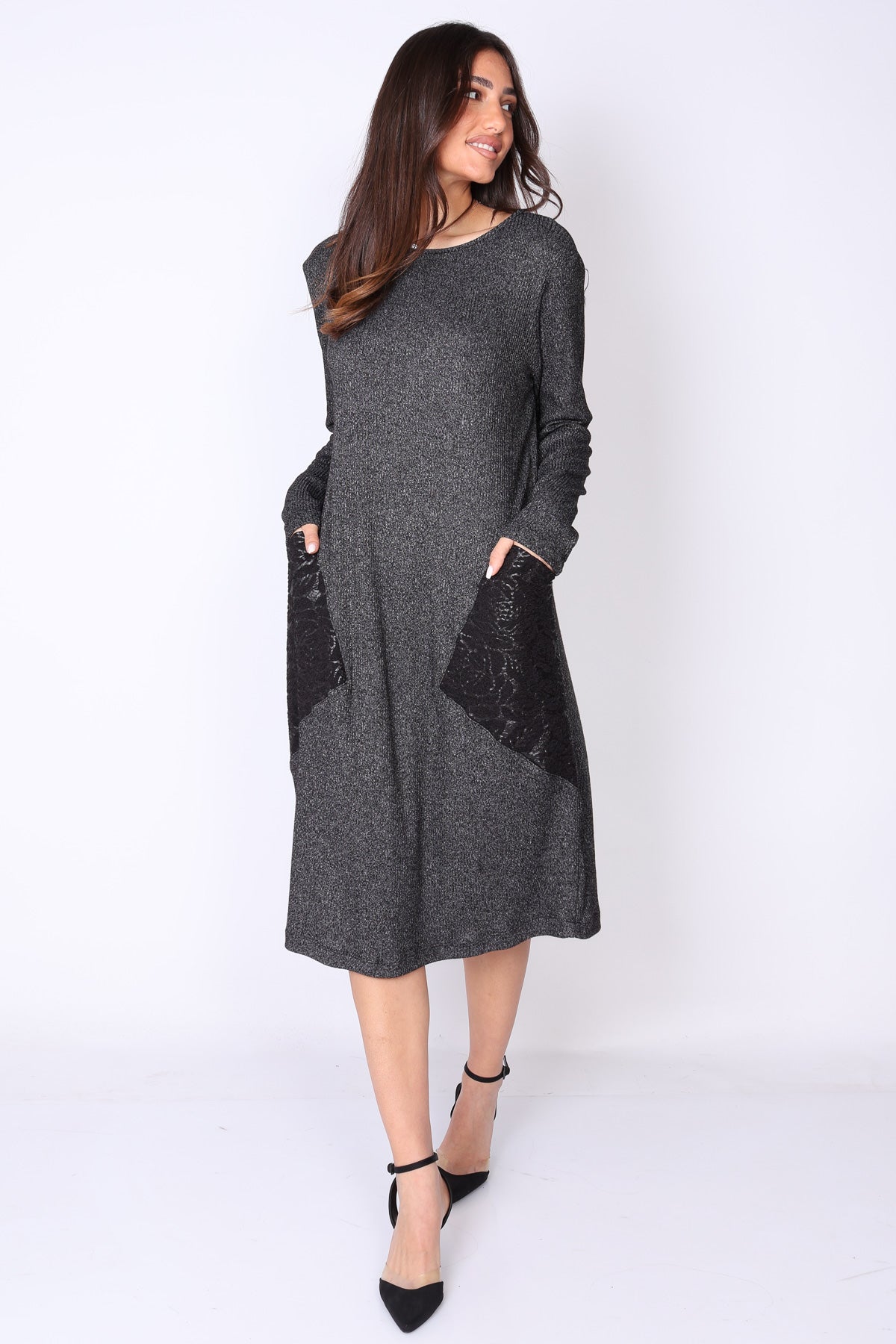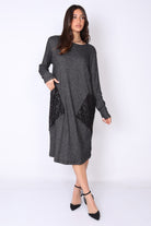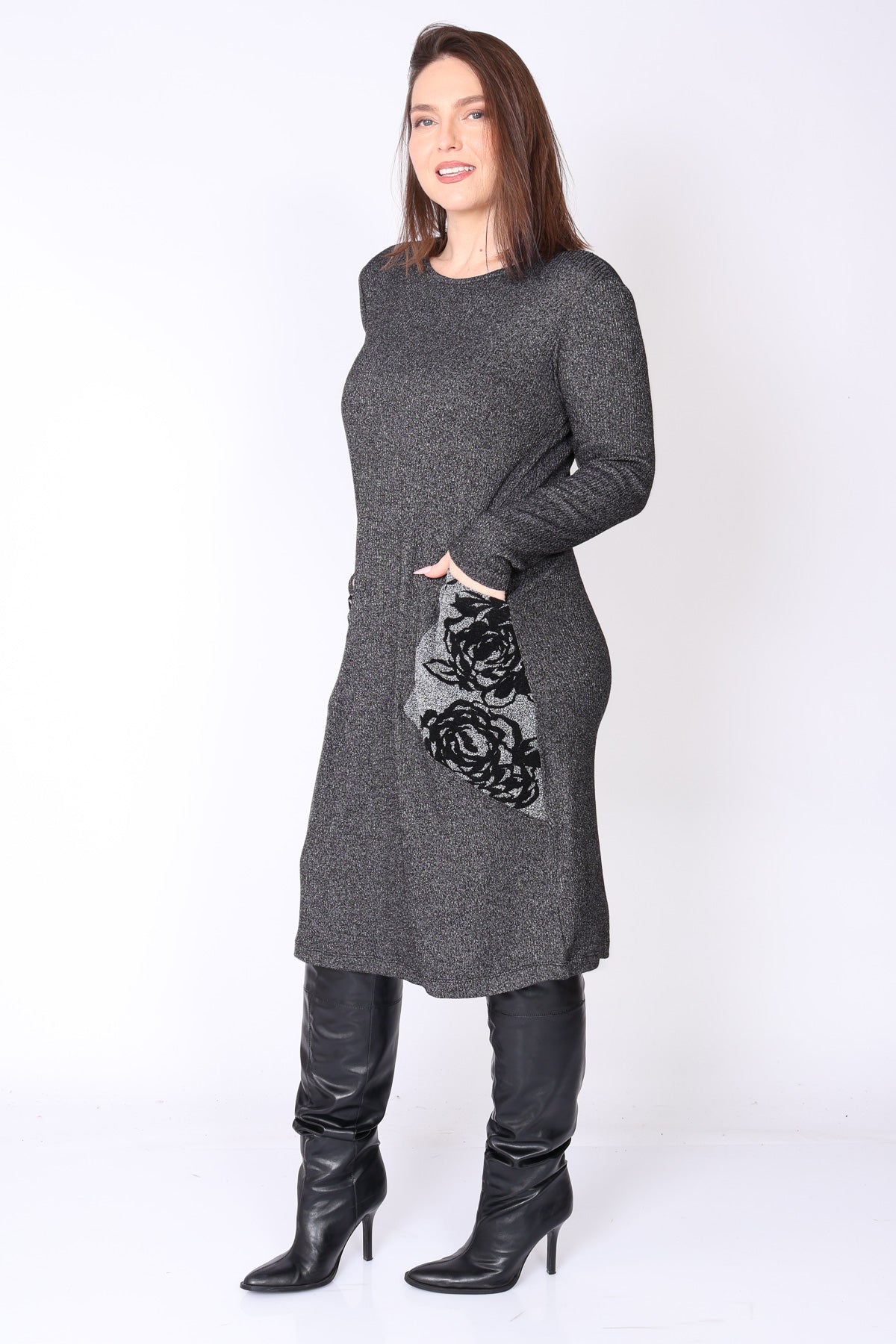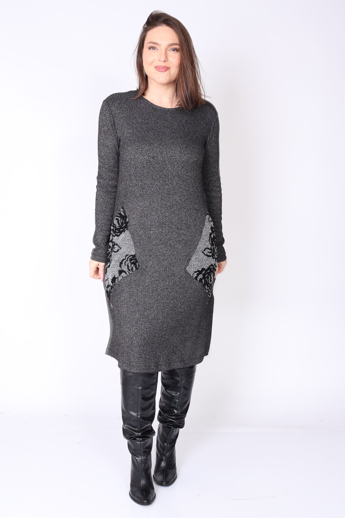 שני כיסים גדולים עם דפוס זוהר מוסיפים טאץ’ אופנתי מדויק שהופך אותה לבלתי נשכחת. מפתח הצוואר עגול והשרוולים ארוכים