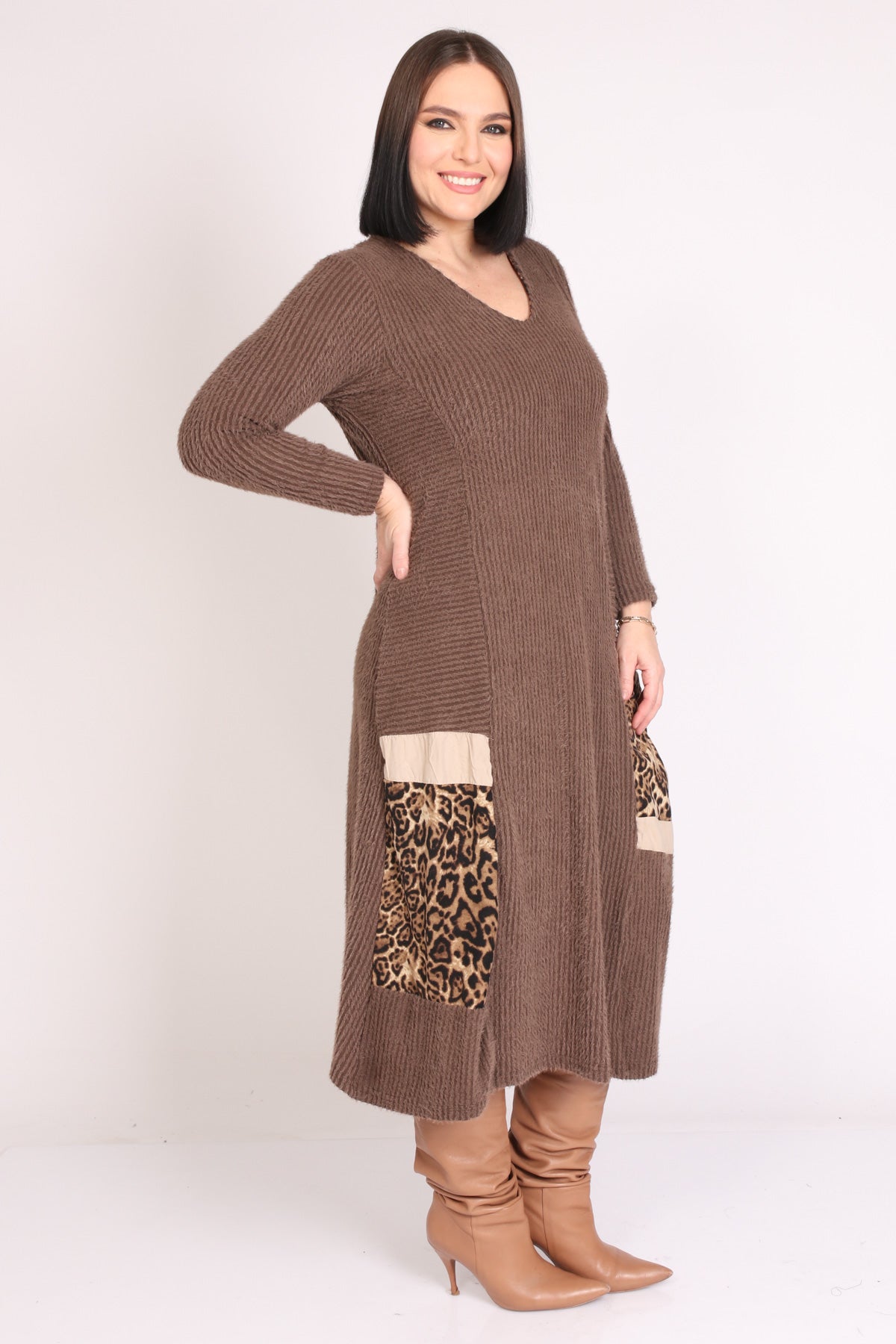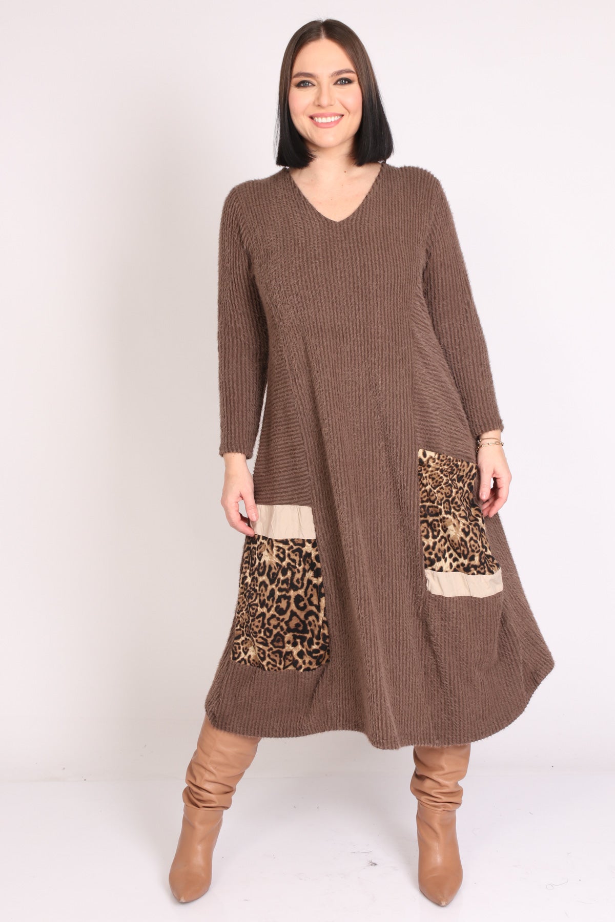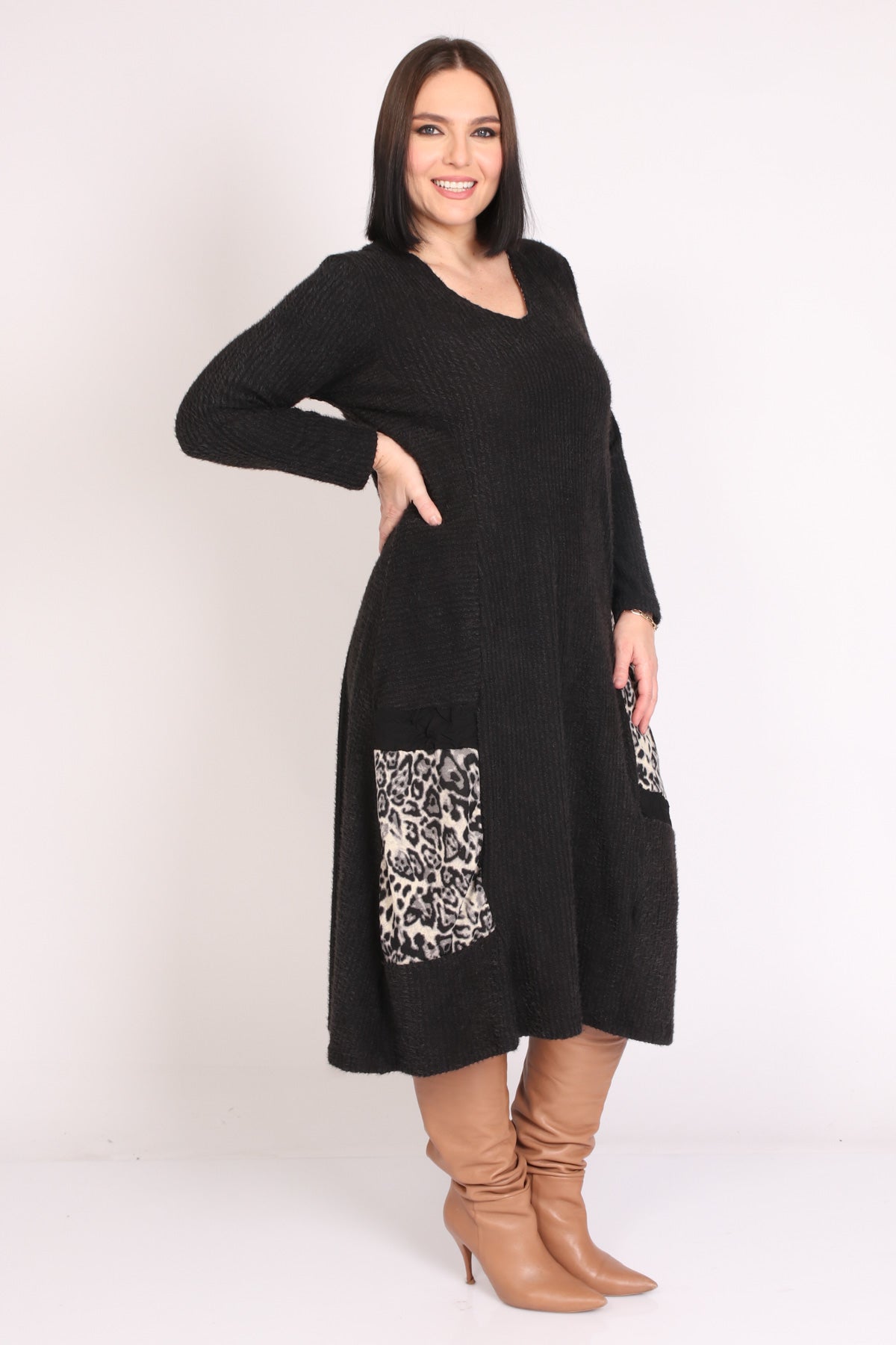 - שמלת סריג בגזרת A-ליין בשילוב בדים בחיבור א-סימטרי בדפוס מנומר