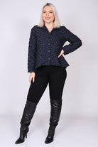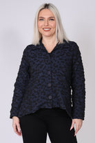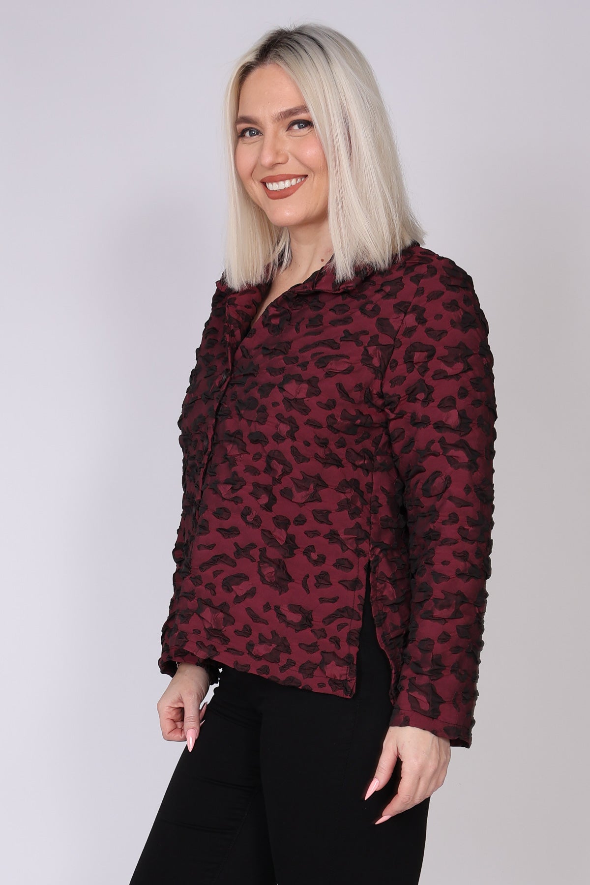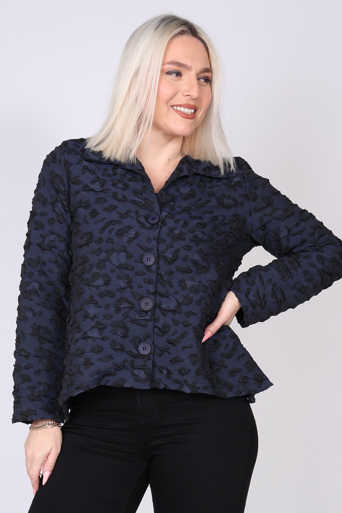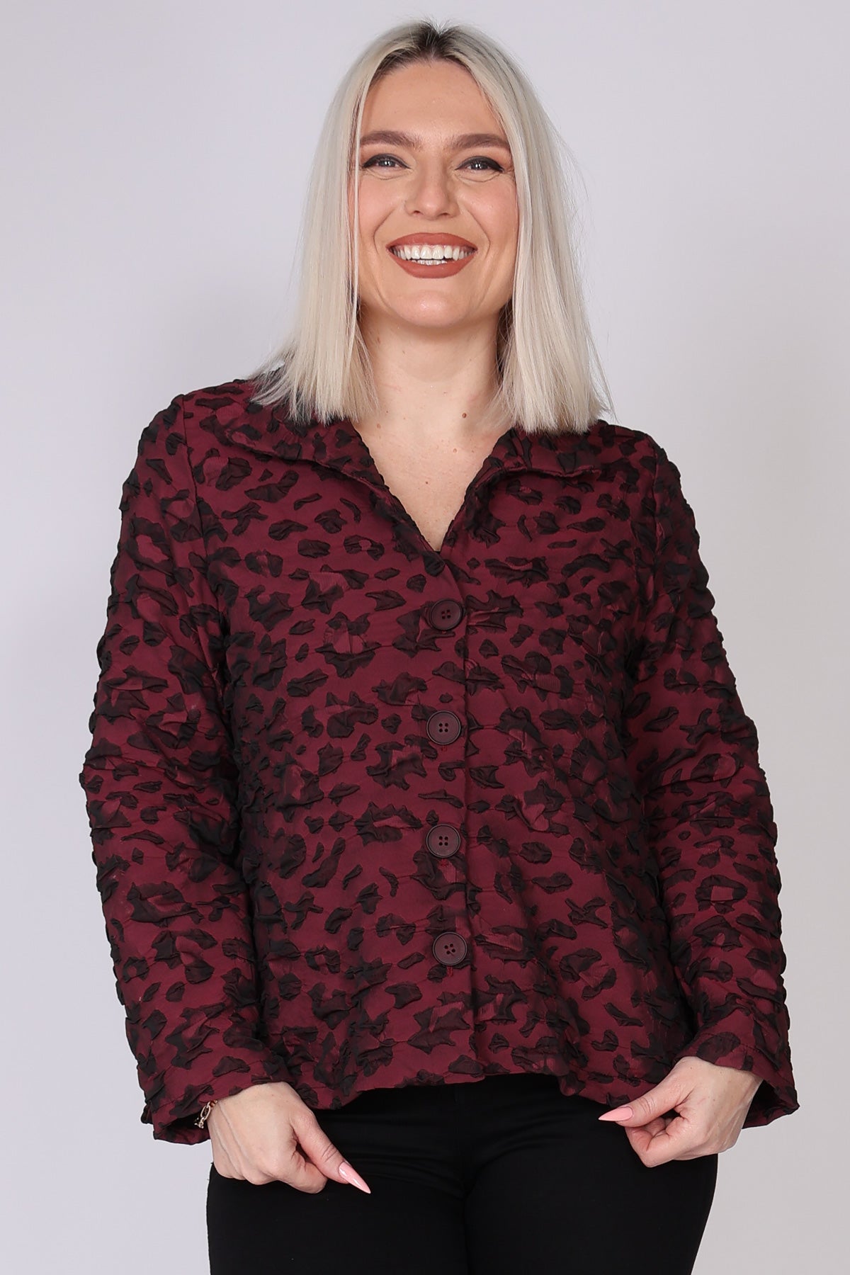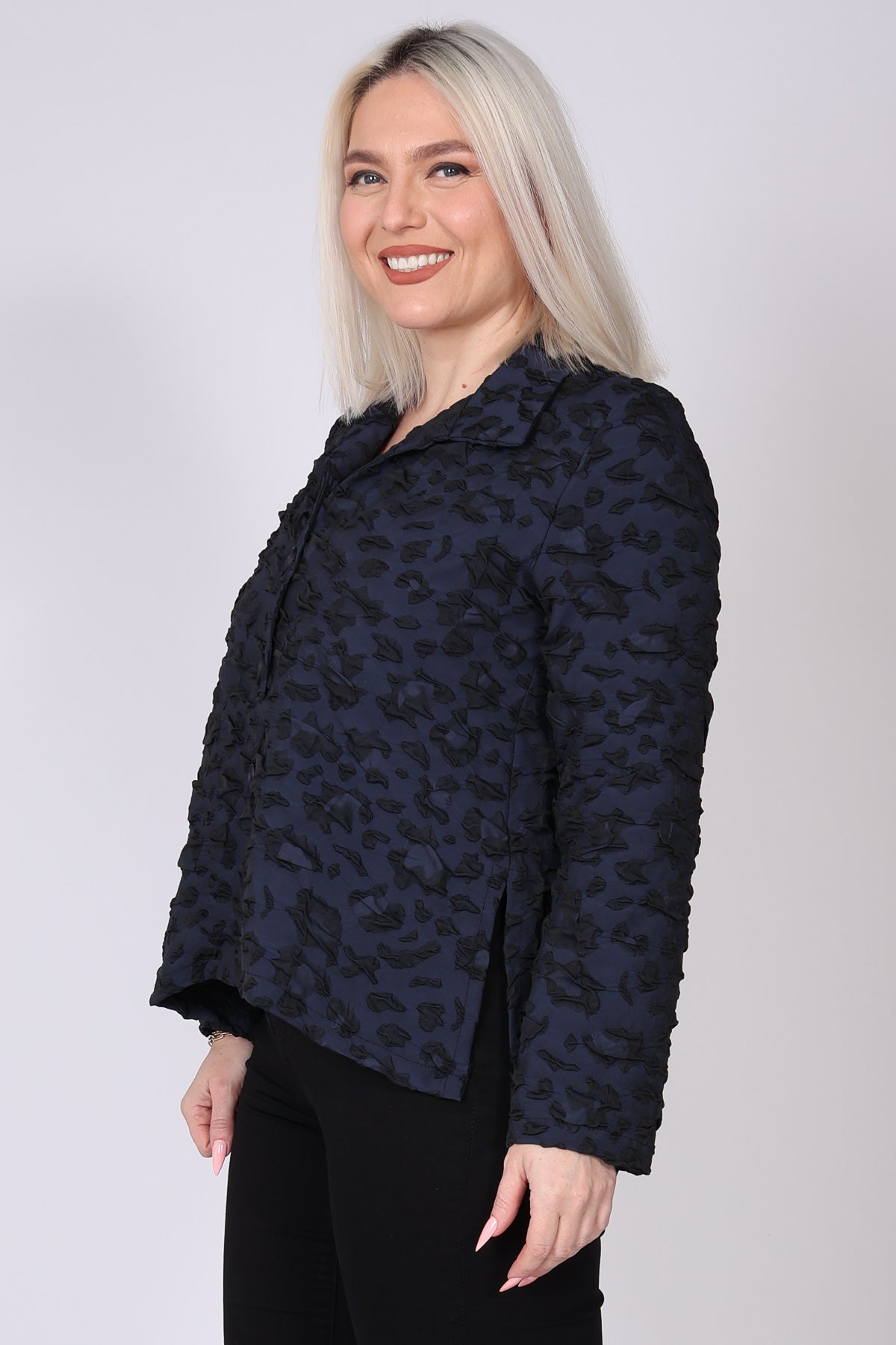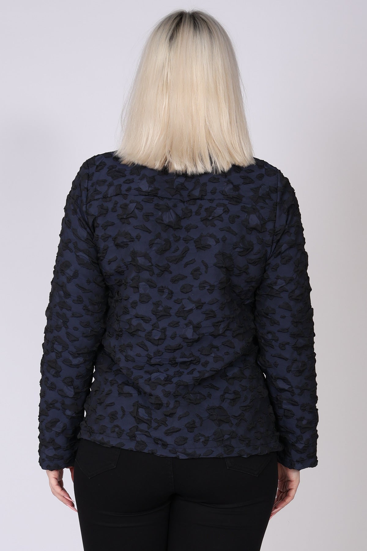 ג'קט מנומר מבד אריג במראה מקומט, עם שרוולים ארוכים וכיסים קדמיים. גזרת הכתפיים והסגירה יוצרים מראה מחויט אך קליל, שמתאים לשילוב עם לוק יום-יומי או לסטייל ערב אלגנטי.