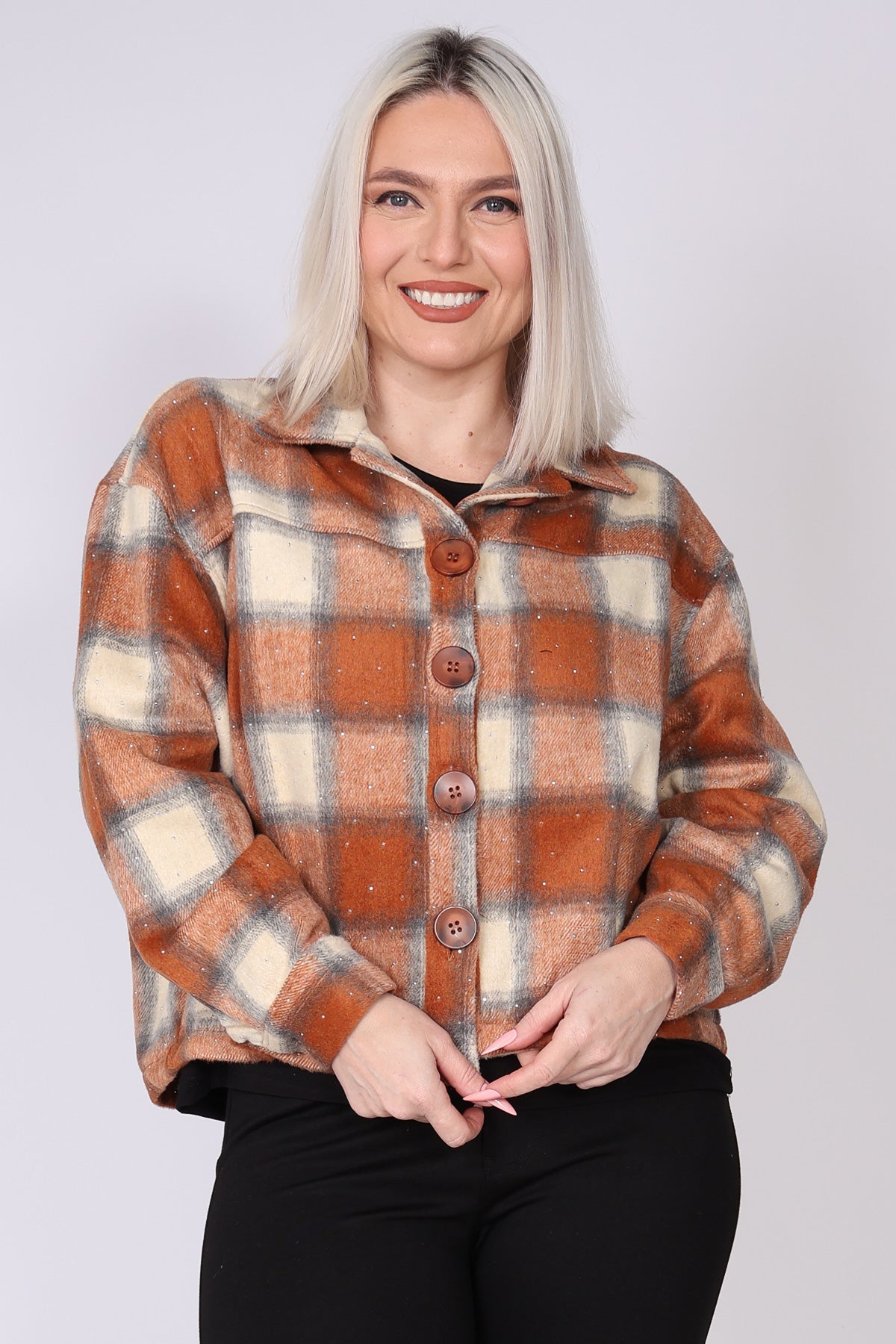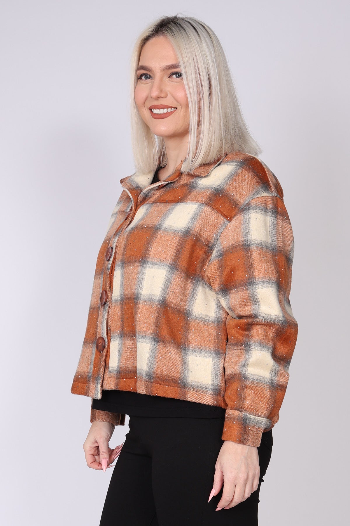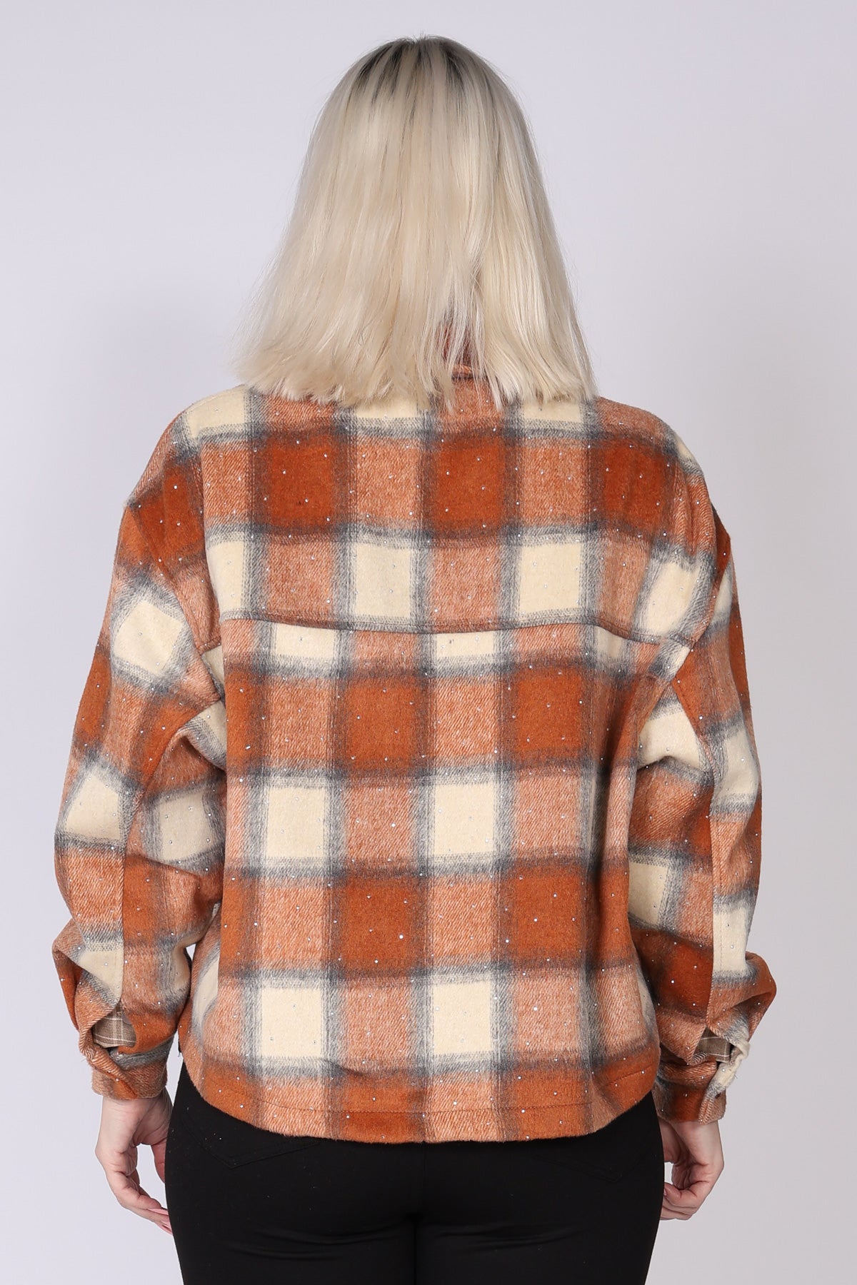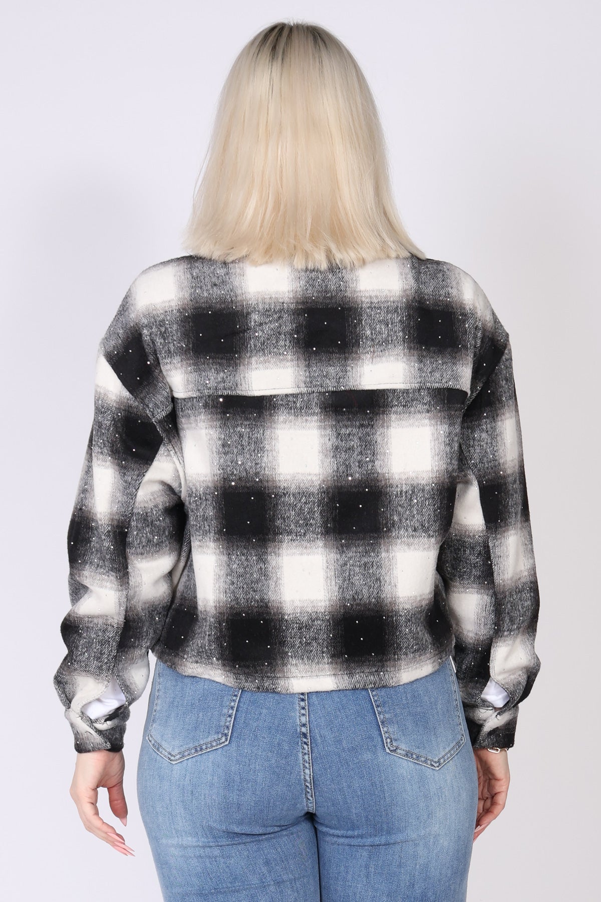 ג’קט משבצות בעיצוב מוקפד, עם עיטור אבנים קטנות. הגזרה קצרה במותן ומדגישה את המותניים, וסגירת הכפתורים יוצרת מראה מסודר ונקי עם תחושה אלגנטית ועדכנית. בד המשבצות מעניק נוכחות יוקרתית שמתאימה גם לכל לוק